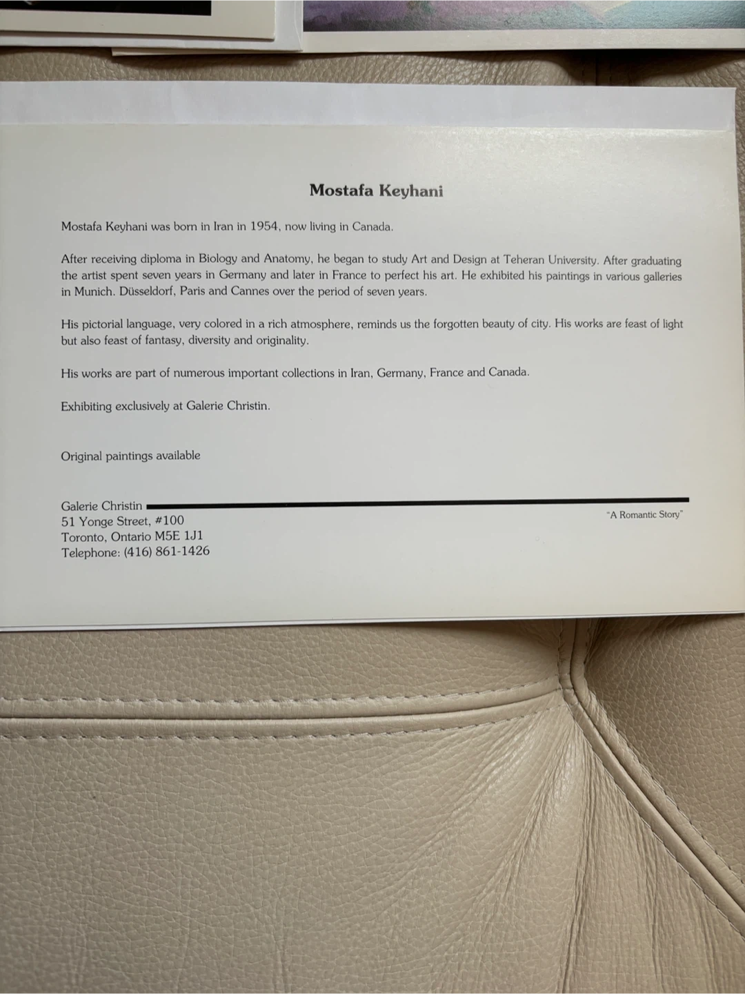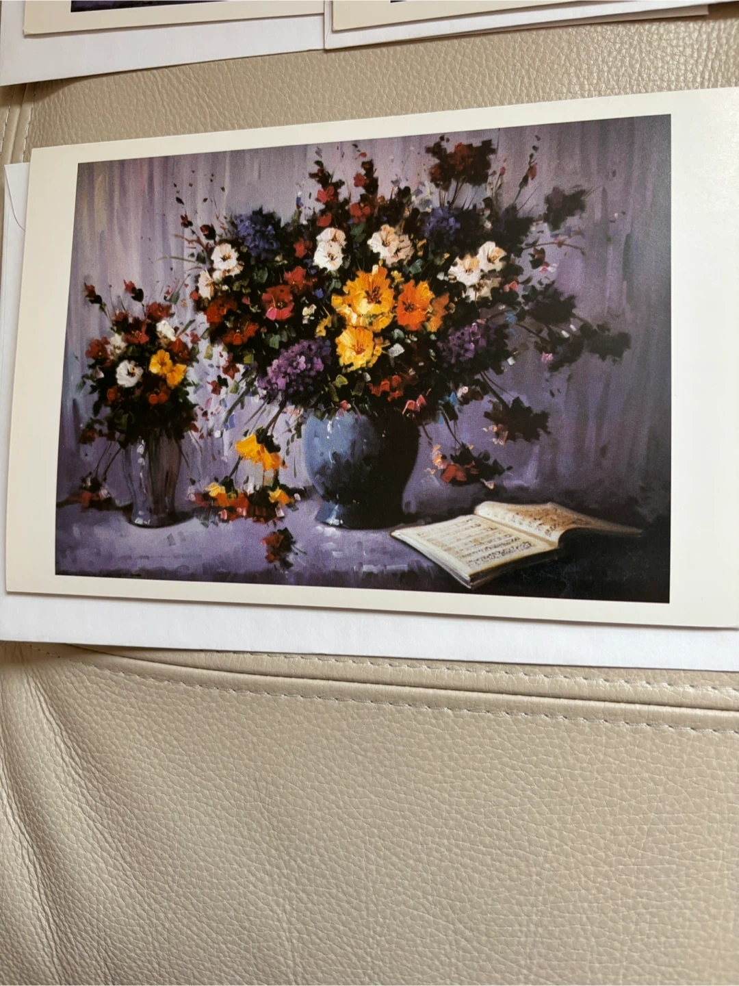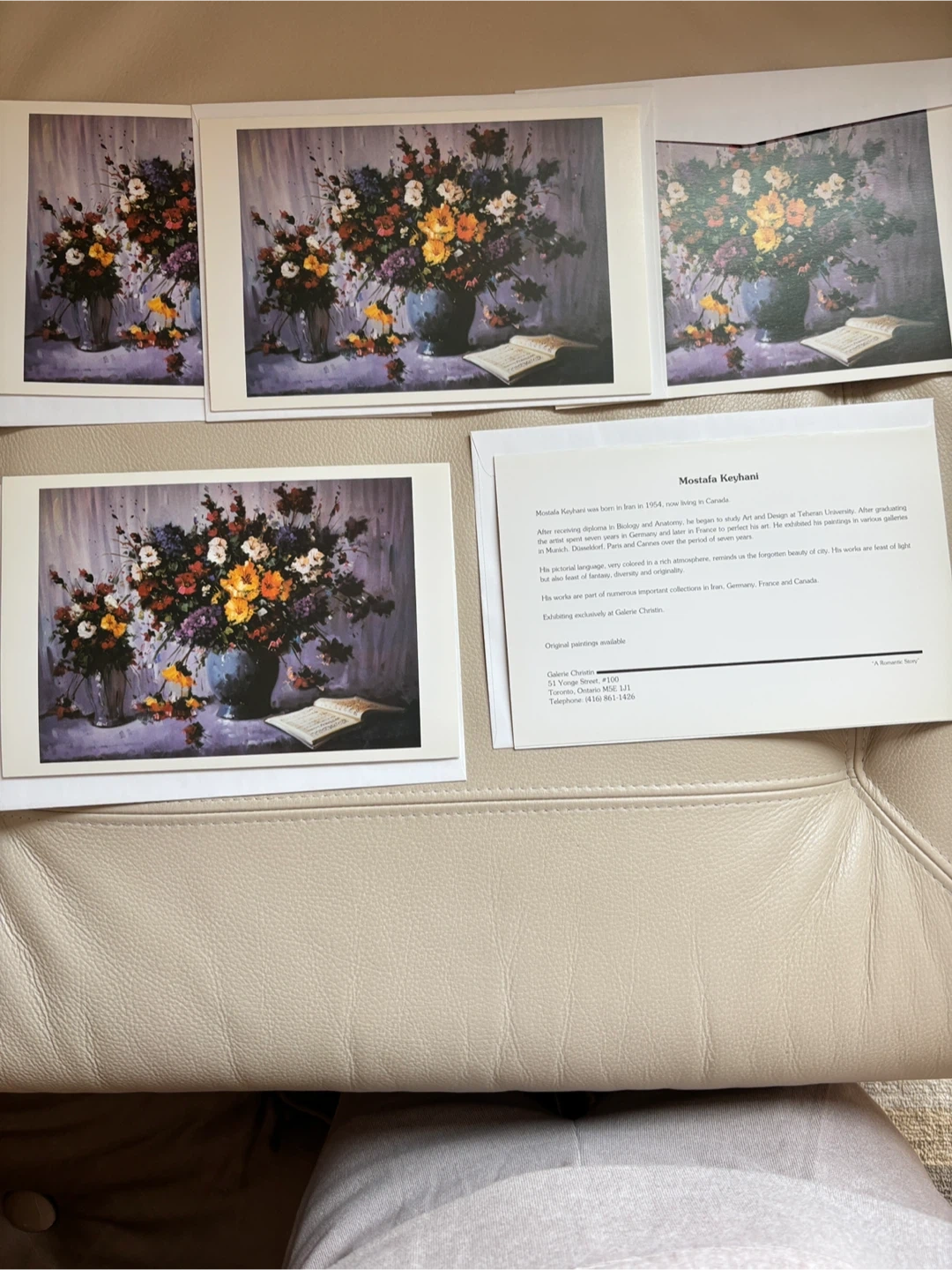 These are 5 art cards featuring a floral painting by Mostafa Keyhani. The print showcases a vibrant bouquet in a vase with musical notes. Cards include information about the artist's background and career. They're perfect for sending to art lovers or framing yourself! Measures 6 x 9 inches.