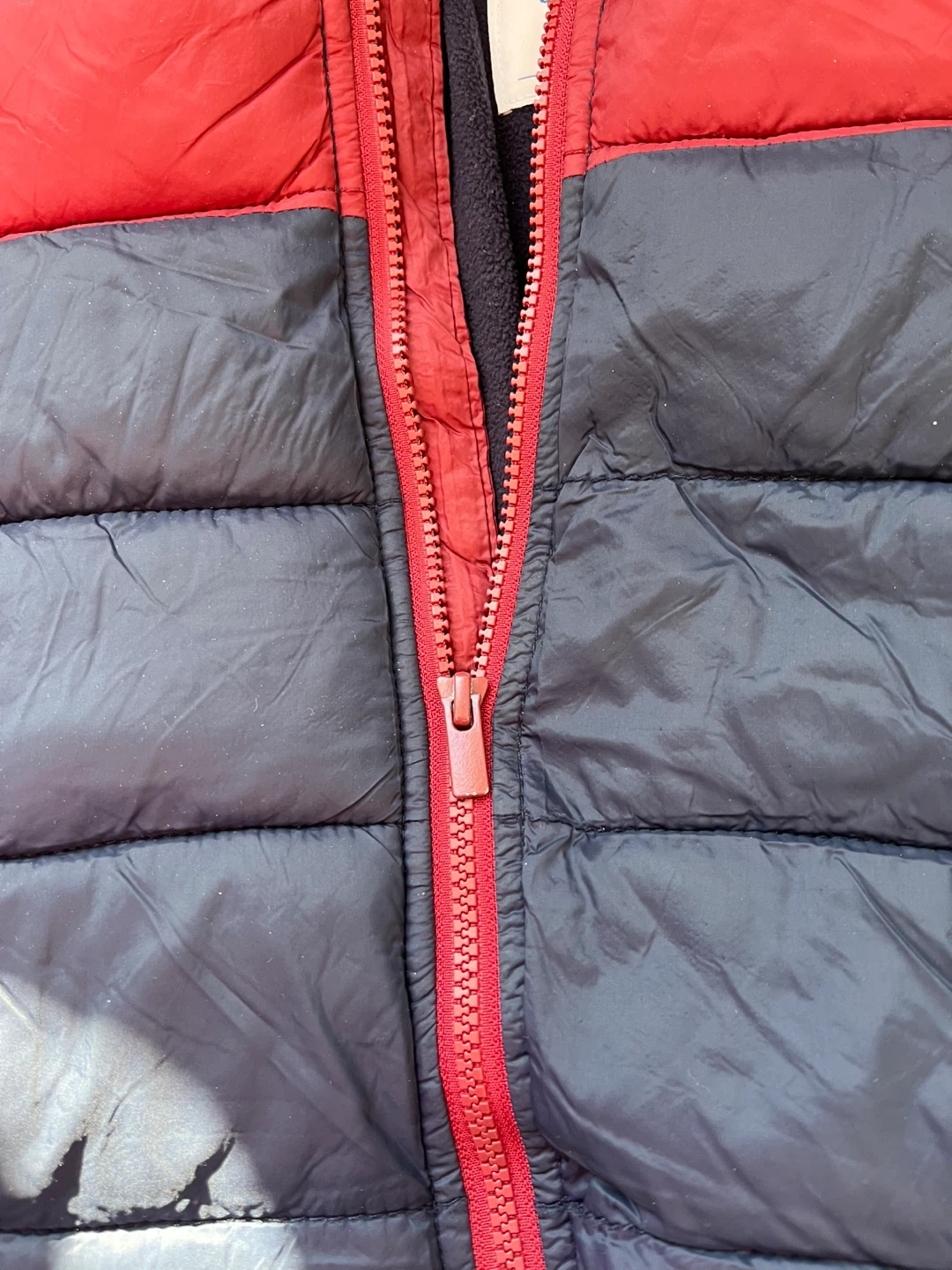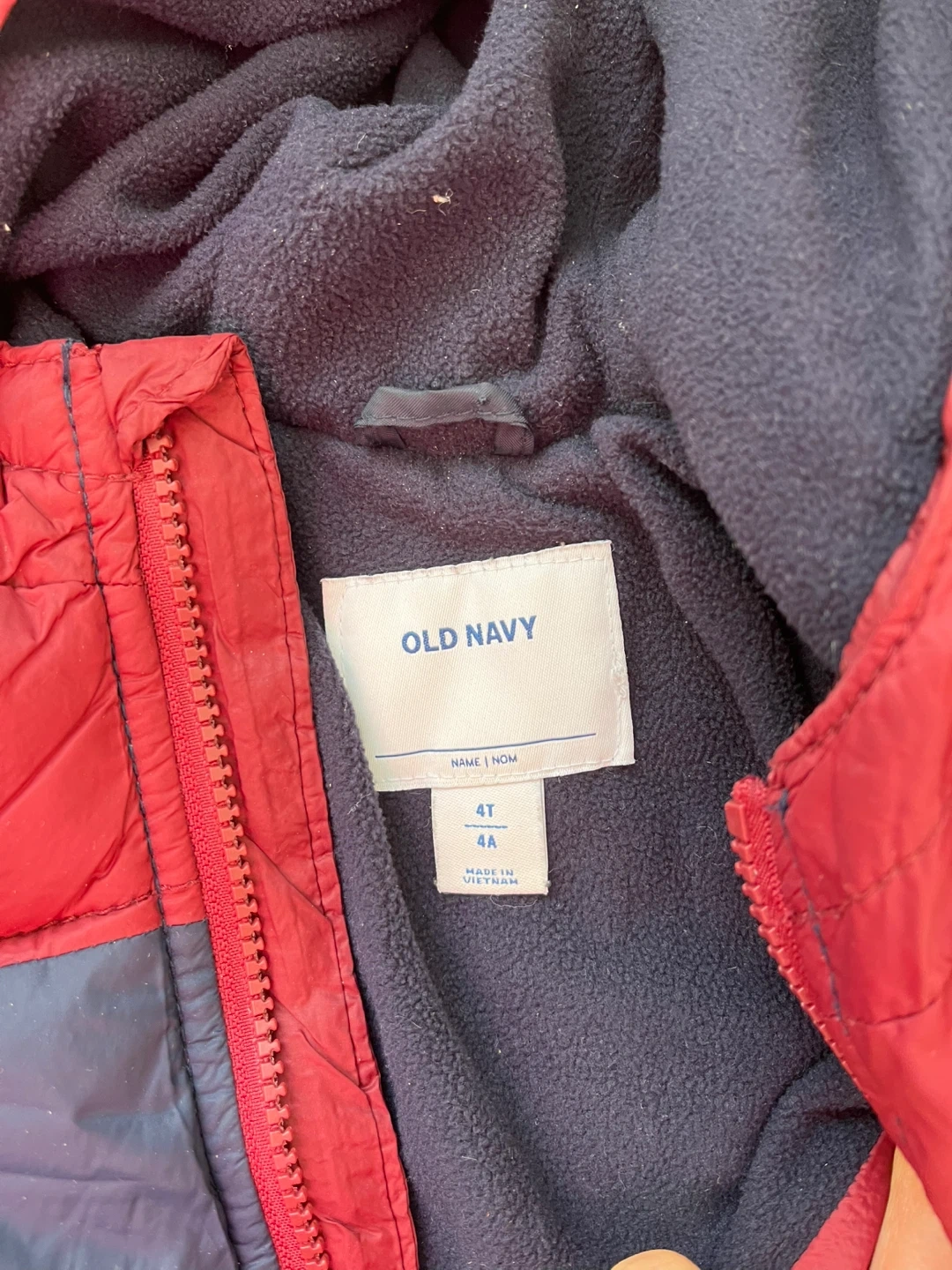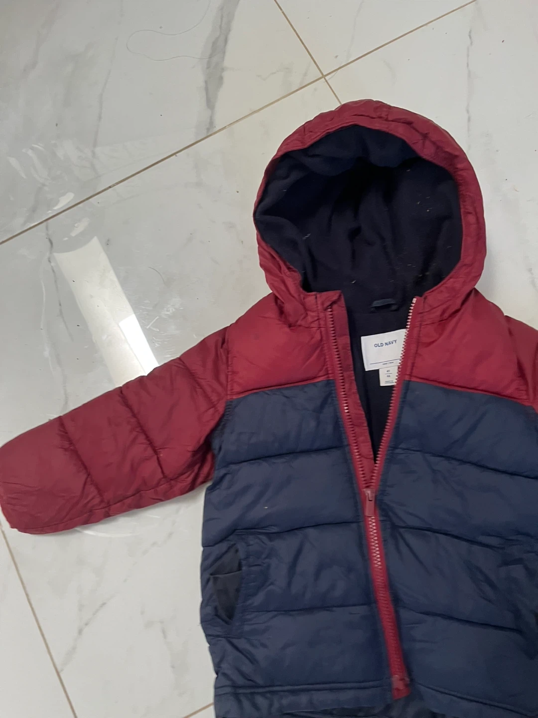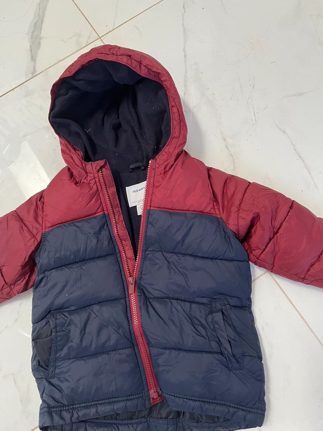 This Old Navy puffer jacket is a great choice for keeping little ones warm. It's a two-tone design with red and navy blue panels. The hood is lined with fleece for extra coziness. Ideal for chilly days and outdoor play!