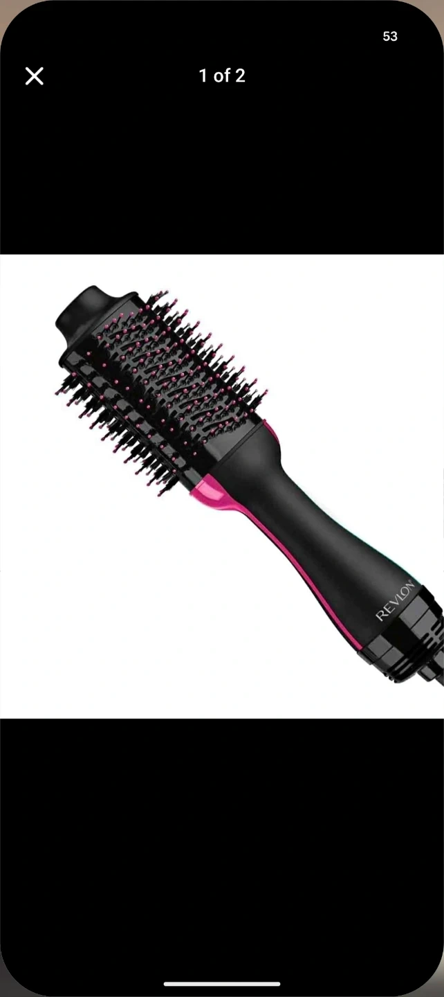 This is a Revlon One-Step Hair Dryer and Volumizer. It's a black and pink styling tool. It dries and styles hair in one step.