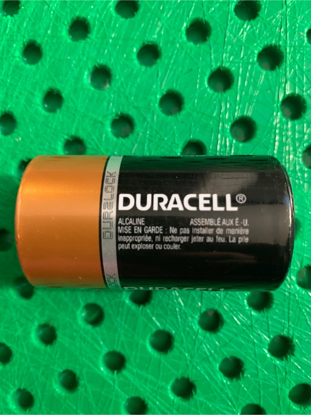 This is a Duracell alkaline battery. It's assembled in the USA. Do not install incorrectly, recharge, or dispose of in fire.