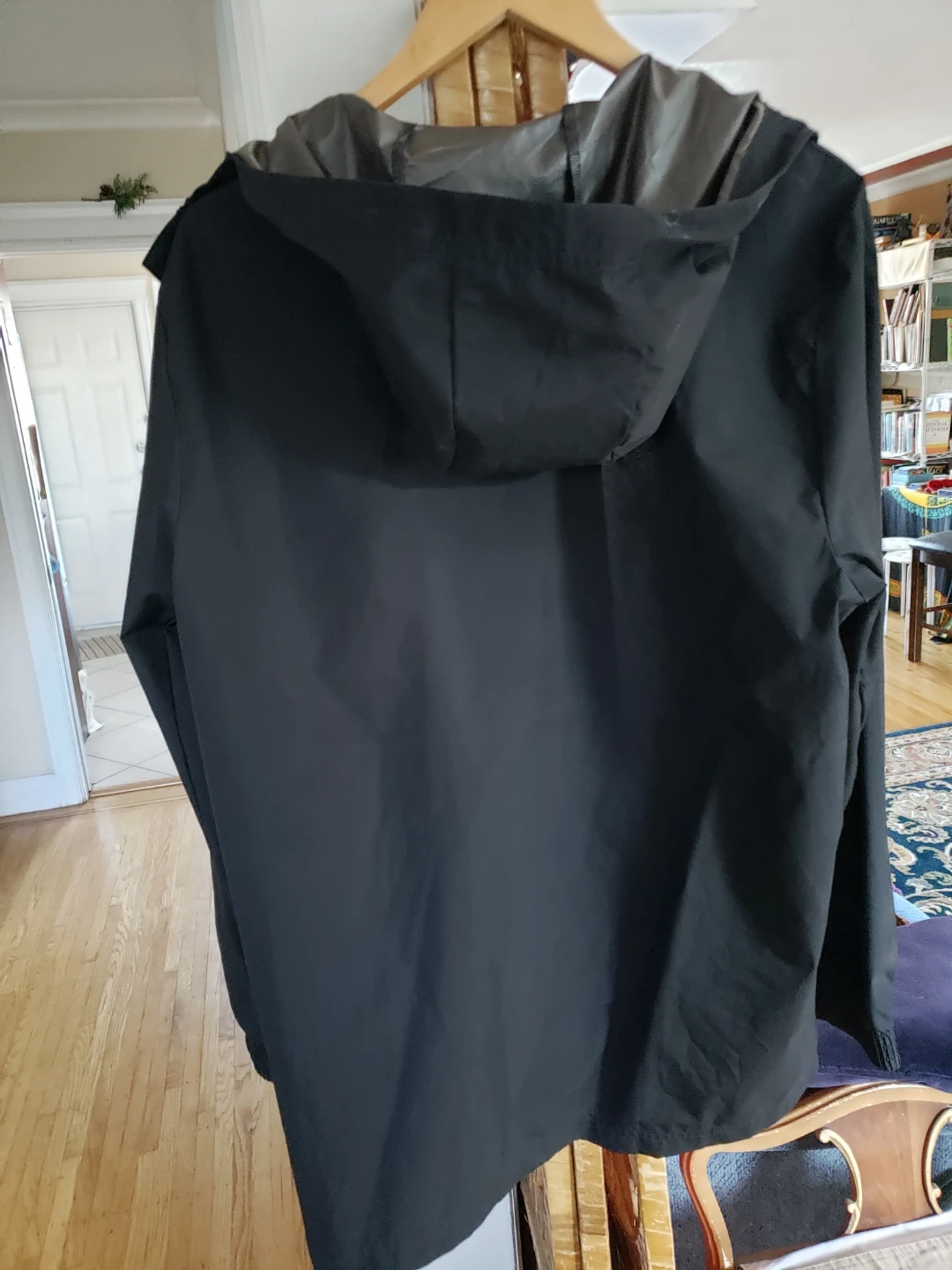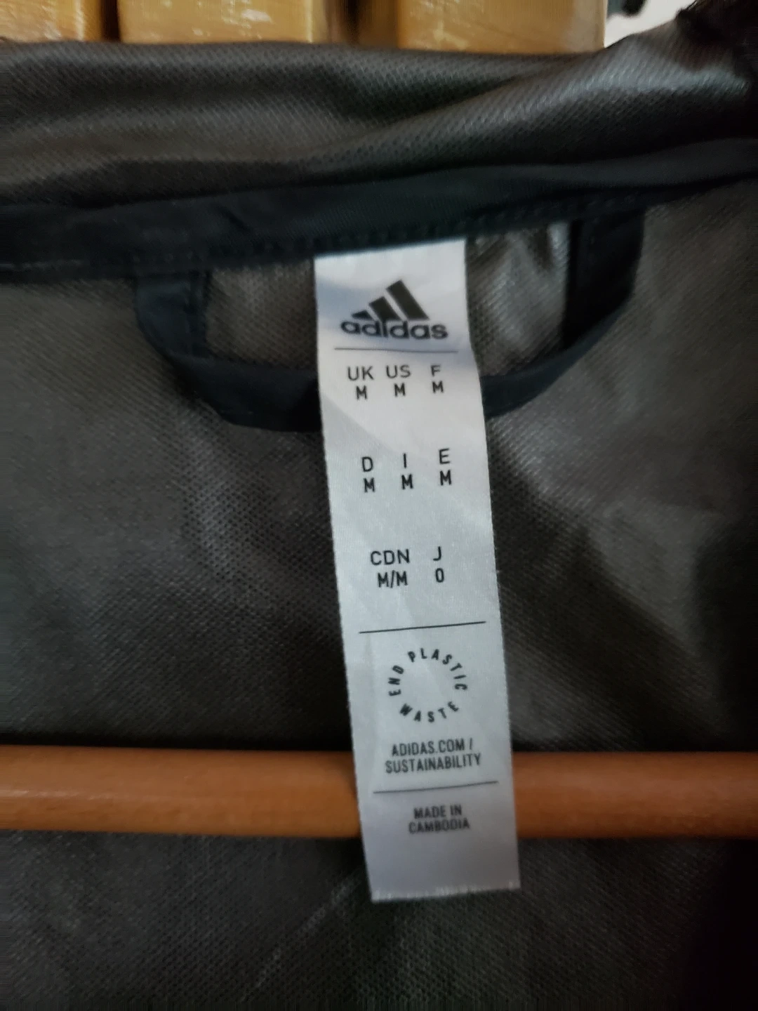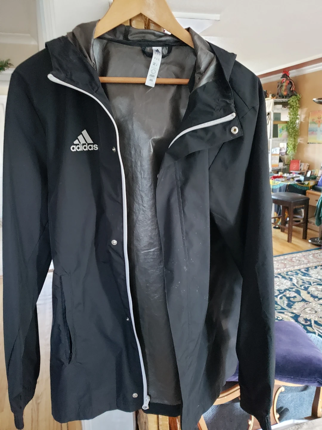 This is an Adidas black hooded jacket. It's a size medium, suitable for everyday wear. It's made of durable material and features a full zip closure with snap buttons. The hood is adjustable for a snugger fit.