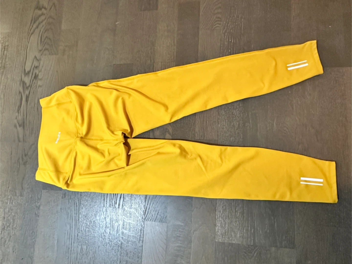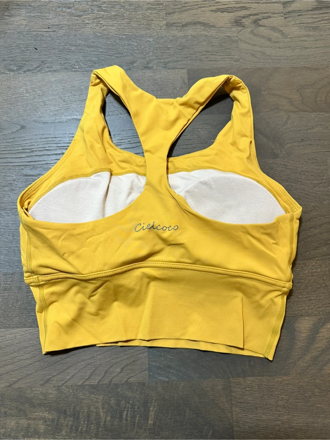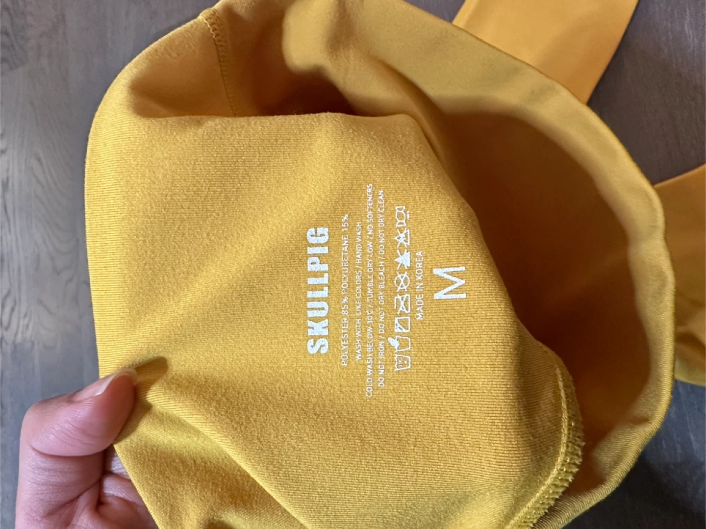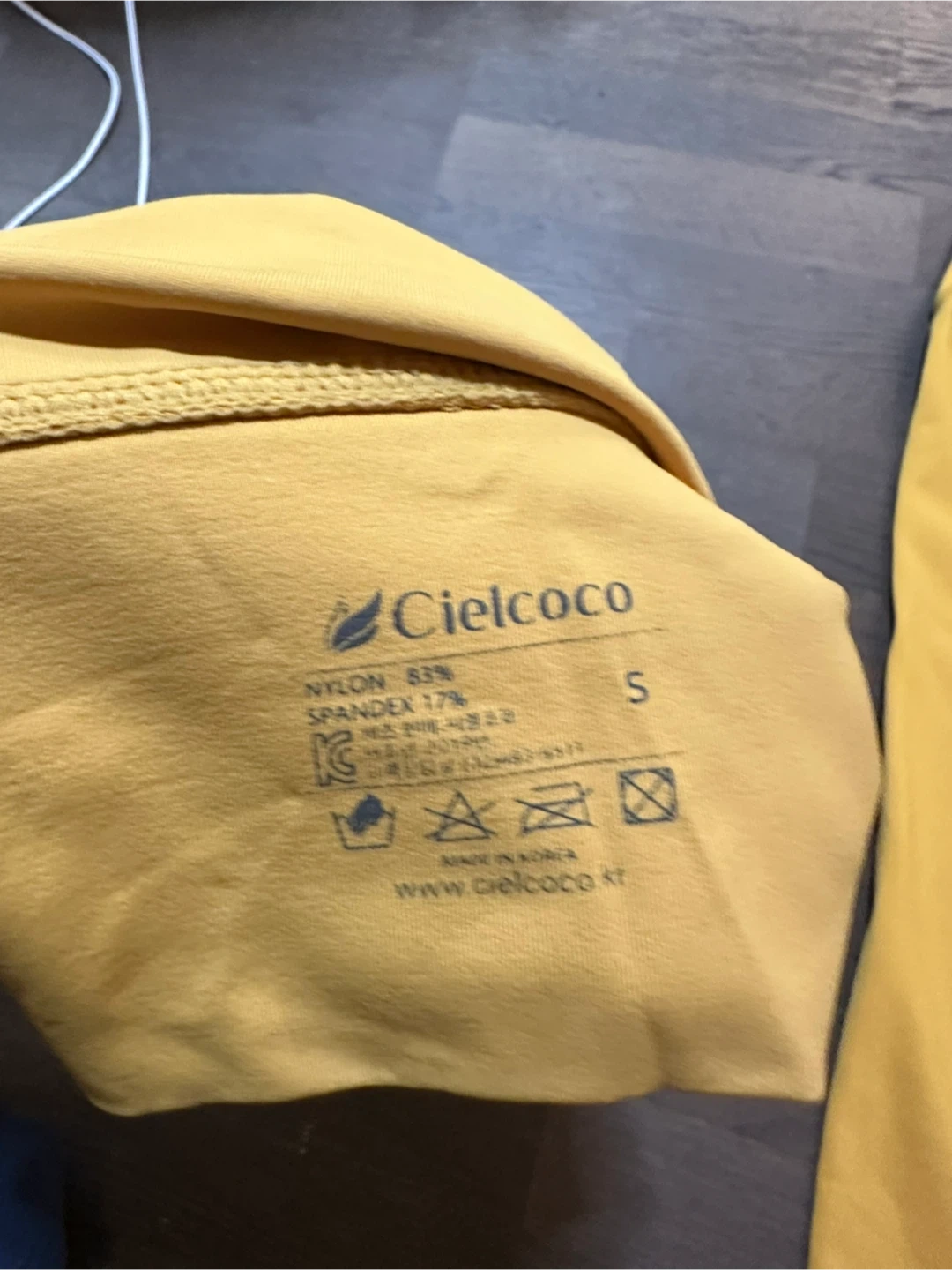 This Cielcoco set includes a sports bra and leggings in a vibrant yellow color. The leggings are size M, made from 83% Nylon and 17% Spandex. The sports bra is also size S and made from 85% Polyester and 15% Polyurethane. Both items are made in Korea. They're great for athletic activities!