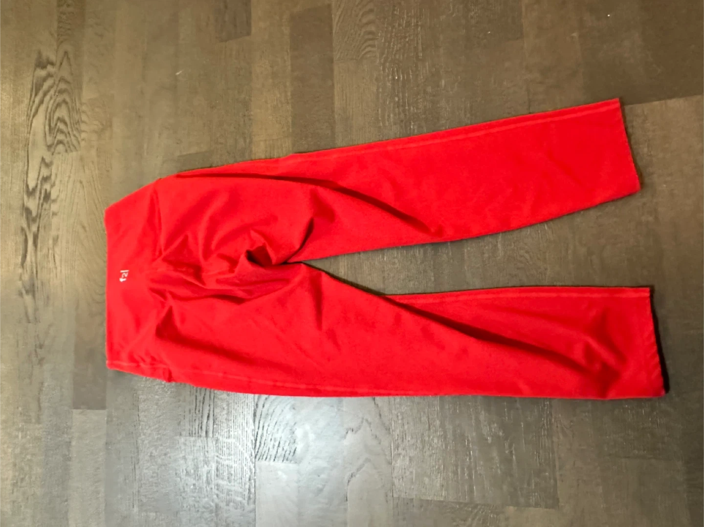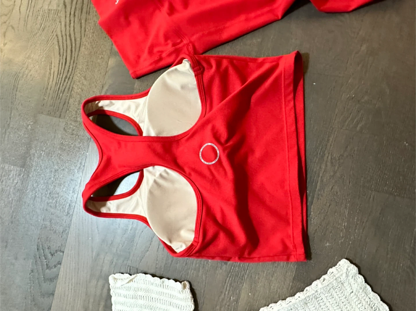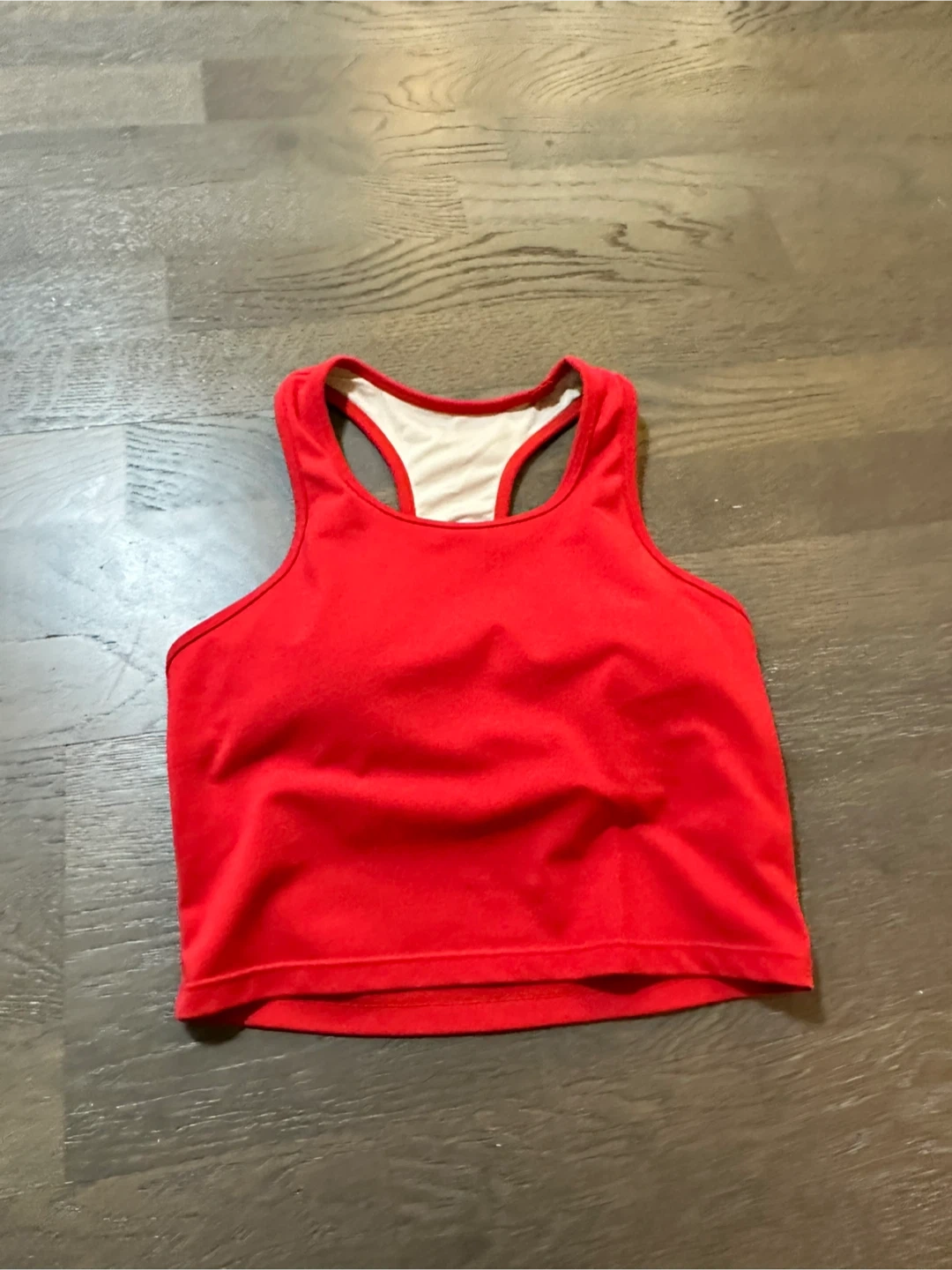 Red athletic tank top with built-in bra and matching red leggings. The tank top is made of a stretchy fabric. The leggings are also made of a stretchy material. This set is perfect for workouts or active wear!
