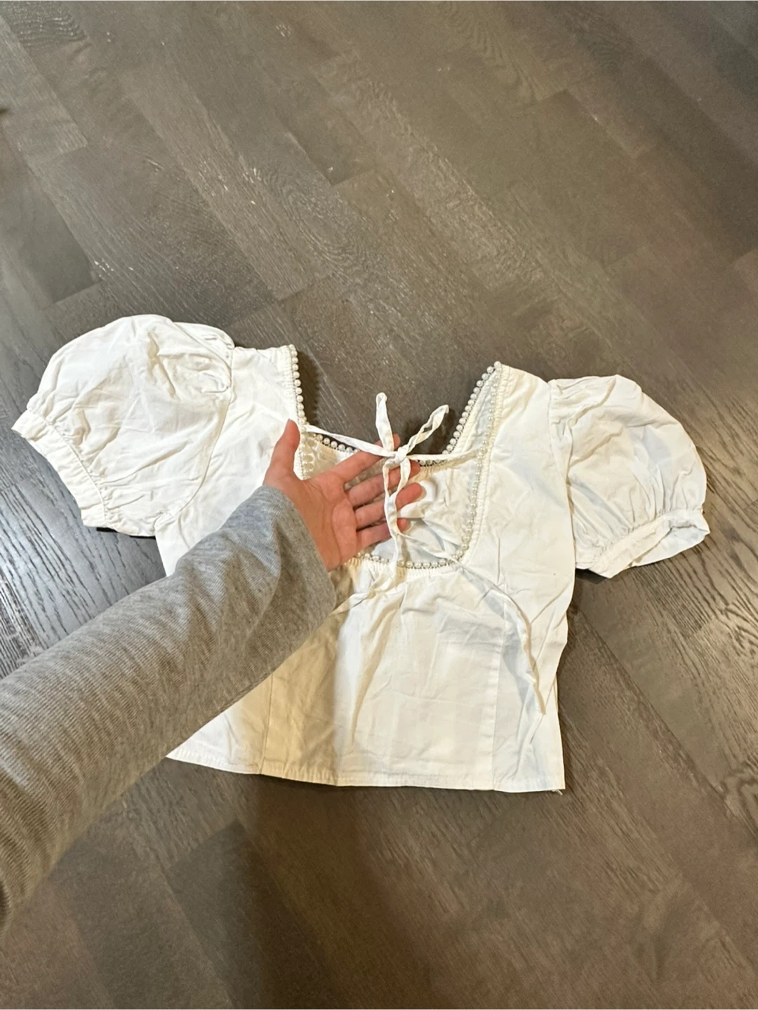 A charming white puff sleeve blouse with a square neckline and a tie-back closure. It's made from a cotton blend fabric with delicate beaded trim. This top offers a vintage-inspired silhouette.