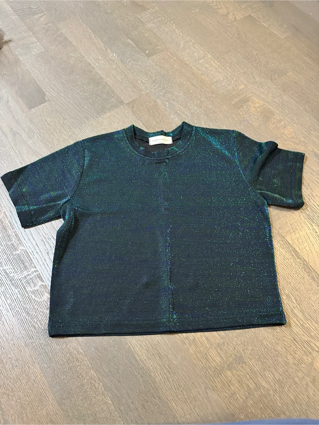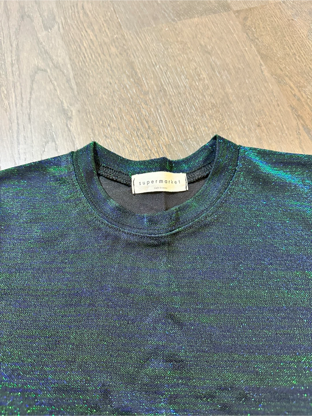 This Supermarket cropped top has a dazzling iridescent finish that shifts between green and blue. It's a short-sleeved crewneck style. It's made from a blend that includes lurex for shimmer. It's perfect for adding a touch of sparkle to any outfit!