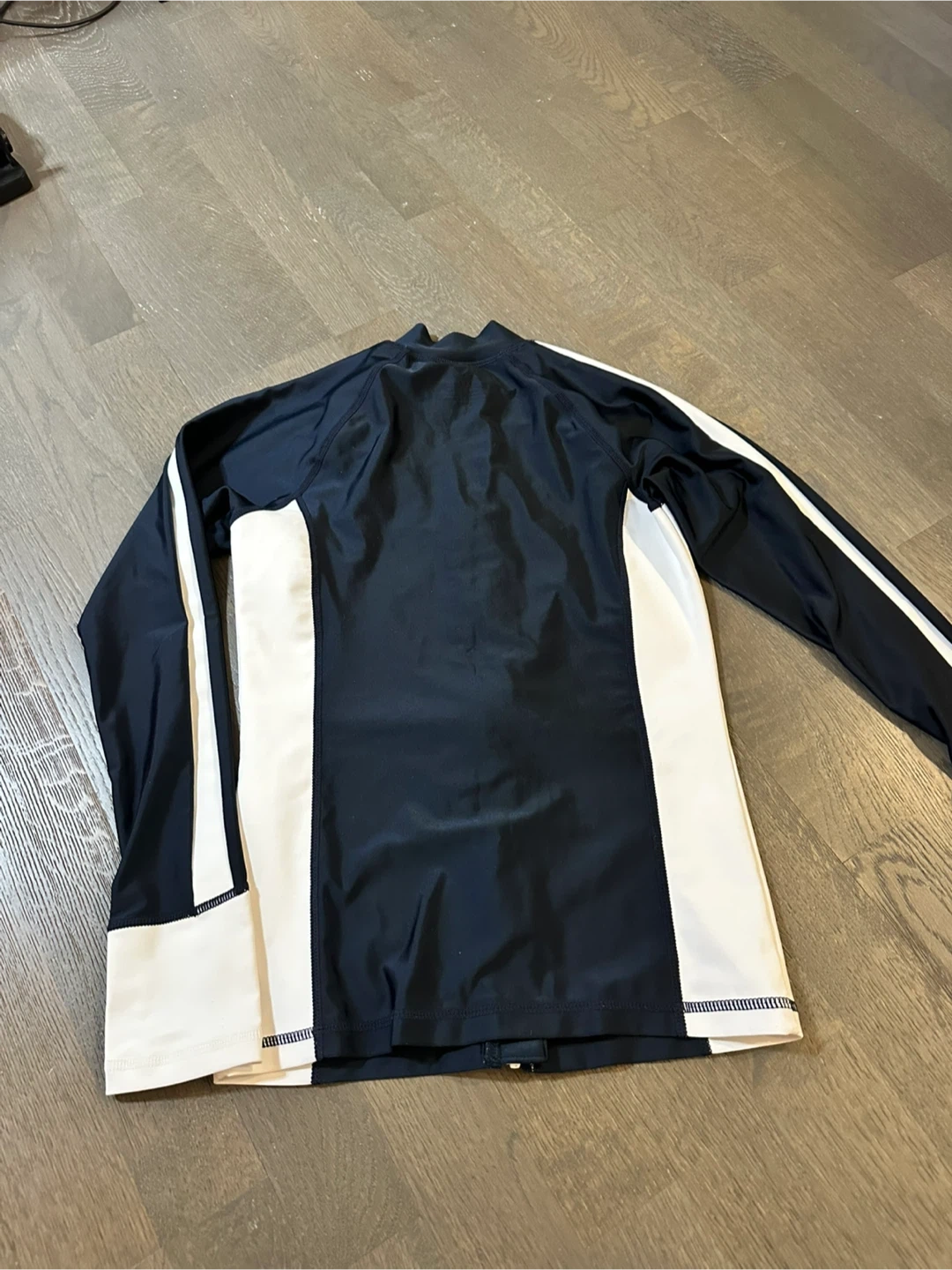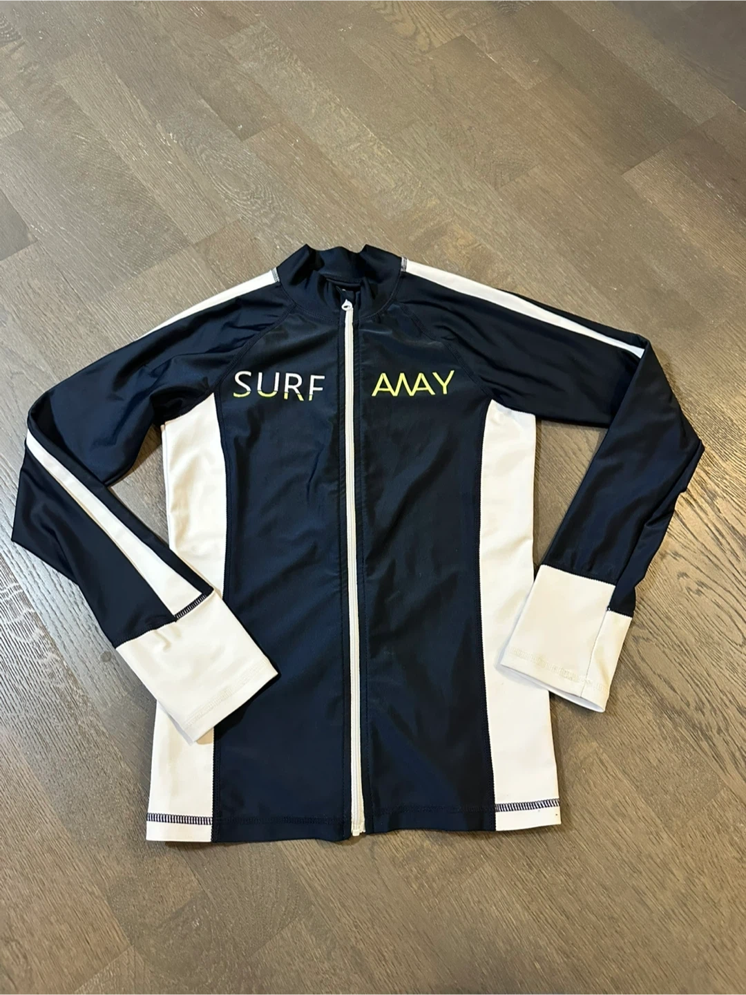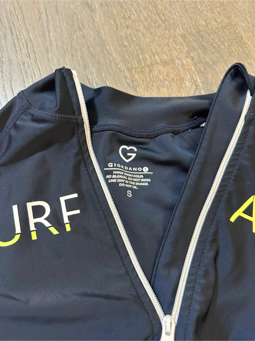 This Giordano "Surf Away" rash guard is a size S. It's black with white accents and long sleeves. It's made of a quick-drying material suitable for water activities. This rash guard is great for sun protection during outdoor water sports!