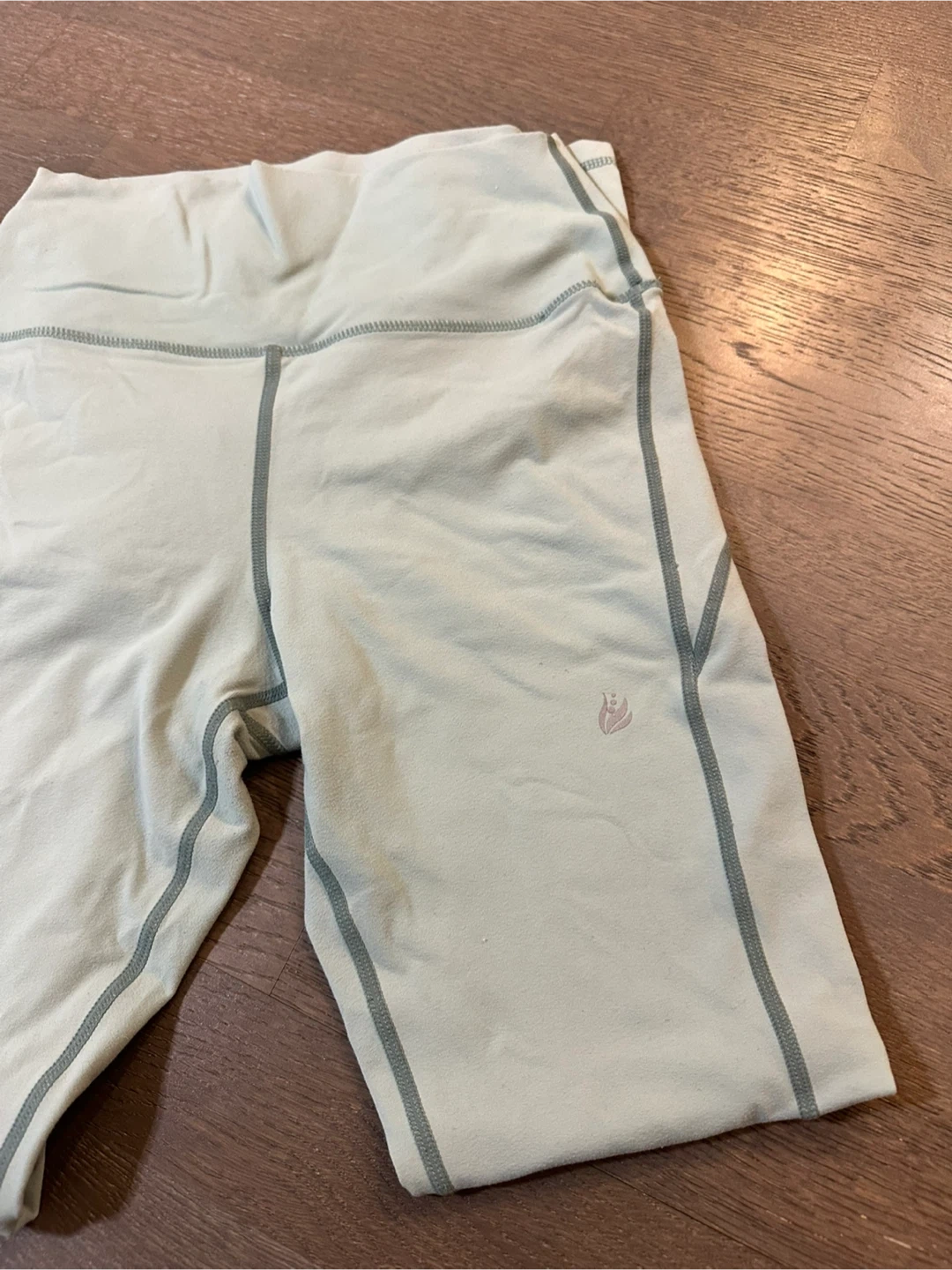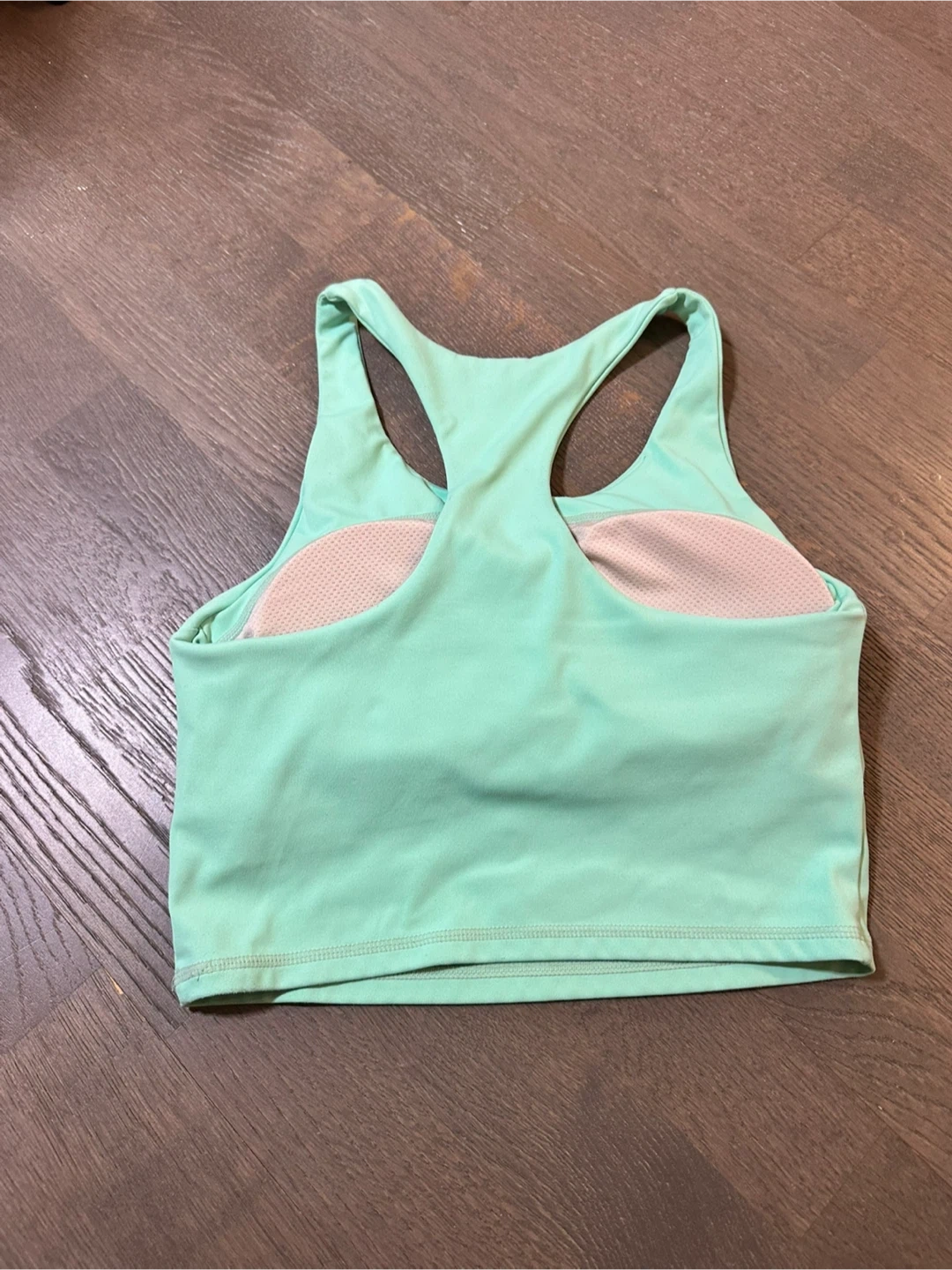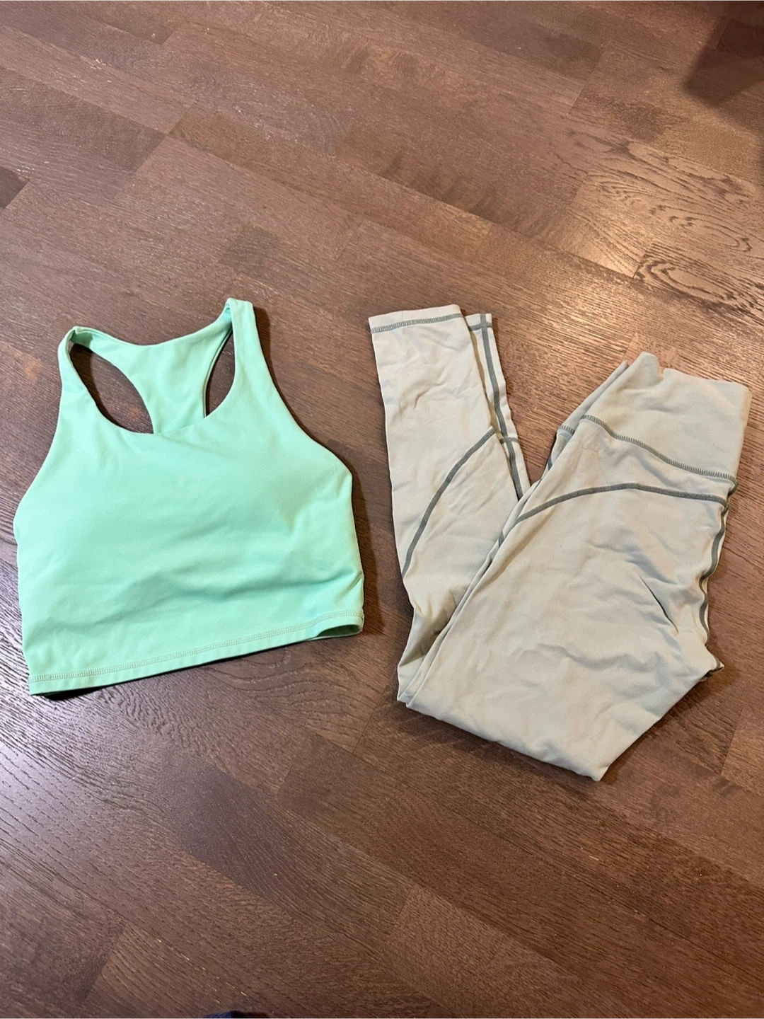 This athletic set includes a mint green sports bra with a racerback design and a matching pair of light green leggings. Both pieces are made from a stretchy, comfortable fabric, suitable for workouts. Leggings feature subtle seam detailing and a small logo.