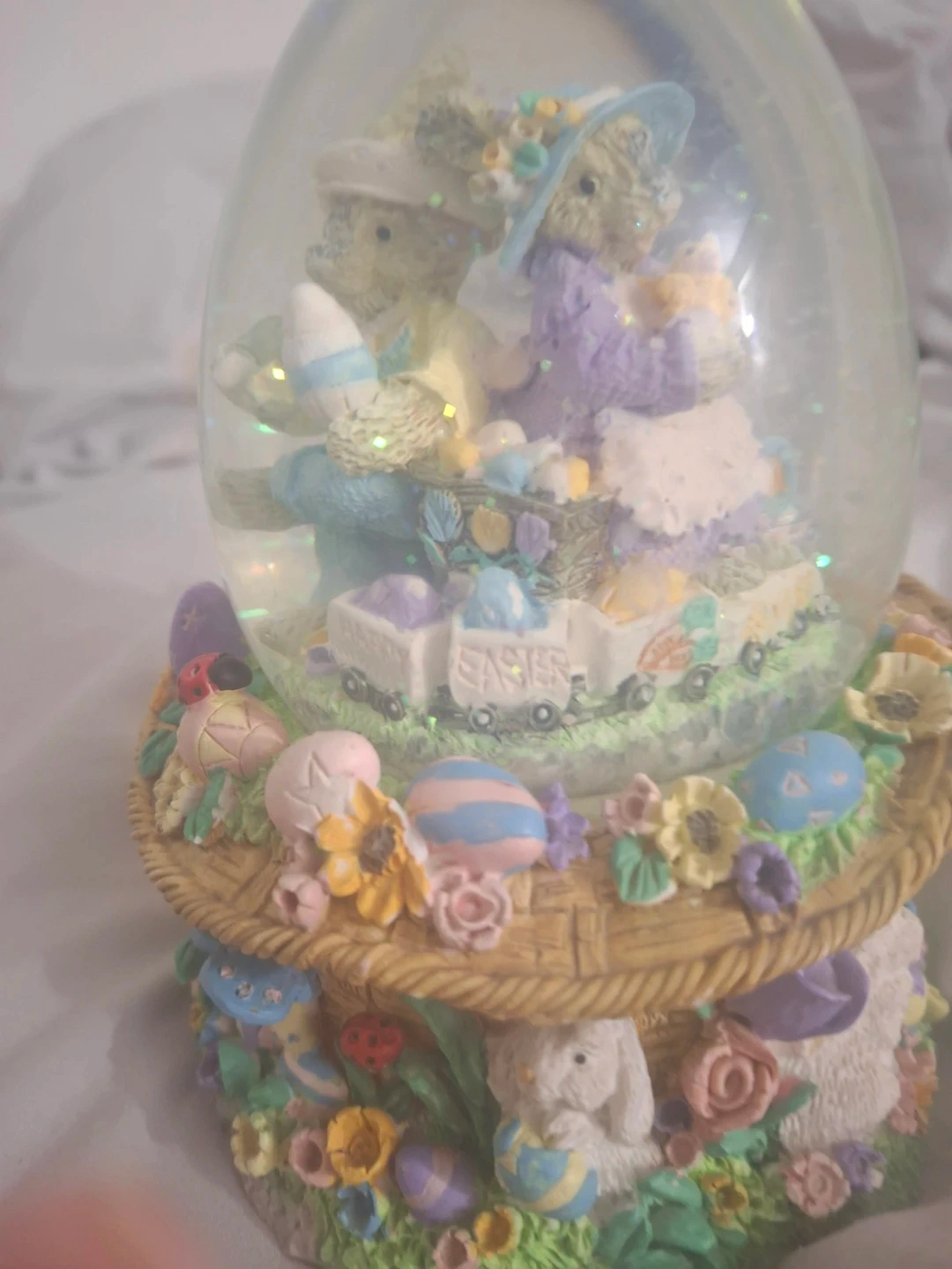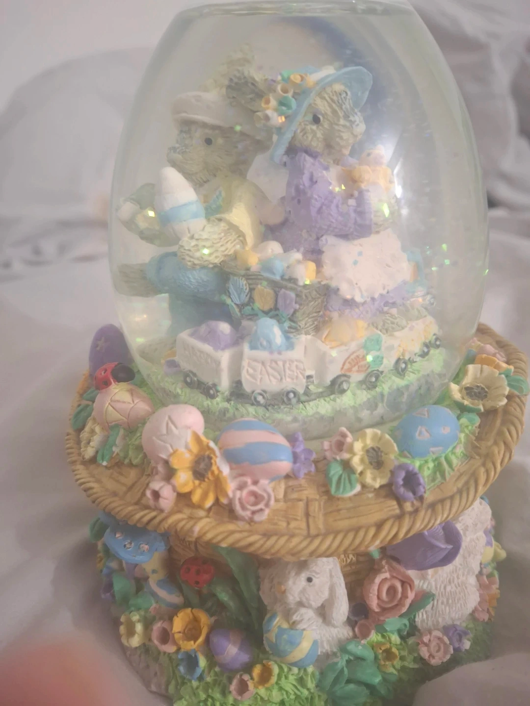 This cute Easter snow globe features a bunny couple with a train car. It's decorated with flowers, eggs, and a ladybug. It's a sweet addition to your spring decor!