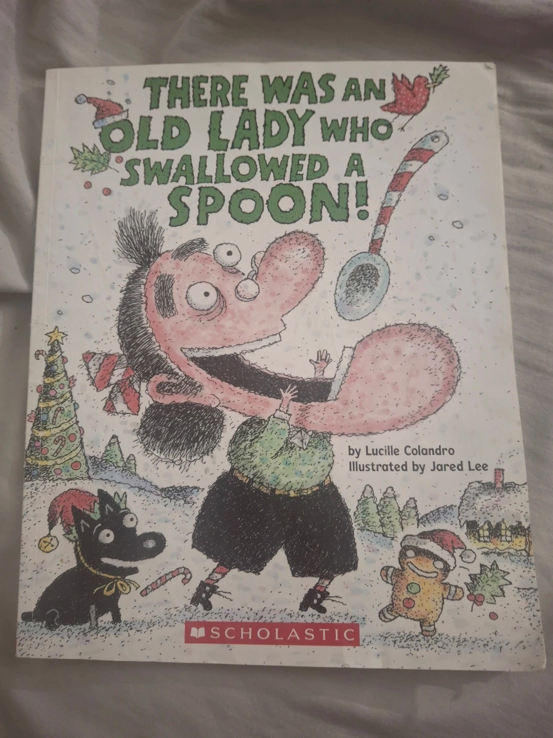 It's the fun children's book 'There Was an Old Lady Who Swallowed a Spoon!' by Lucille Colandro, illustrated by Jared Lee. This Scholastic book is sure to be a holiday hit with kids. It's a great read for young ones during the festive season!
