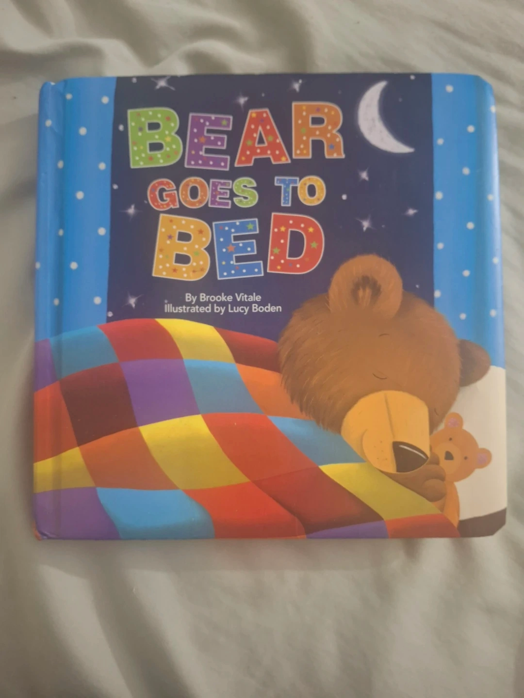 Bear Goes to Bed is a sweet storybook for young children. It's written by Brooke Vitale and illustrated by Lucy Boden. Board book format.