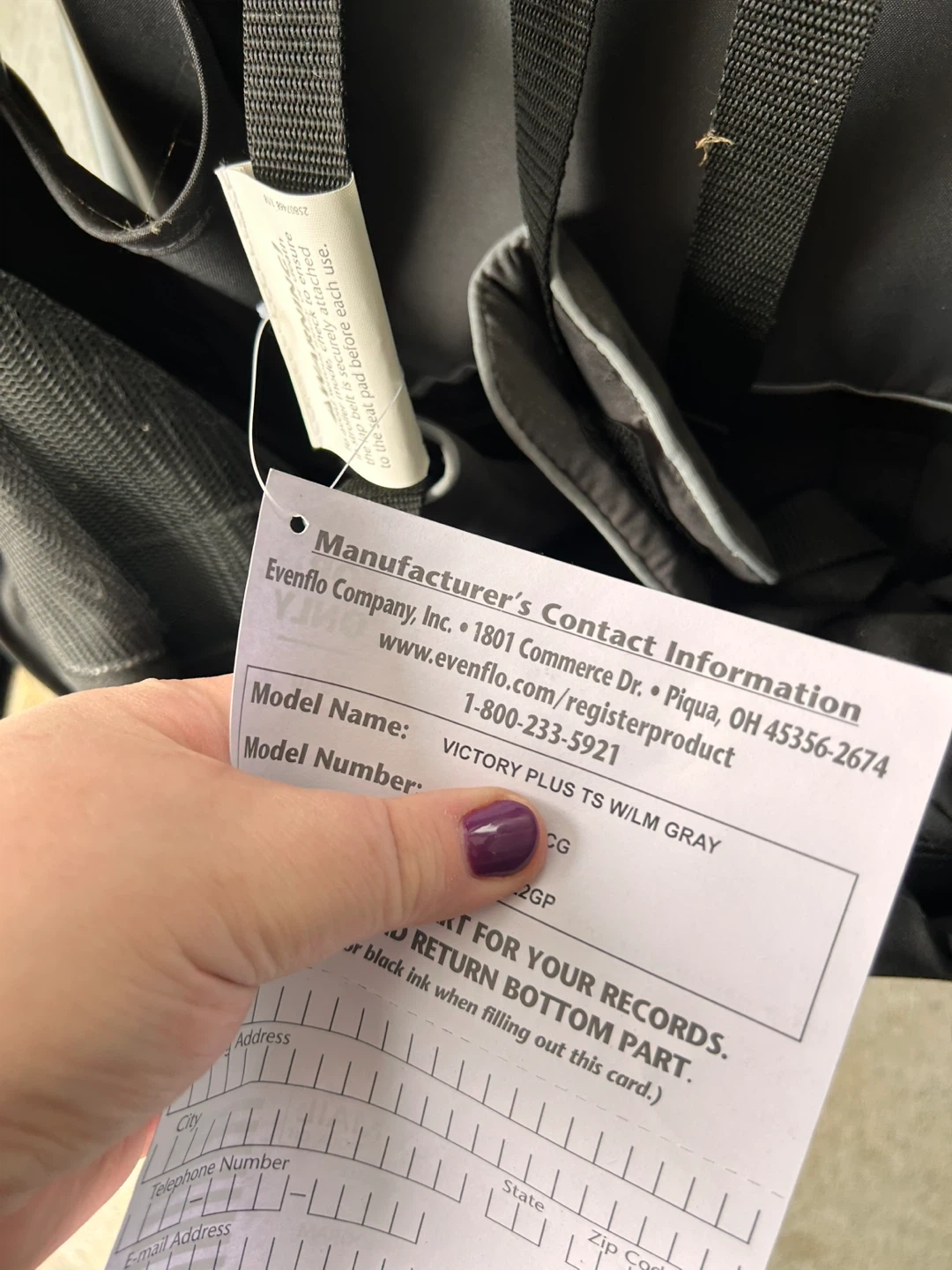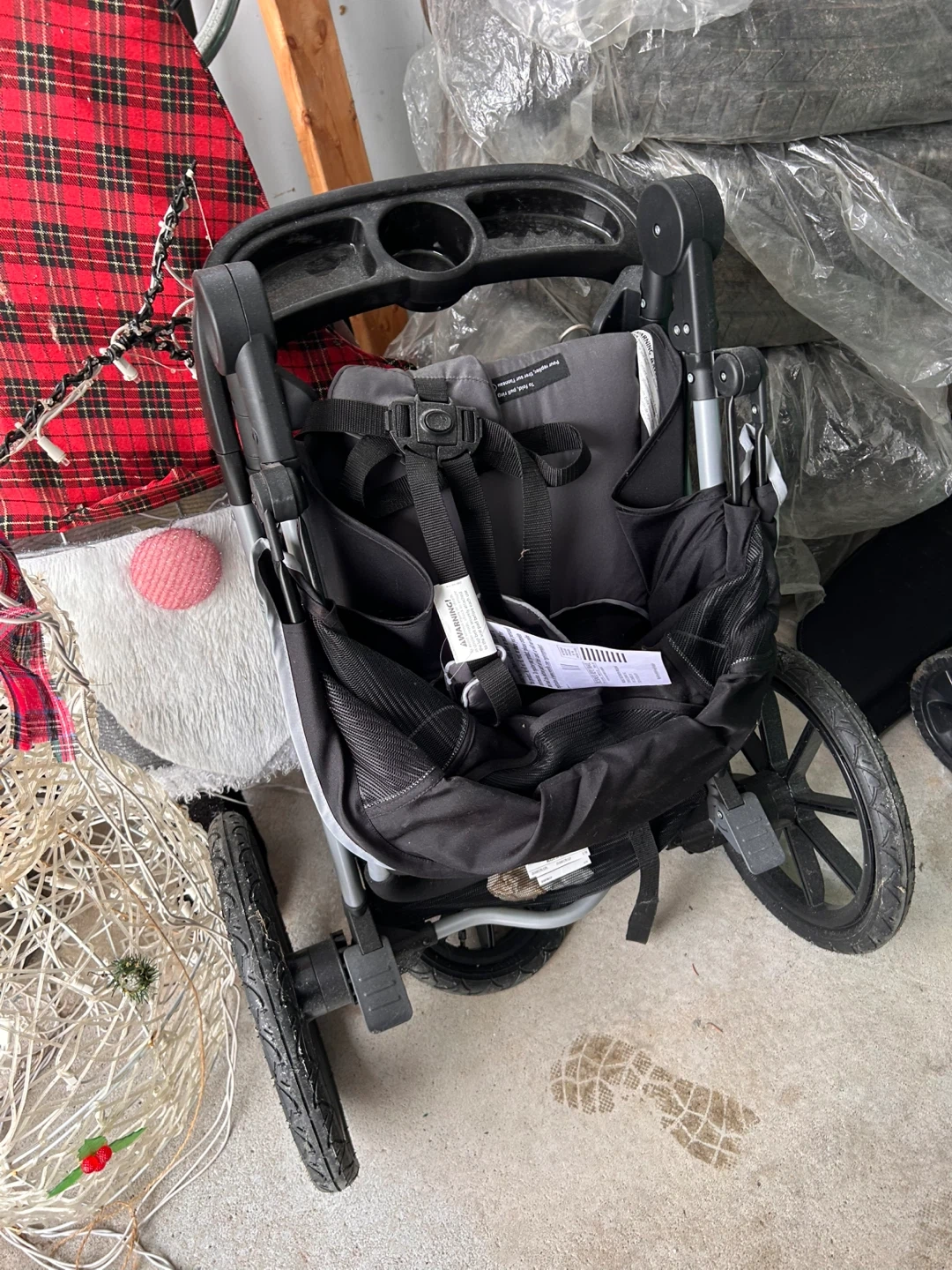 This is an Evenflo Victory Plus TS stroller in gray. It has a five-point harness and multiple storage pockets. The stroller is designed for easy manoeuvring with large wheels.