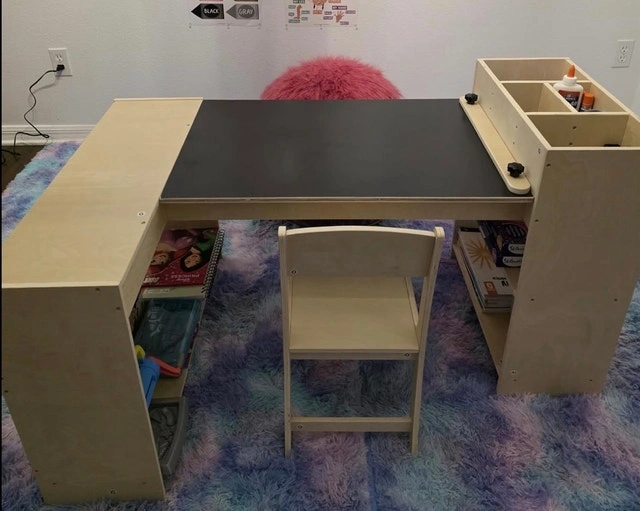This kids activity desk is perfect for any child's playroom or bedroom, designed with a durable chalkboard surface and built-in storage. While it's been used, it is in good condition and ready for a new artist. The desk includes handy shelving for art supplies and a comfortable chair for long creative sessions. Key features include: Durable chalkboard top, Ample storage shelves, Child-sized chair included. I'm pricing this desk at $175. If the ad is up, the desk is available.