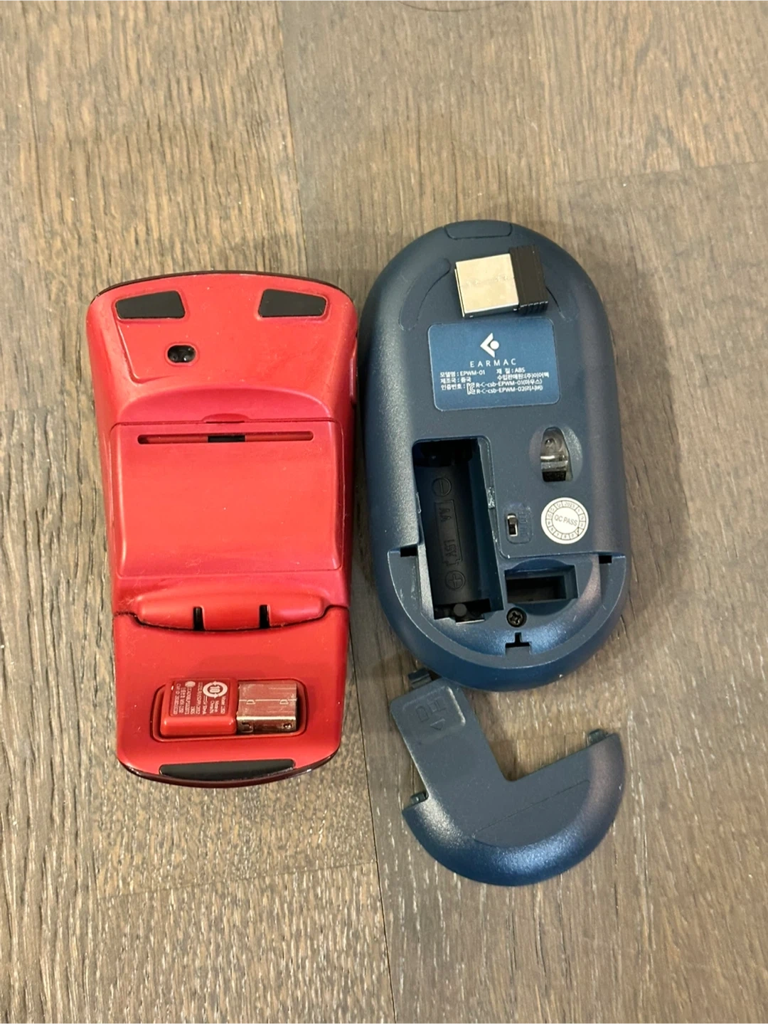Bundle of two wireless computer mice. Includes a red Microsoft mouse and a blue E-mammal mouse in "Space Blue" Pantone color. Both mice are functional and ready for use.