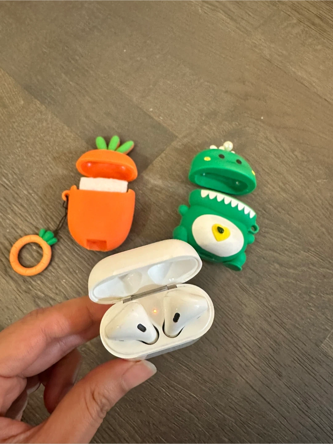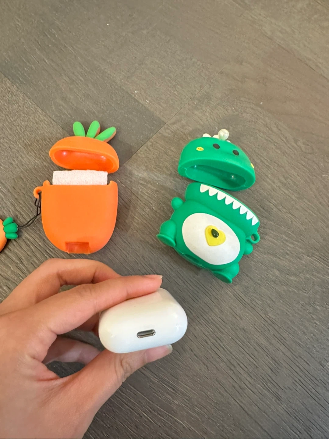 Protect your AirPods with these fun silicone cases! One case is designed to look like a cute carrot with a detachable ring. The other is a playful green dinosaur. Both offer great protection and style for your charging case.