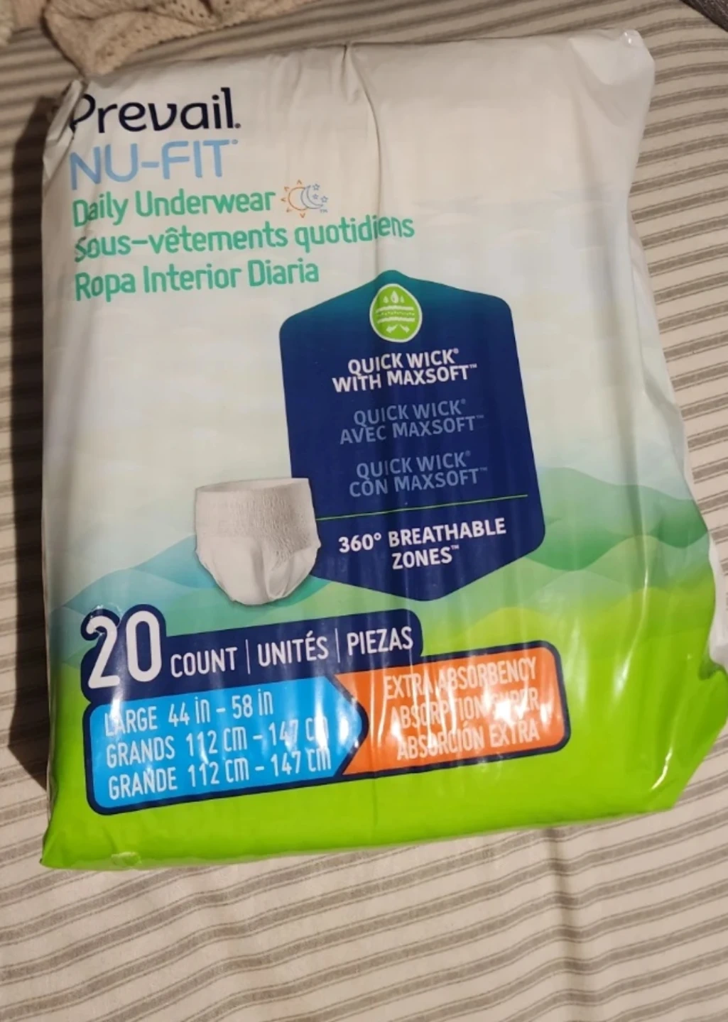 Prevail NU-FIT Daily Underwear in size Large. This pack includes 20 count. Features Quick Wick with MaxSoft technology and 360° breathable zones for extra absorbency. Fits waist sizes 44-58 inches.