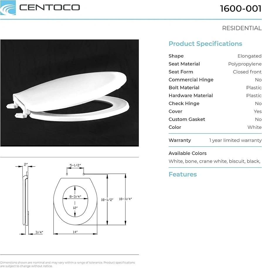 Centoco 1600-001 Elongated Plastic Toilet Seat, Standard Economy Model, White