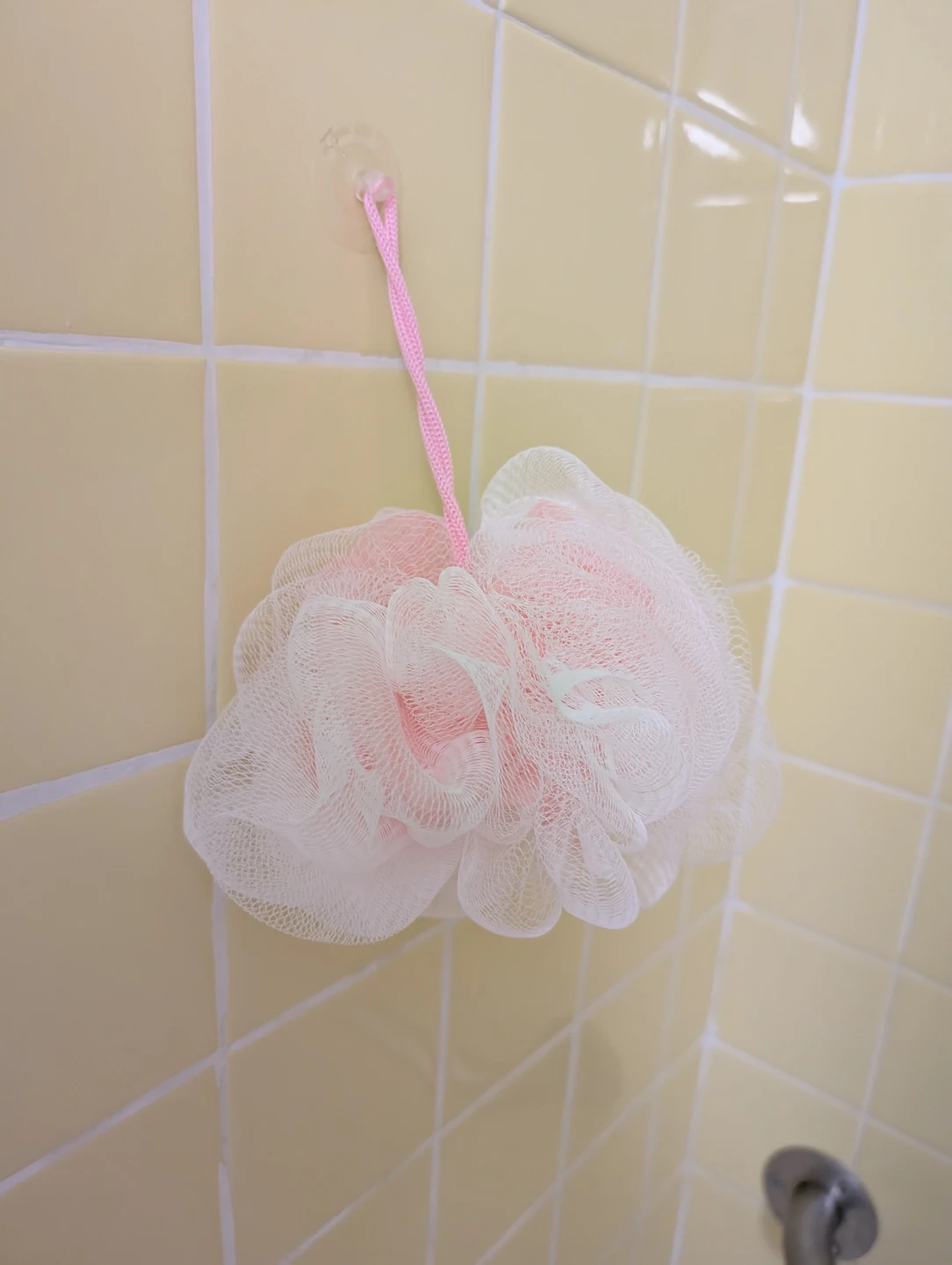This mesh shower pouf is great for creating lather. It's made of a soft mesh material and has a pink hanging loop. It's a nice addition to your shower routine!