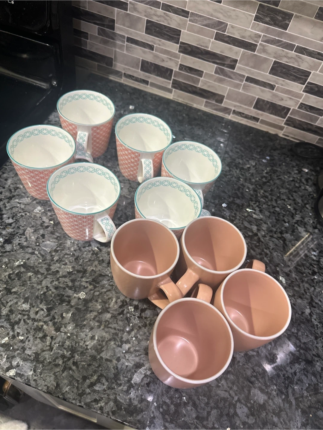 This set includes 10 mugs, featuring a mix of designs. Four mugs showcase a white interior with an orange geometric pattern on the exterior. The other four mugs are a solid peach with a white rim. They're perfect for enjoying your morning coffee or tea!