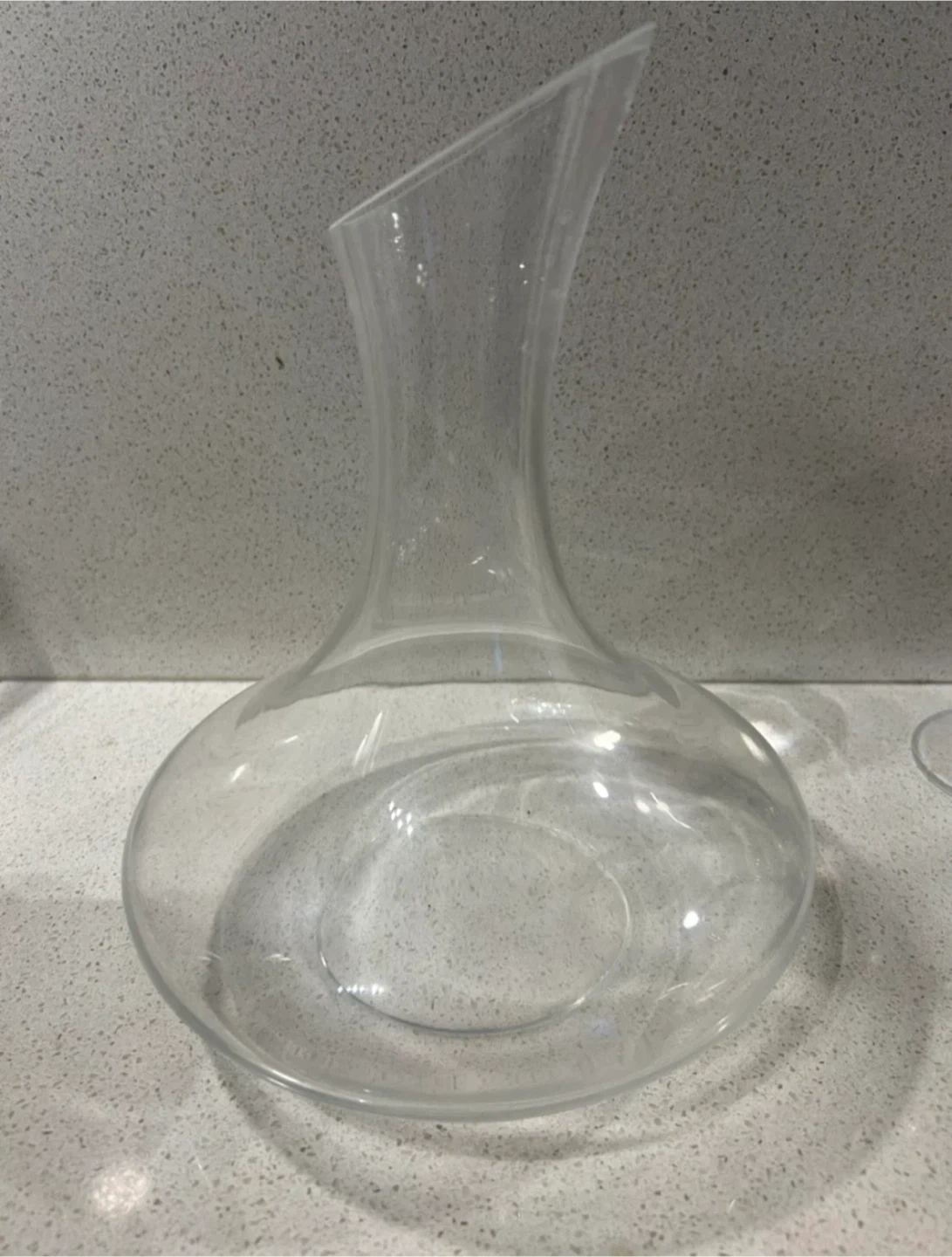 A clear glass wine decanter with a wide base and a slanted spout. This decanter is made of glass. It's useful for aerating wine before serving.