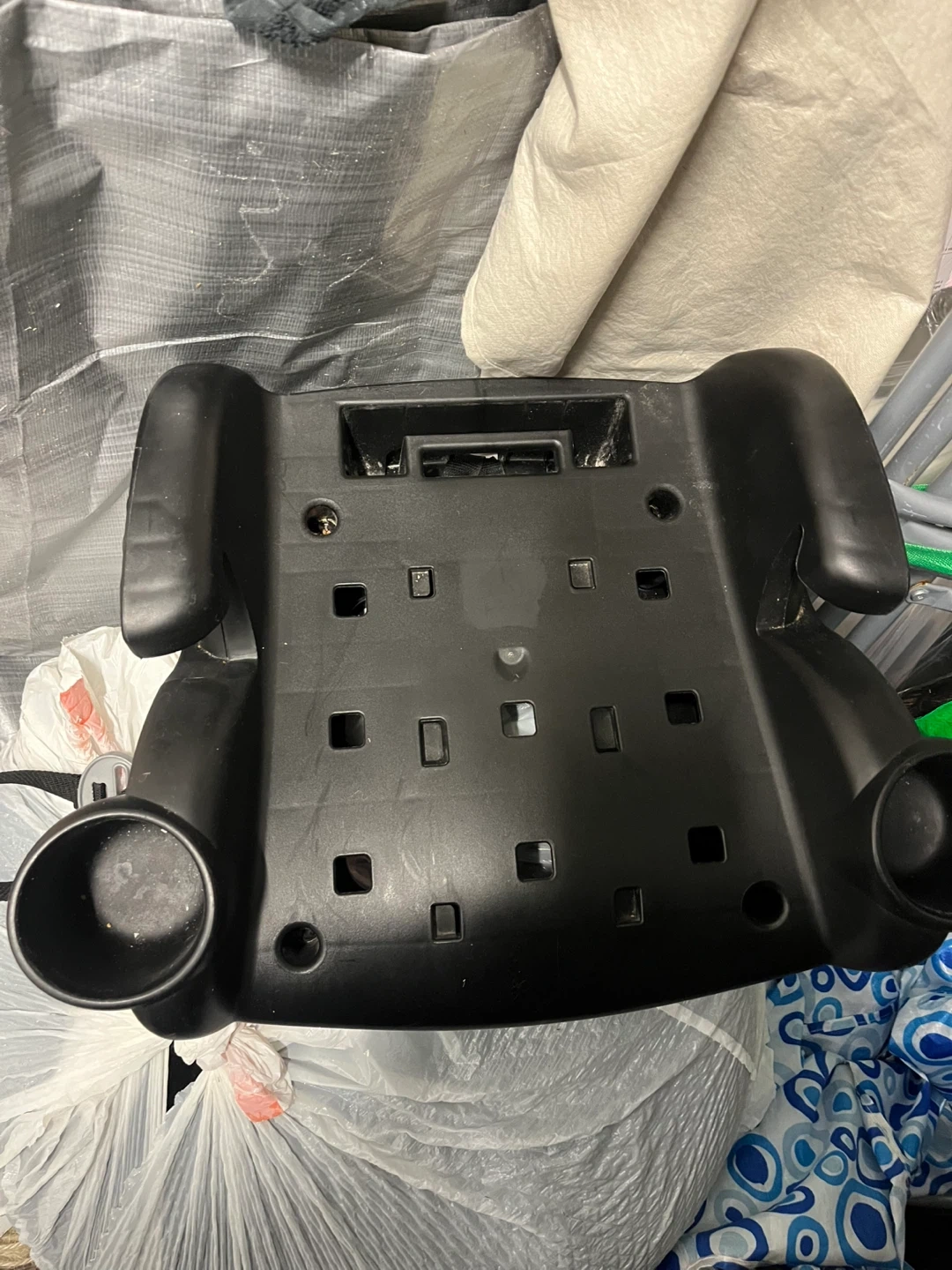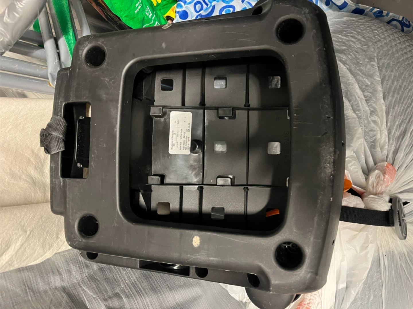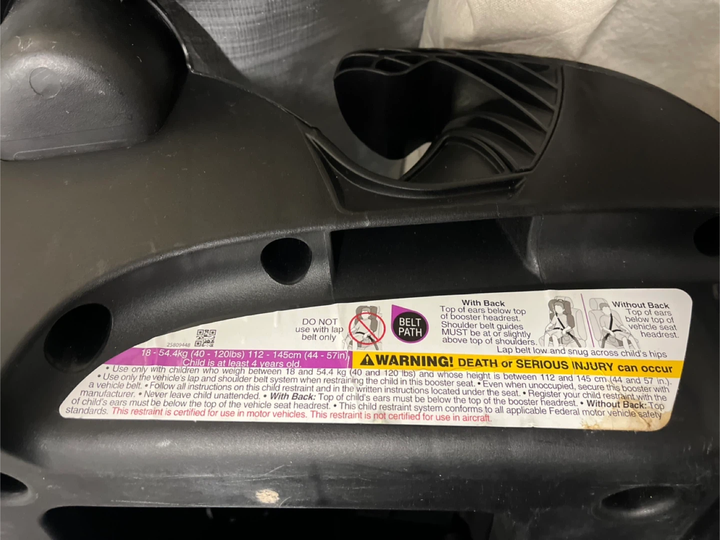 This is a Graco Go Time Booster car seat base. It's manufactured in 2022 and expires on June 4, 2028. The base is made of black plastic and includes cupholders. It's designed for children aged 4 years and older.