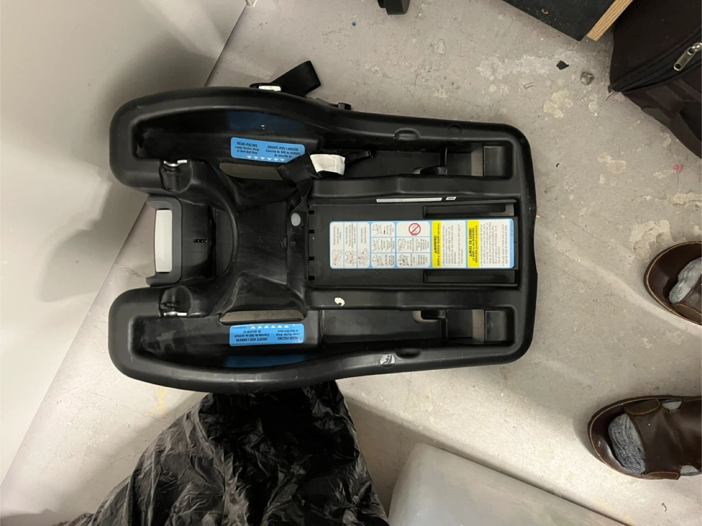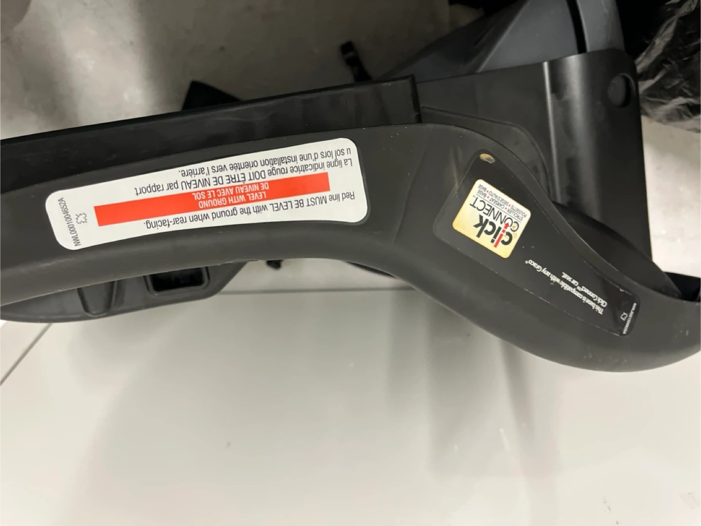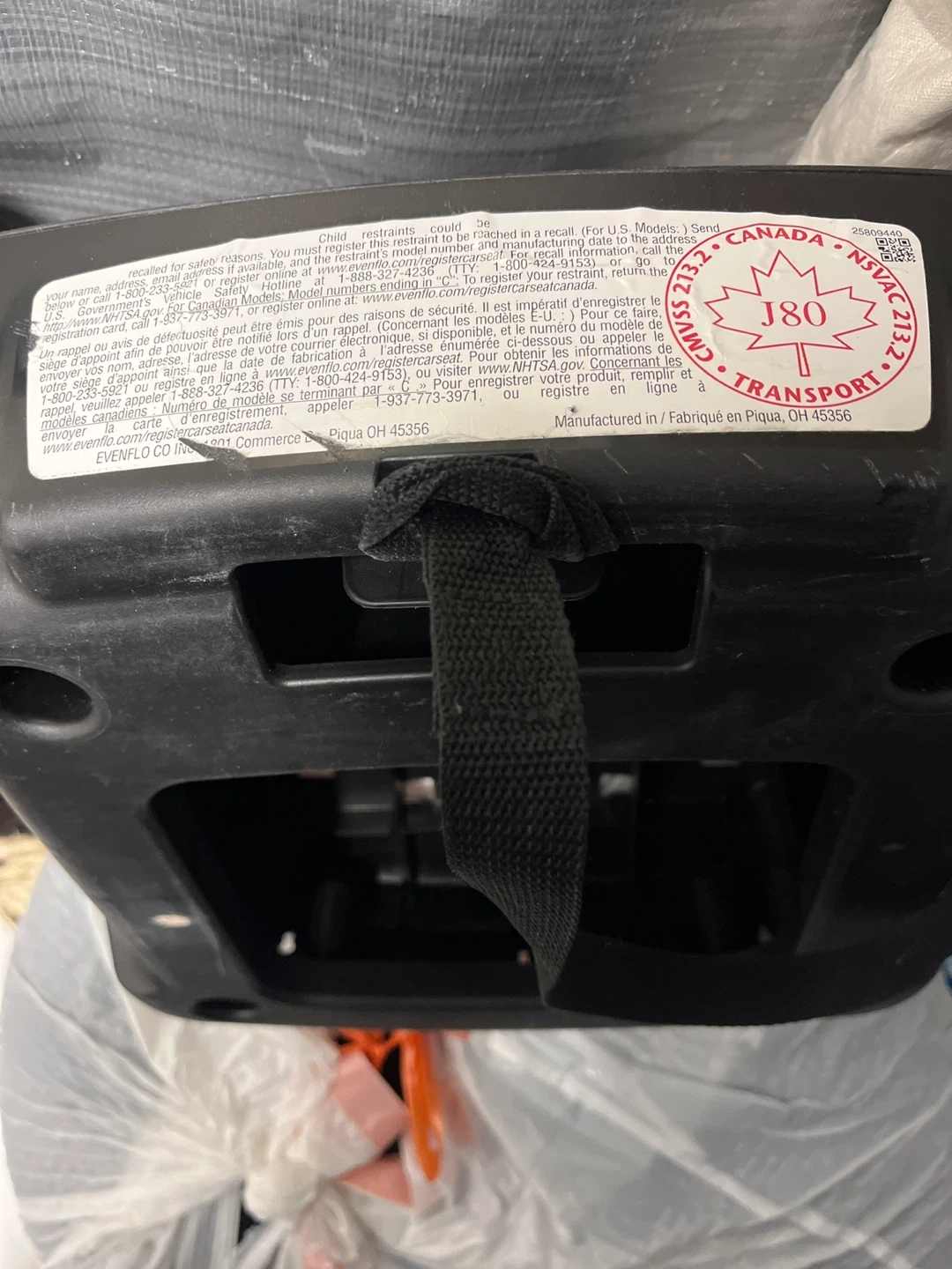 This is a Graco Go Time Booster car seat base. It's manufactured in 2022 and expires on June 4, 2028. The base is made of black plastic and includes cupholders. It's designed for children aged 4 years and older.