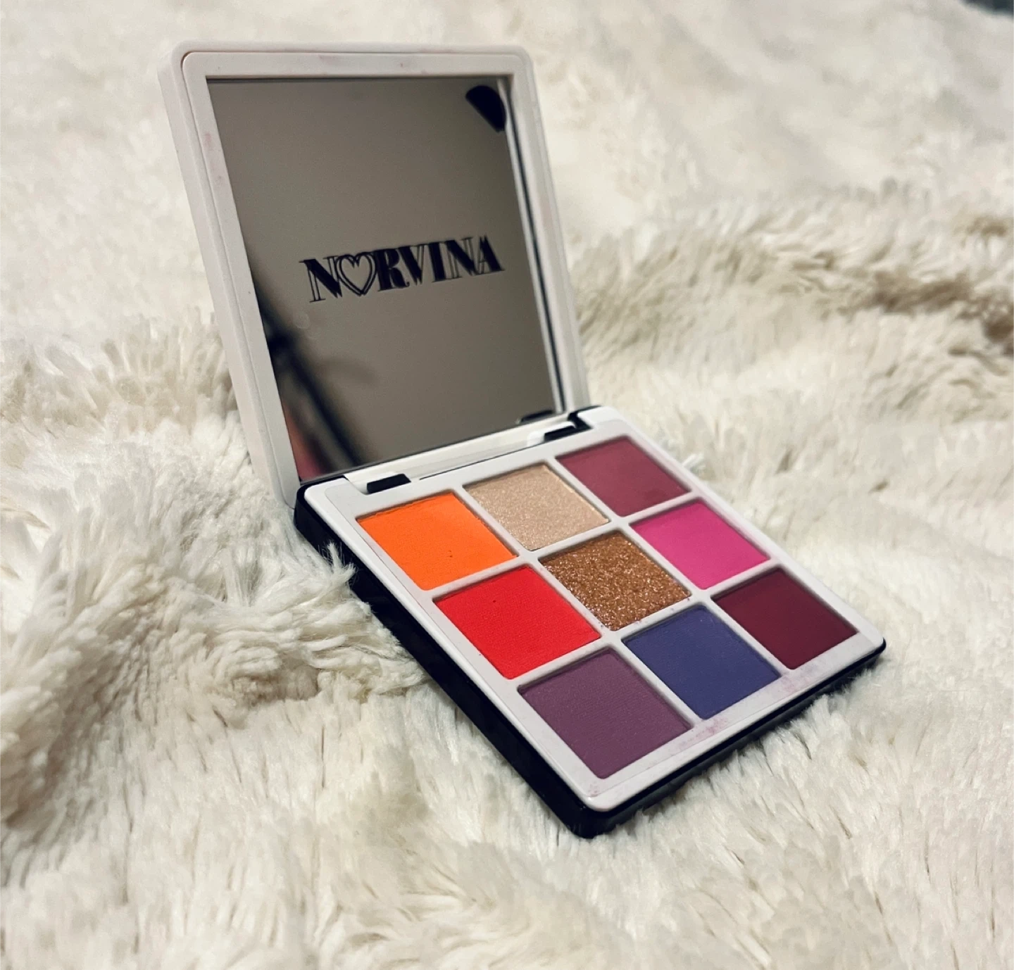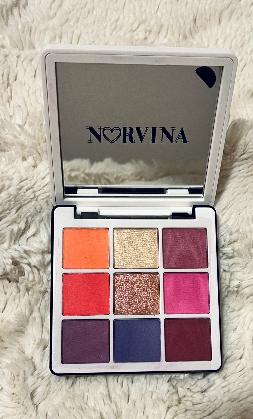 This is the Anastasia Beverly Hills small eyeshadow palette, the Norvina Mini Pro Pigment Palette Vol. 1. It features nine vibrant pressed pigments with shades of pink, orange, and purple. Cruelty-free makeup.