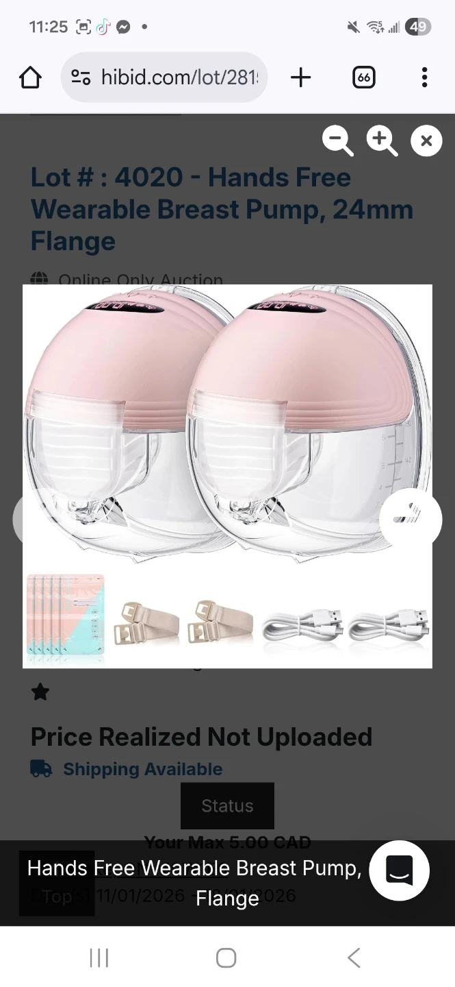 This is a pair of hands-free wearable breast pumps with a 24mm flange size. It includes bra adjusters and USB charging cables. The pumps are pink and clear with measurement markings. They feature a digital display.
