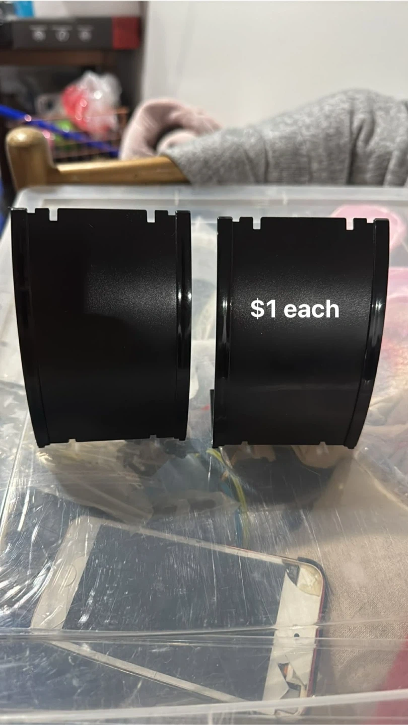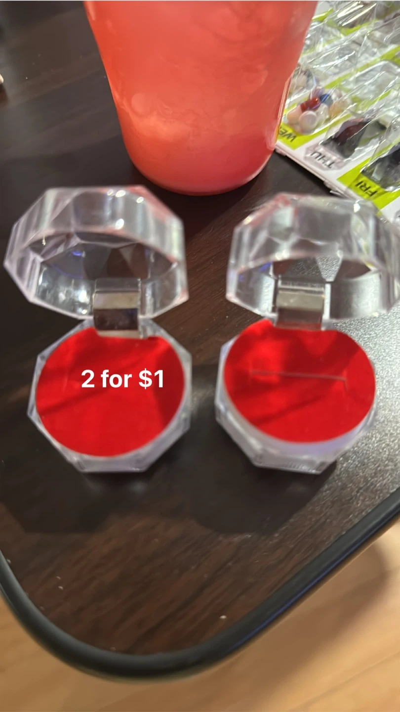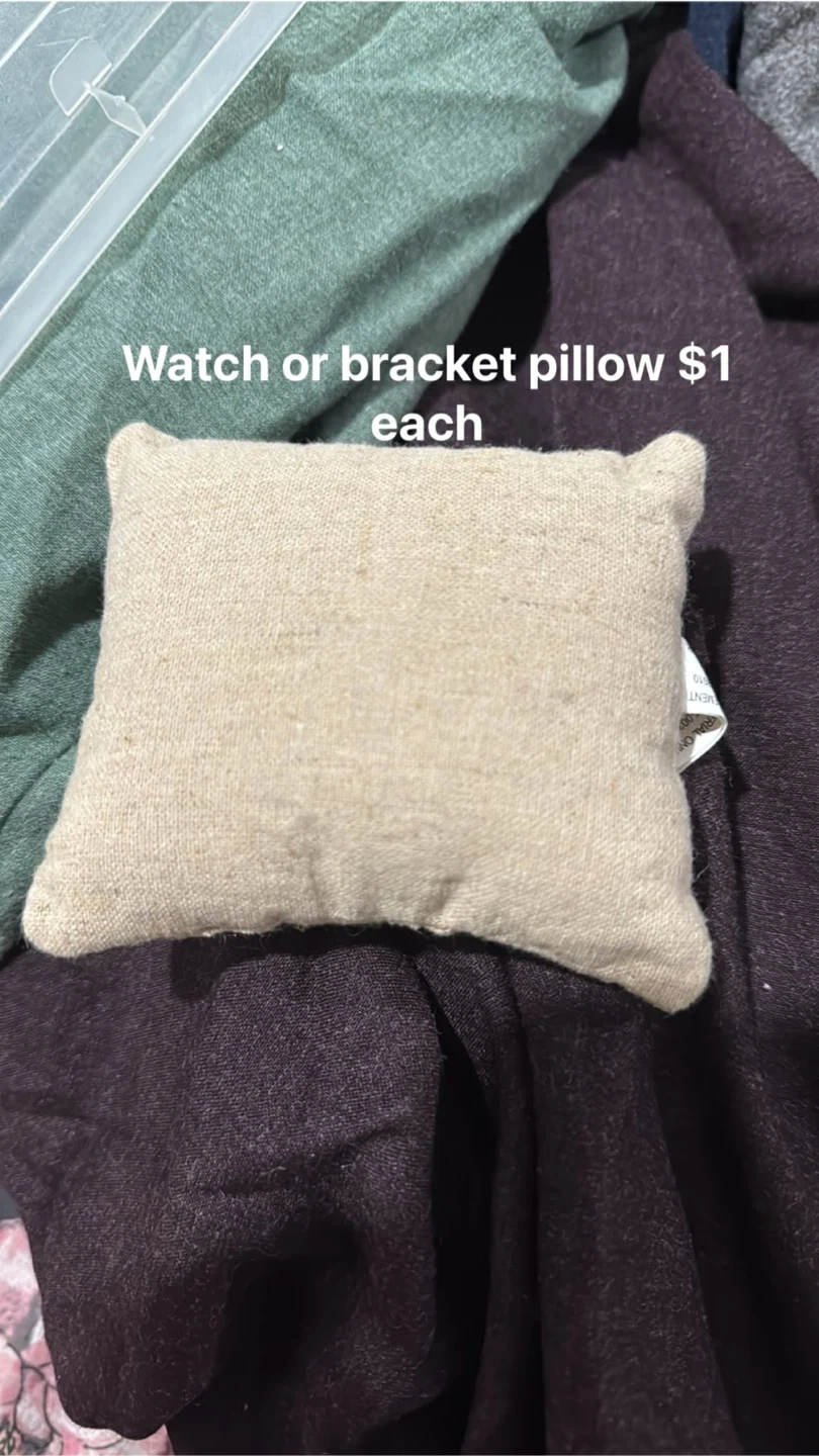 Pillows for displaying watches or brackets. They're beige and made of a textured fabric. The stand is black plastic. Chain holder boxes are clear plastic. Ring boxes are clear plastic with a red insert.