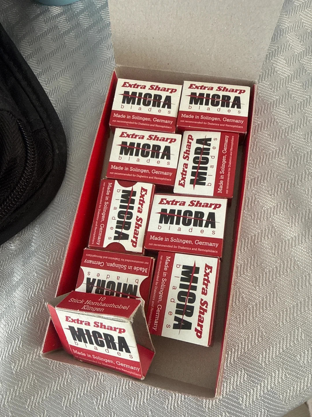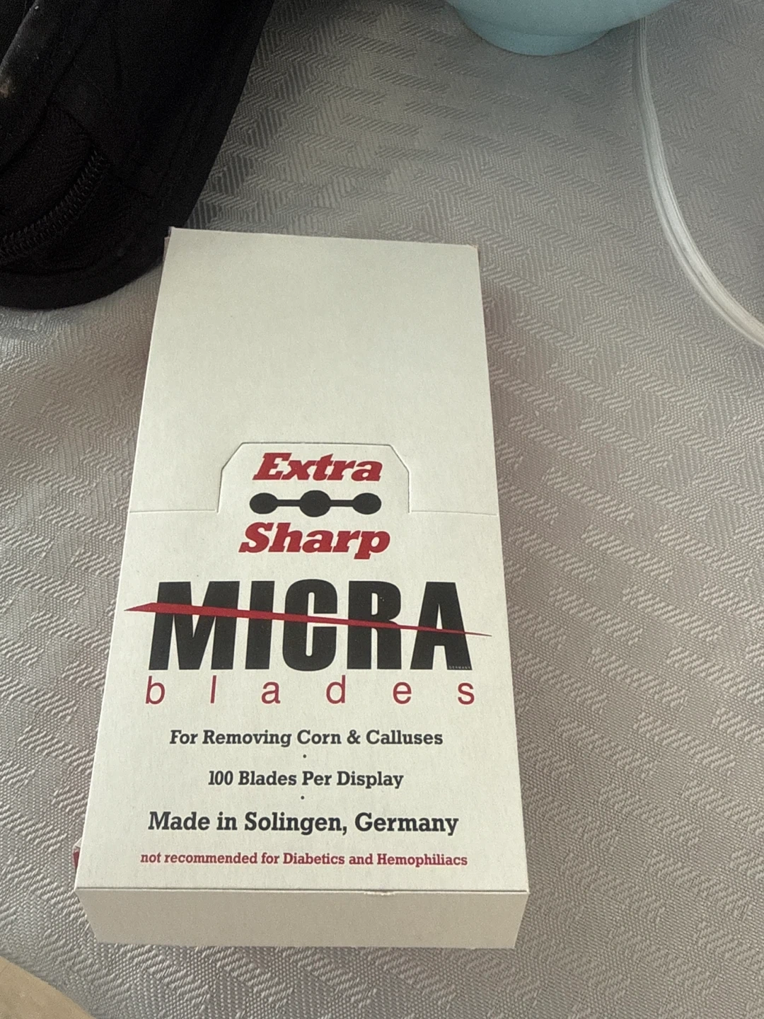 MICRA extra sharp blades for removing corn and calluses. Each display has 100 blades. Made in Solingen, Germany. Not recommended for diabetics and hemophiliacs.