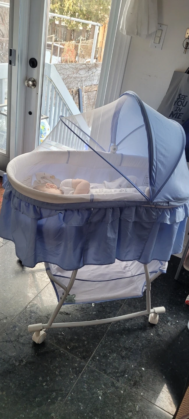 This is a blue baby bassinet with a matching canopy and mosquito net. It has a ruffled skirt and wheels for easy mobility. The bassinet includes a soft mattress pad.