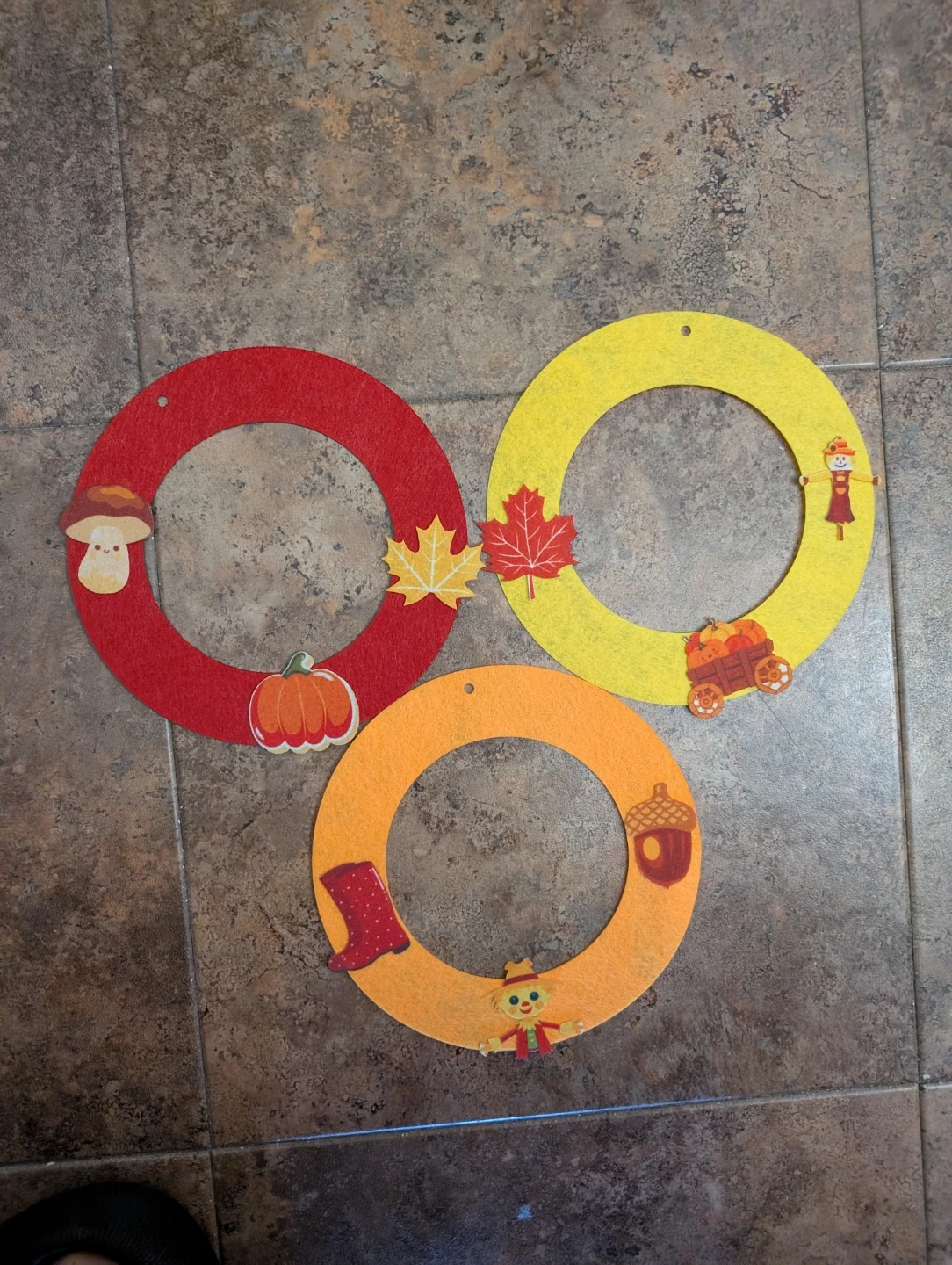 These are three circular felt wreaths, each featuring different fall-themed embellishments. One wreath is red with a mushroom, pumpkin, and maple leaf. Another is yellow with a scarecrow and a wagon full of pumpkins. The third is orange with a red boot, an acorn, and a scarecrow. They're perfect for adding a festive touch to your home this autumn!