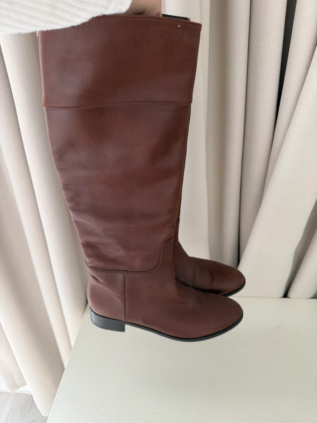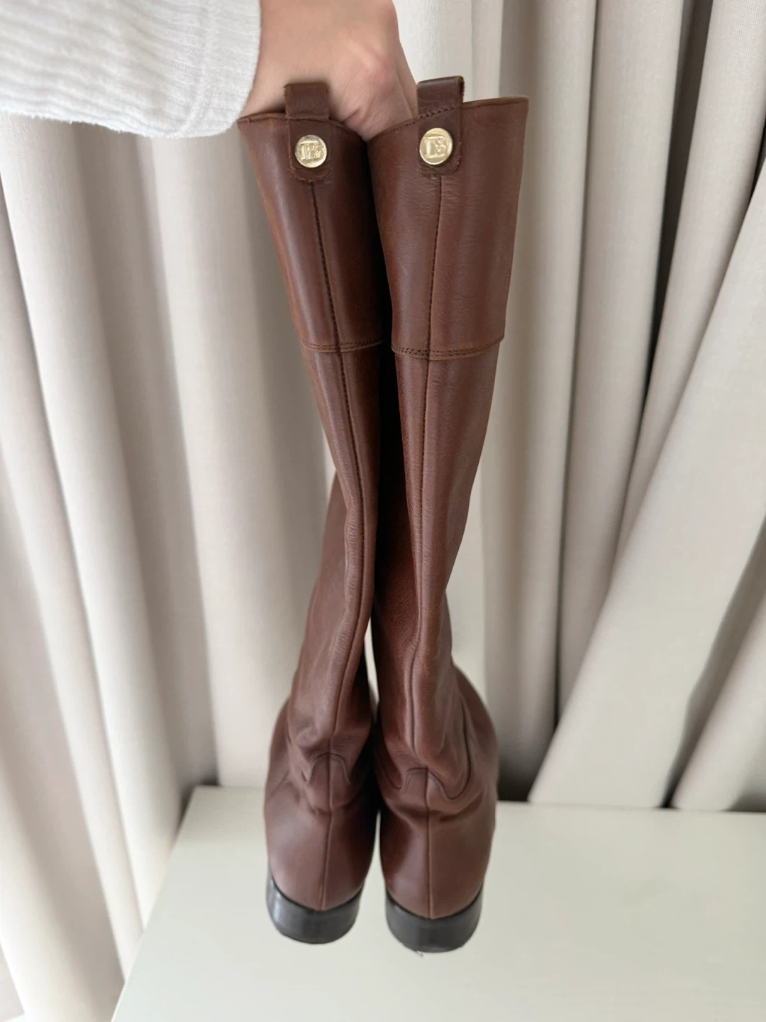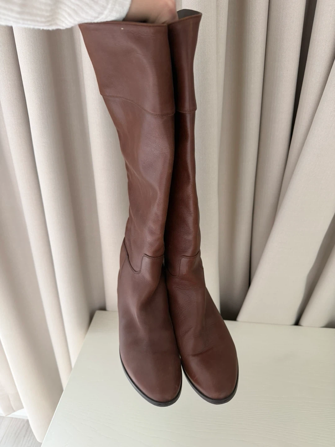 These are brown leather tall boots. They're made of genuine leather with a simple, classic design. These boots are perfect for everyday wear or dressing up an outfit!