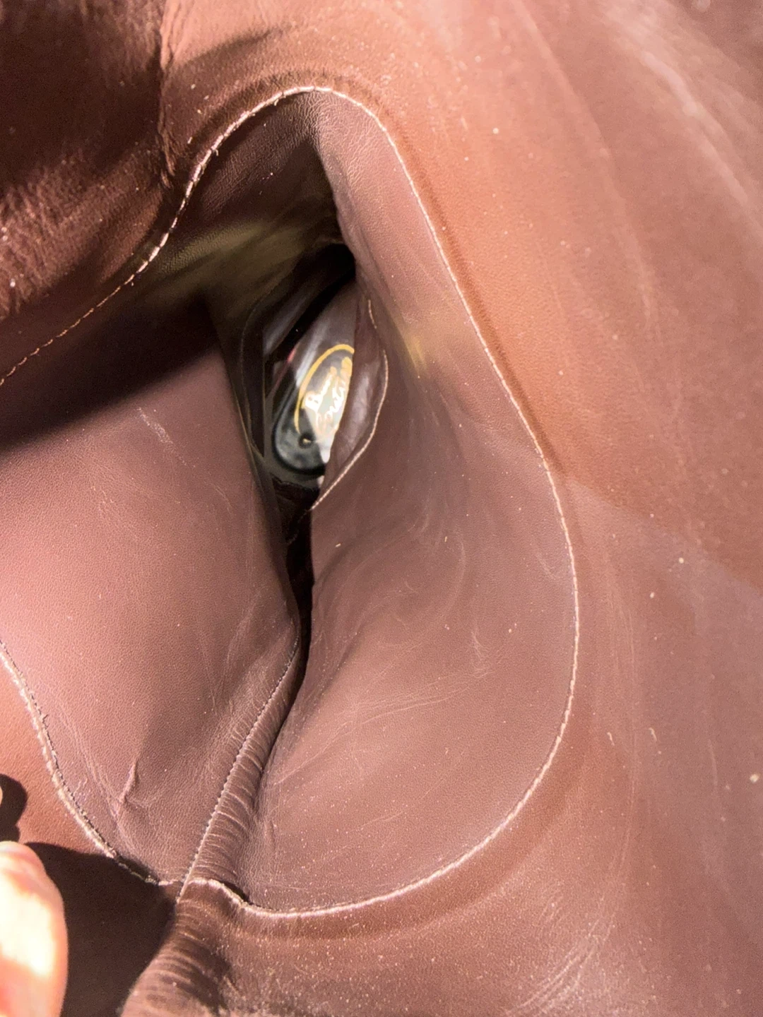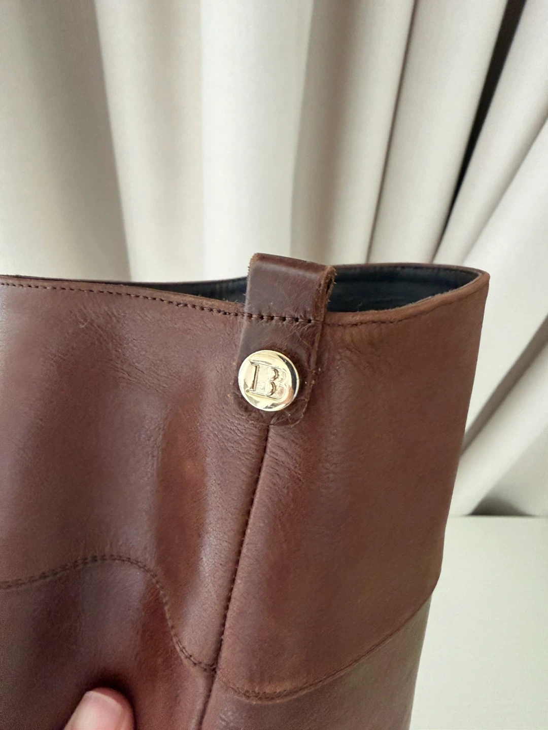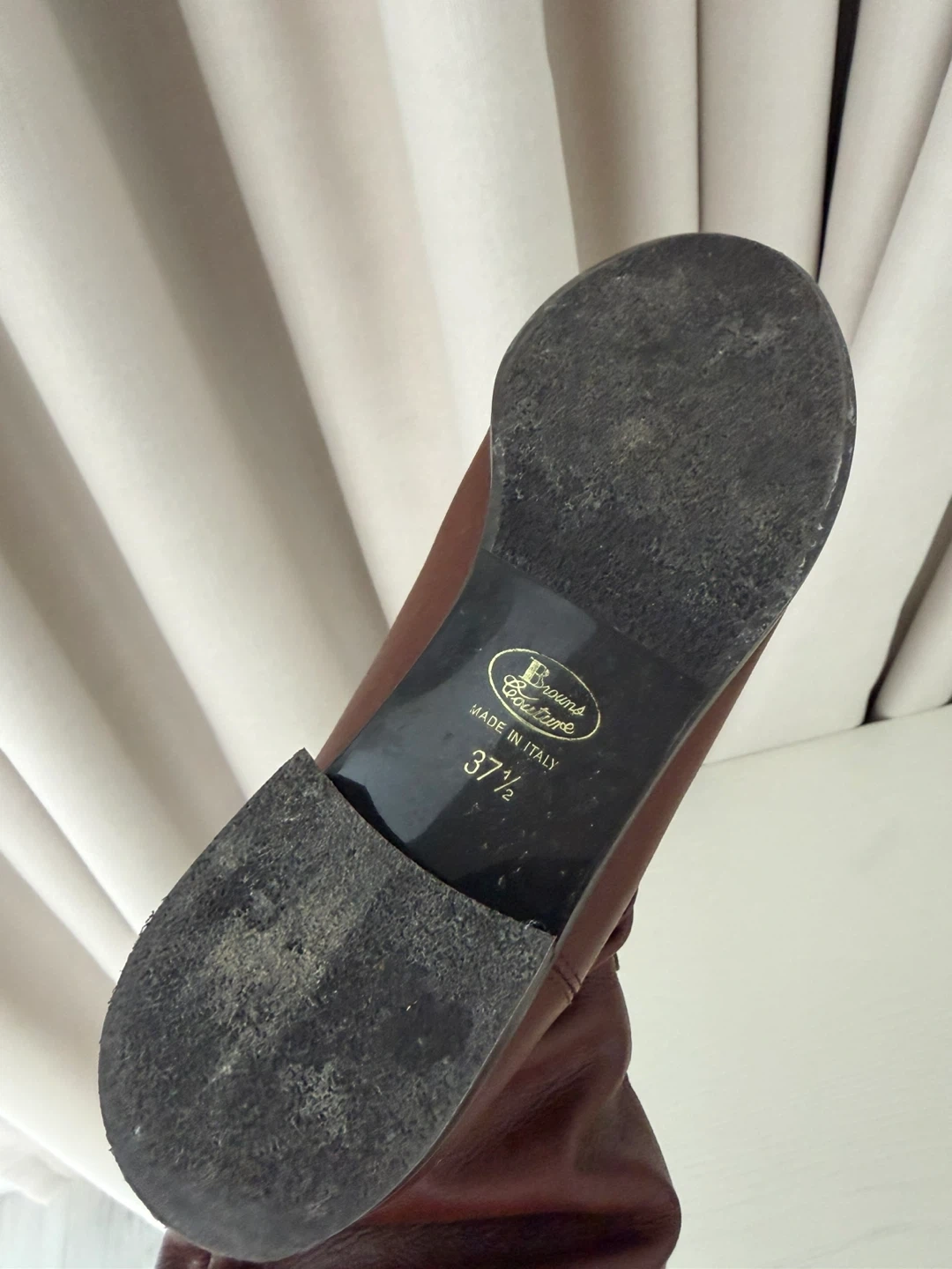 These are brown leather tall boots. They're made of genuine leather with a simple, classic design. These boots are perfect for everyday wear or dressing up an outfit!