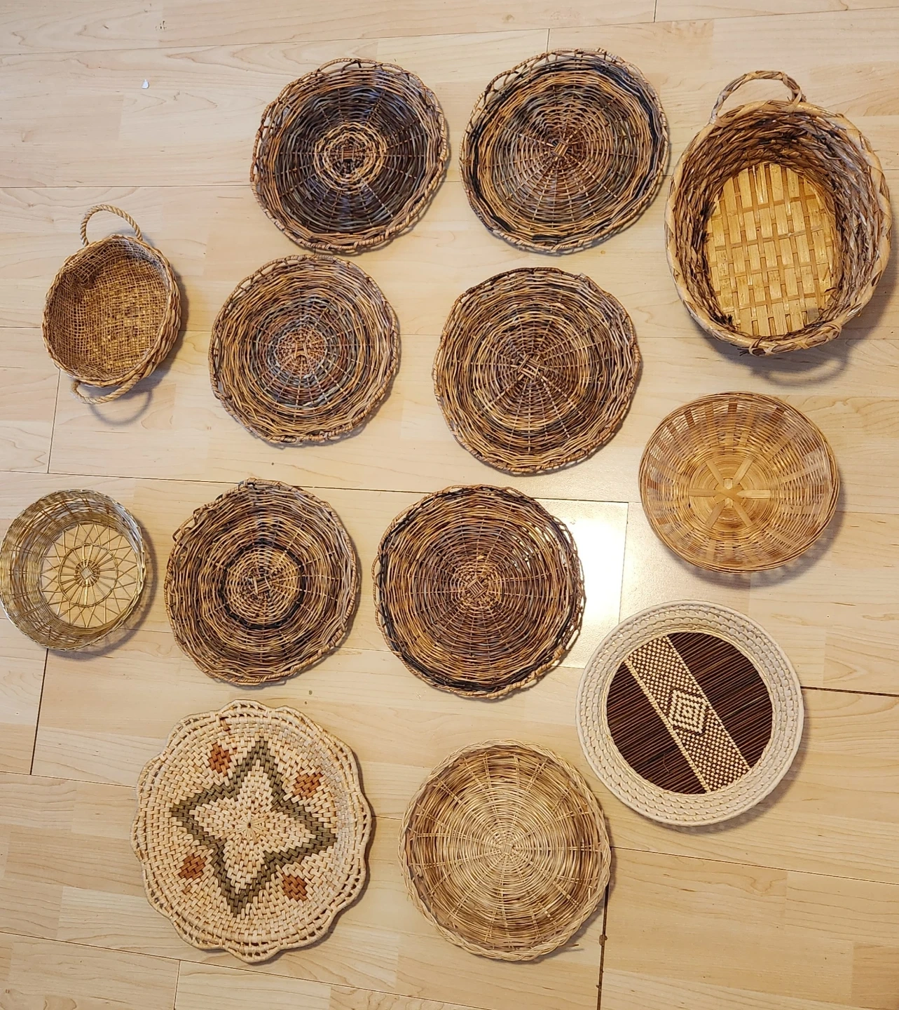 This lot includes various woven baskets and round wall decor pieces. Materials are natural fibres like rattan and straw. Some pieces are decorative, while others can be used for small storage. They're perfect for adding a rustic touch to your home!