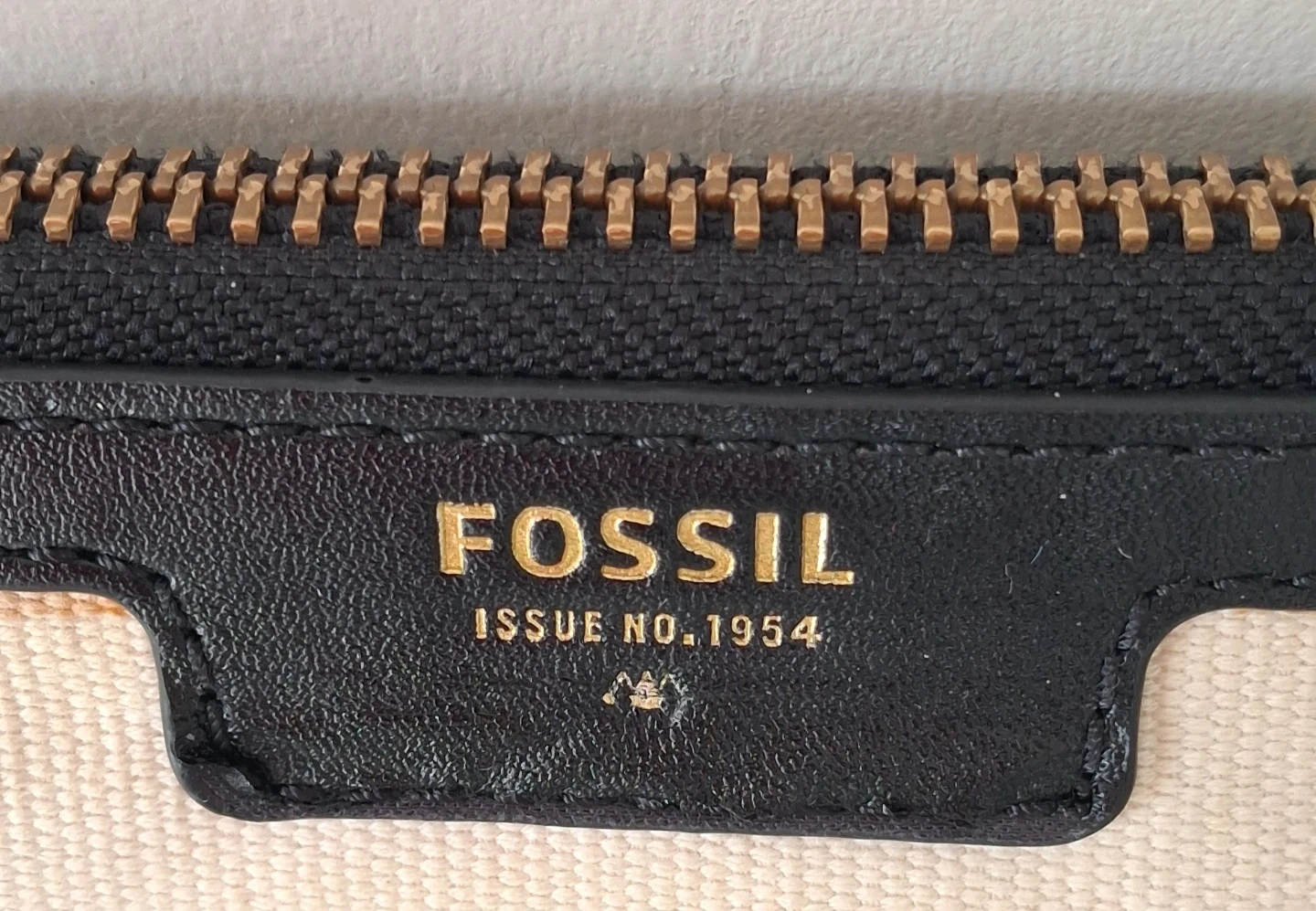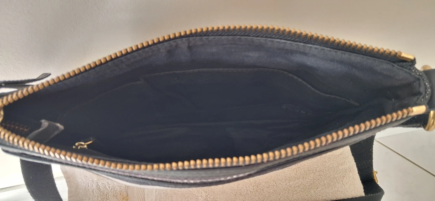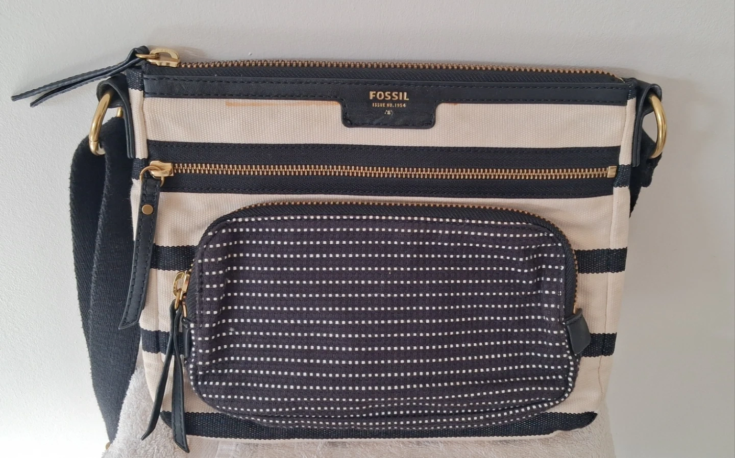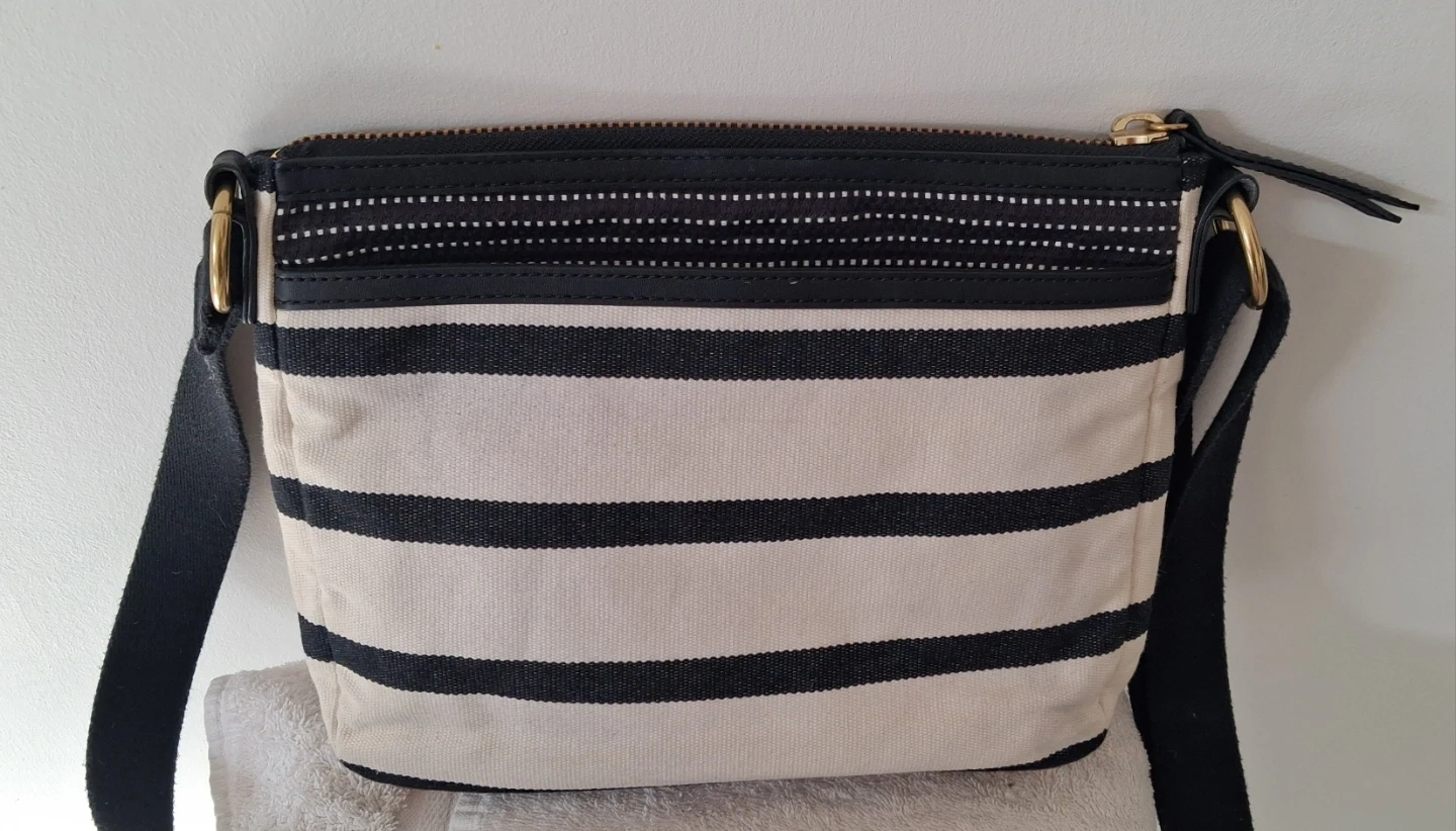 Fossil crossbody bag with a black and white stripe pattern. It has a canvas exterior and a zippered main compartment. Features an exterior zippered pocket and an adjustable strap.