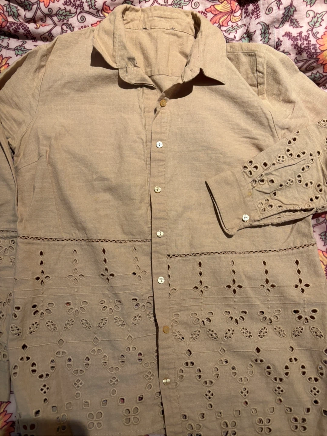 This light brown button-up shirt features intricate eyelet detailing on the sleeves and hem. It's made from a breathable fabric perfect for warmer weather. The classic collar and button front add a touch of timeless style.