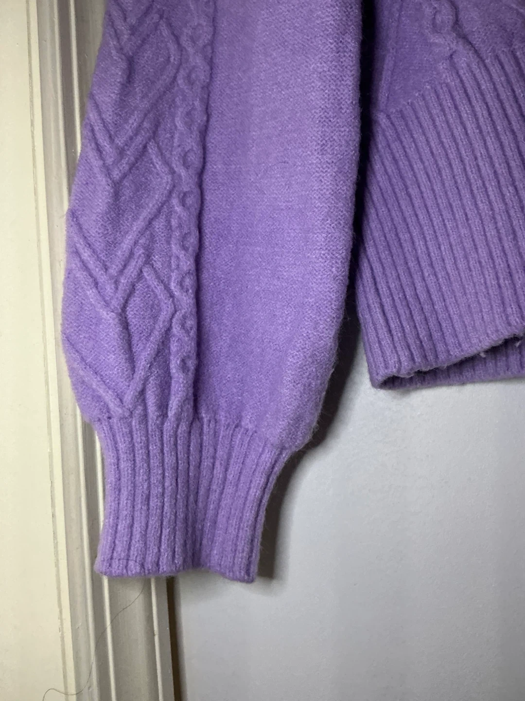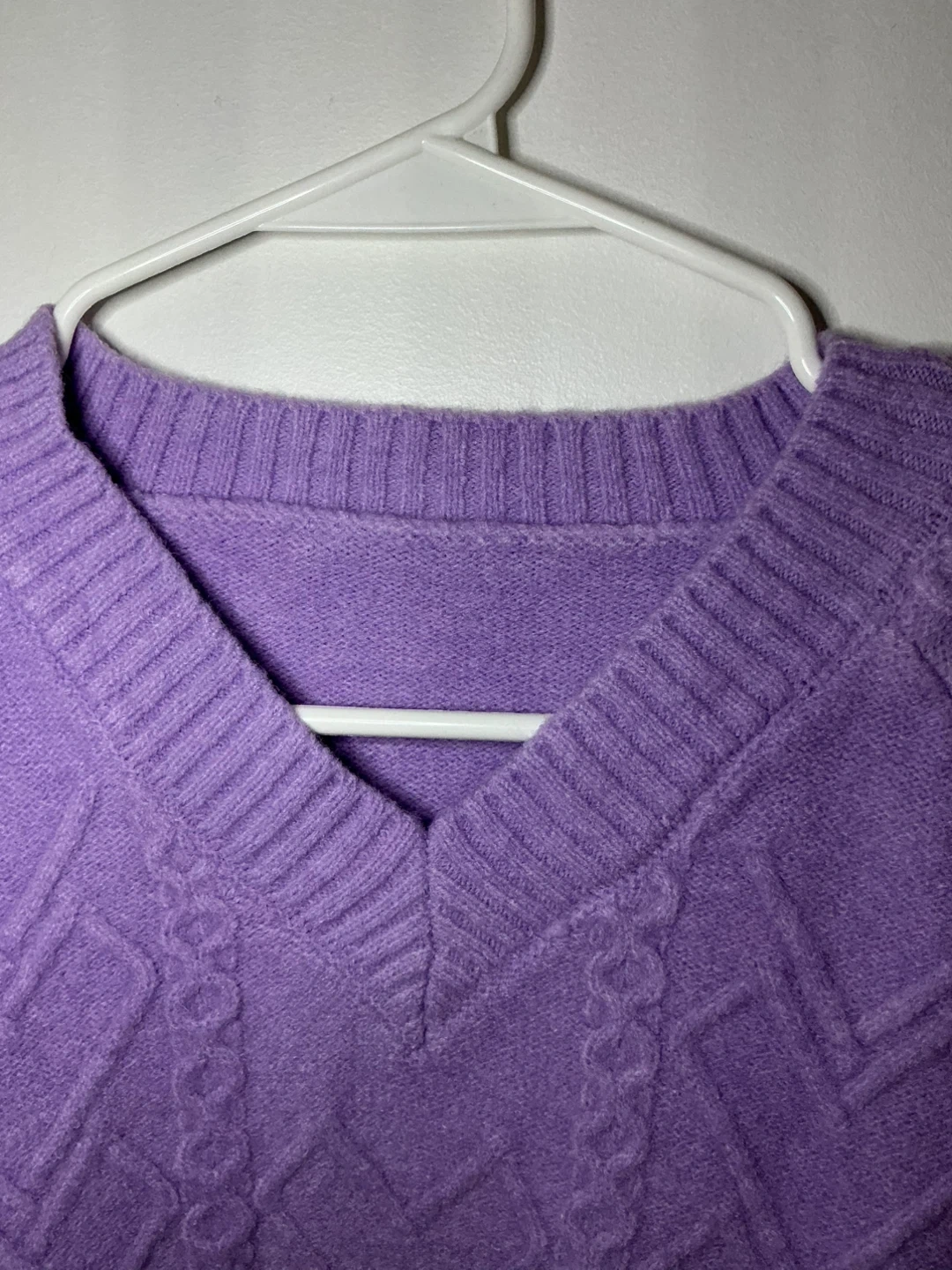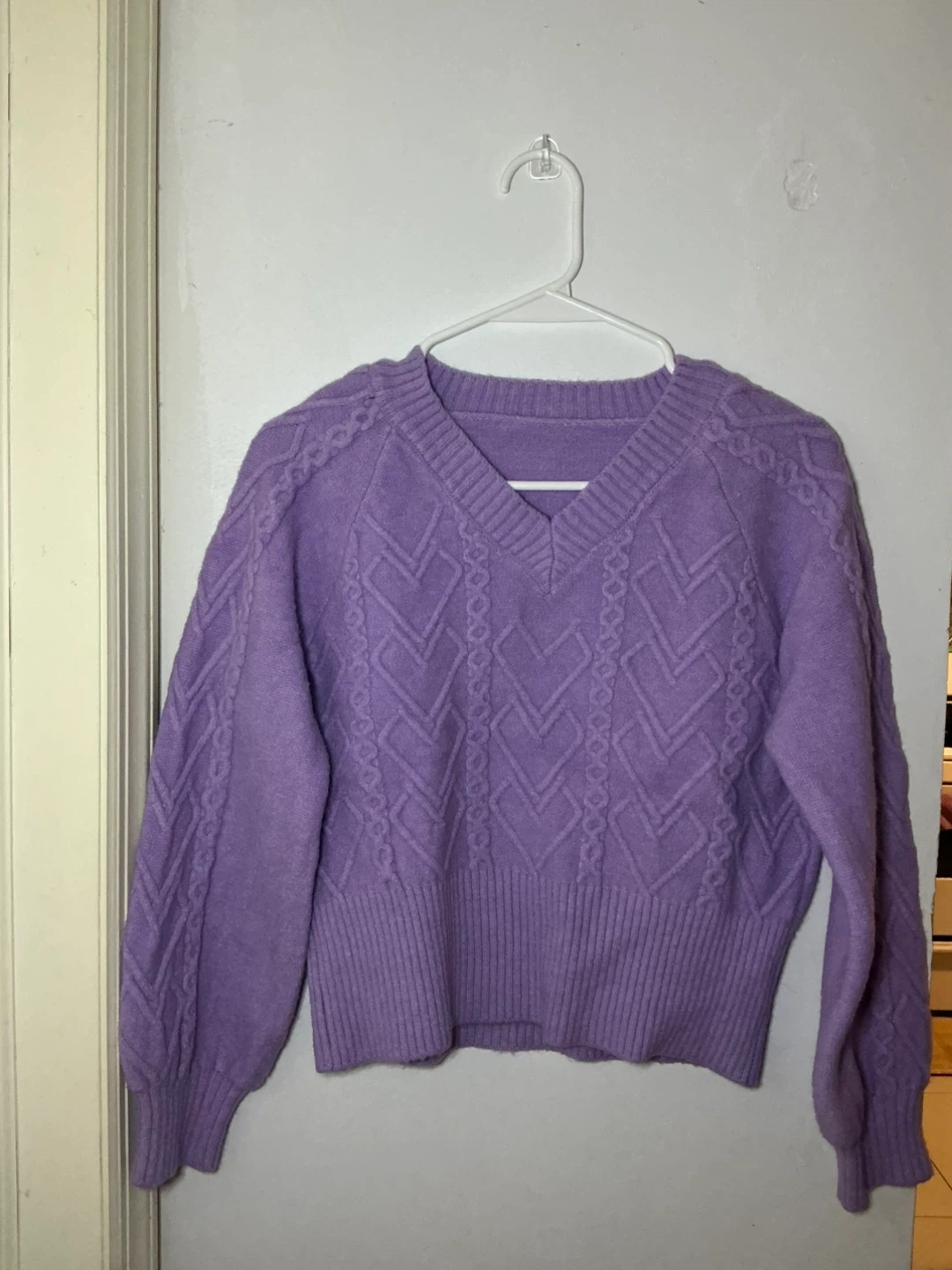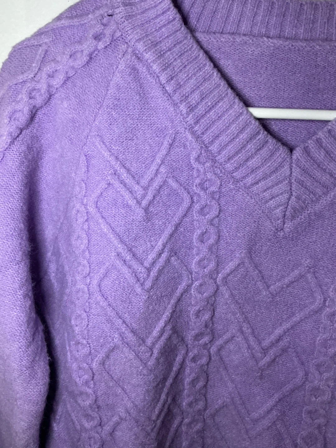 A stylish purple V-neck sweater with intricate cable knit detailing on the front and sleeves. It features a cropped silhouette with ribbed cuffs and hem. This sweater's knit is likely a blend, offering both warmth and a soft feel.