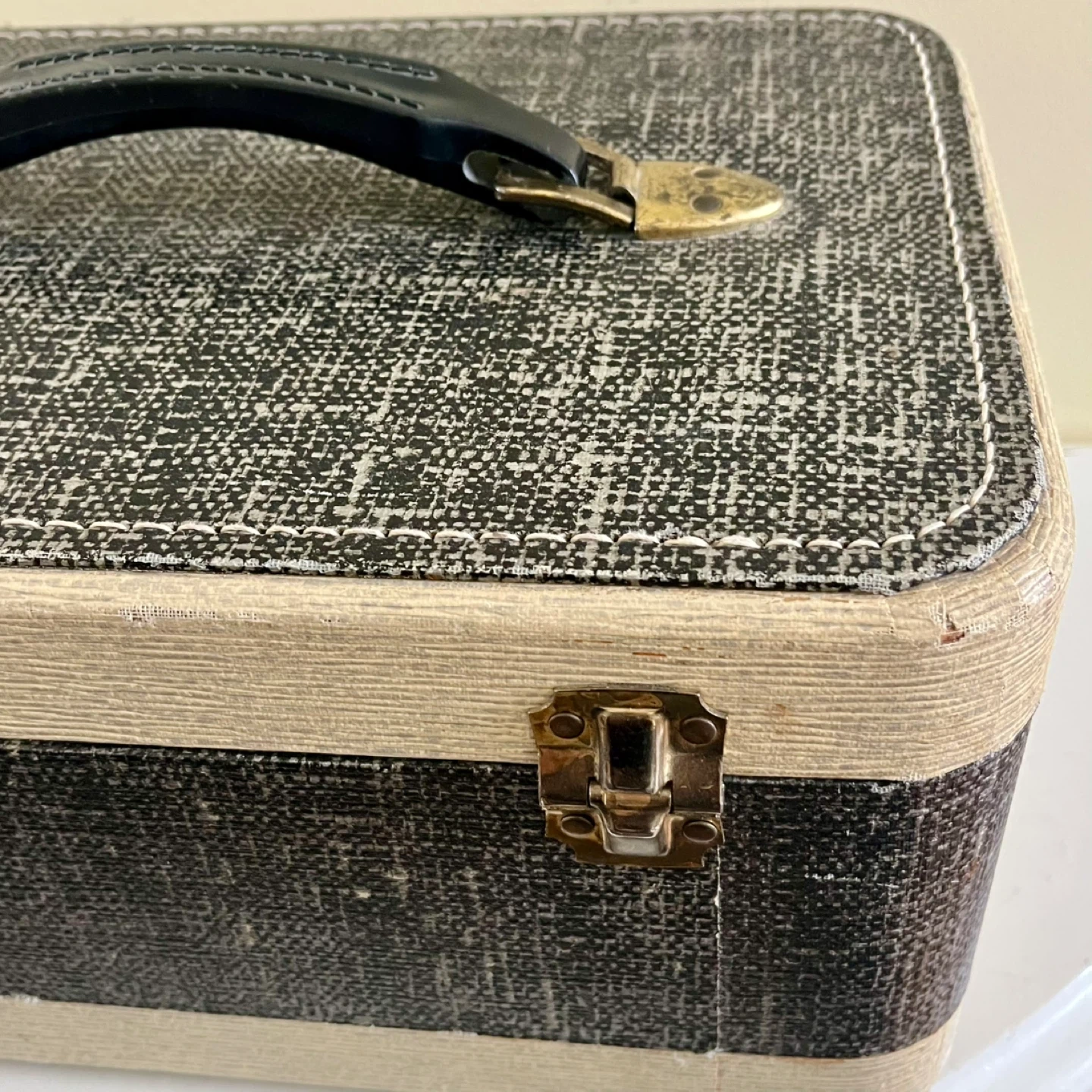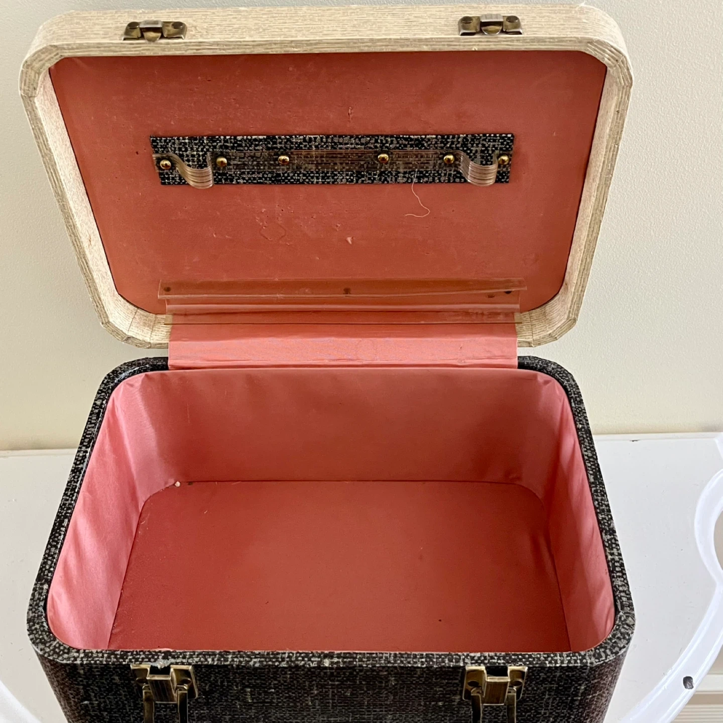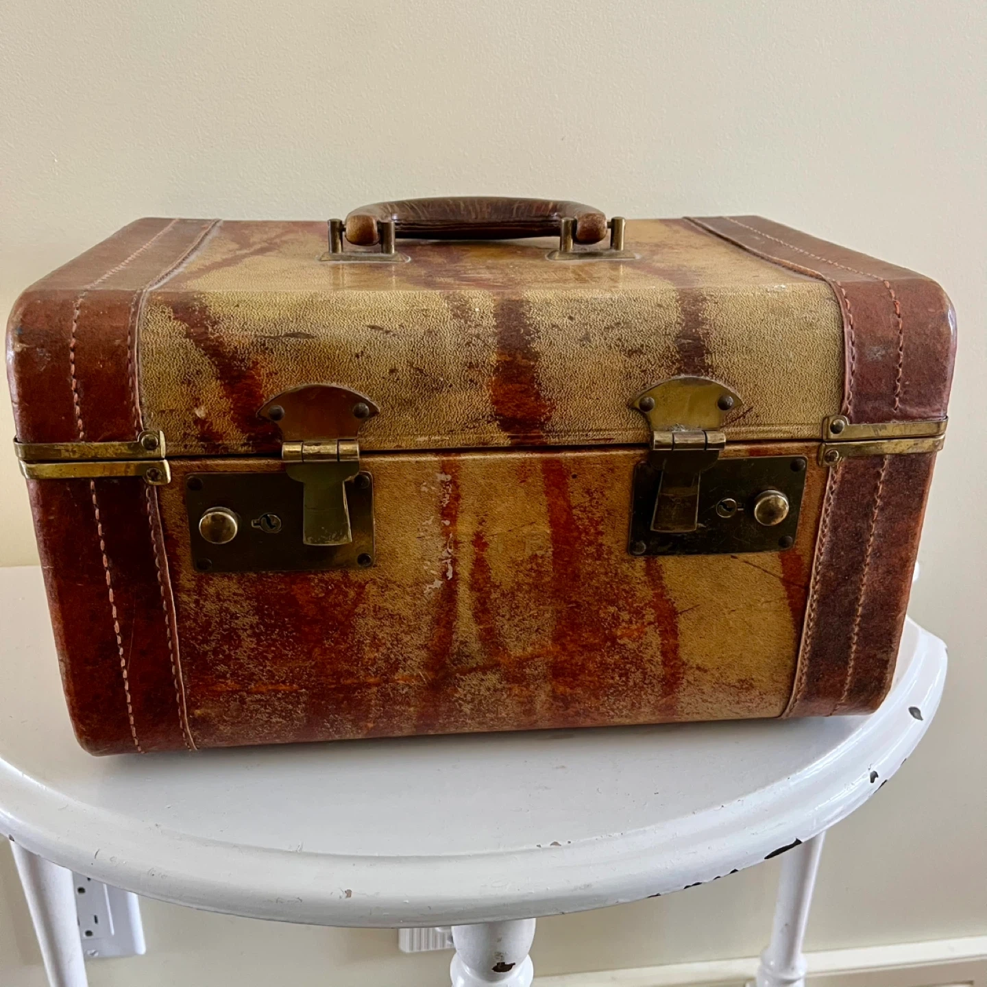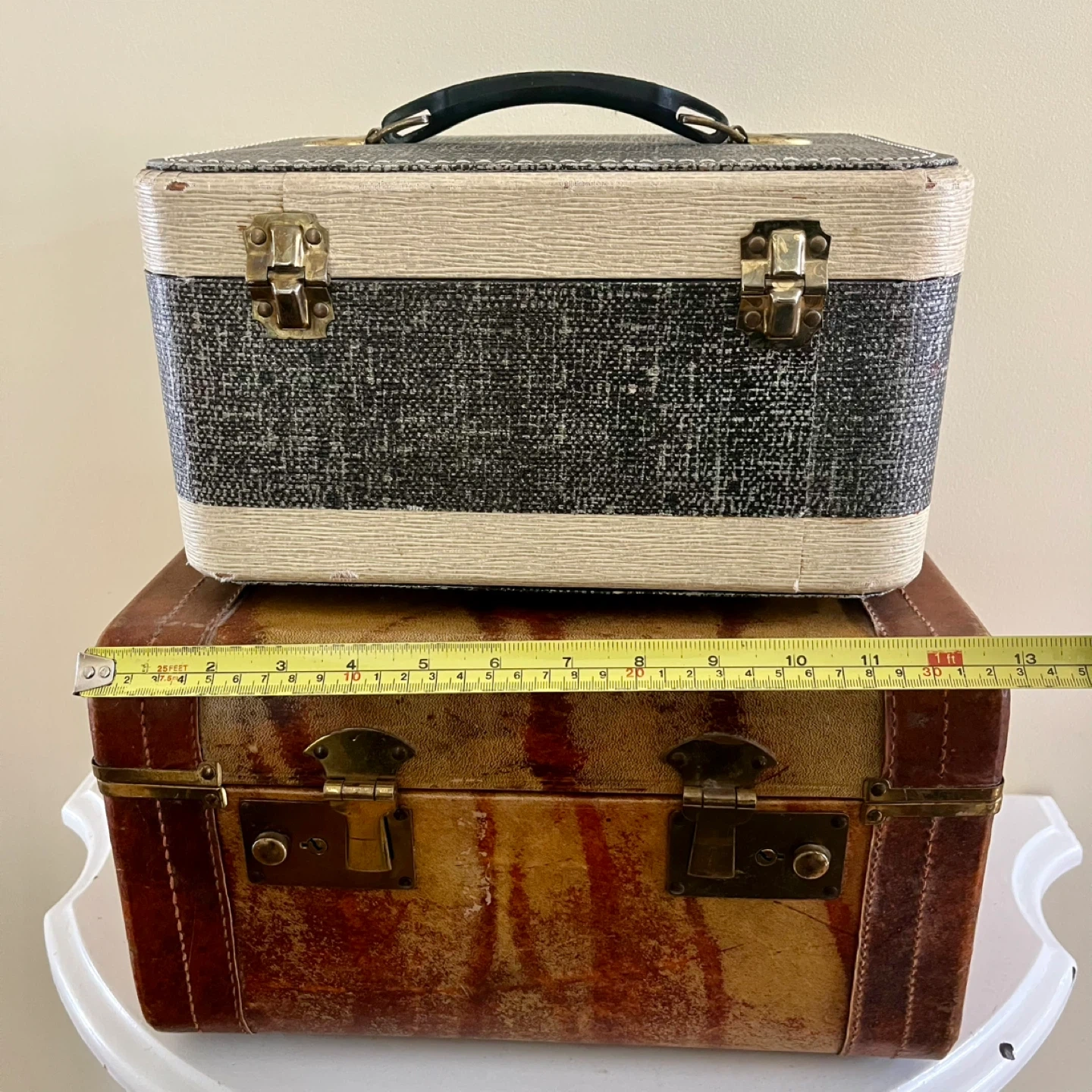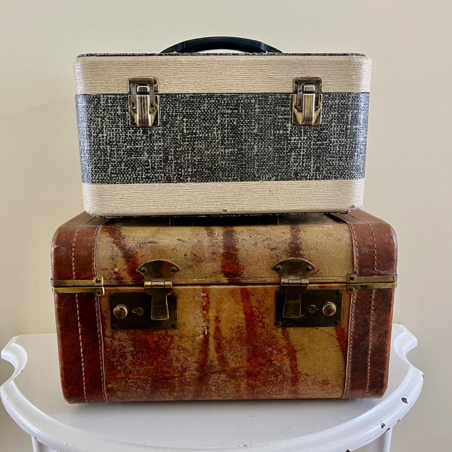 Set of two vintage train cases. The larger case features a unique patterned exterior with brass hardware, monogrammed initials, and a sturdy handle, showing its age with grace. The smaller case has a black and white textured finish with a sleek handle, pink satin lining and organizer. Both are in very good vintage condition.