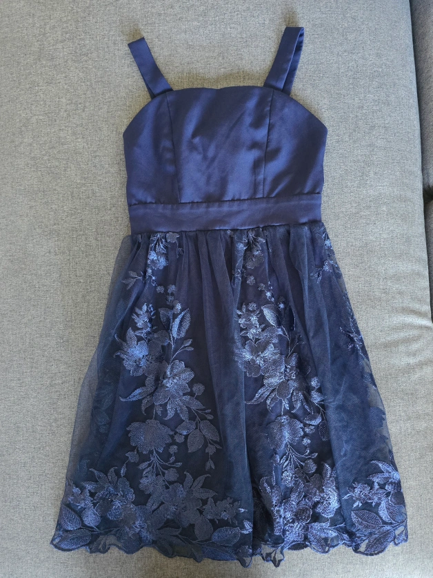 This navy dress features a satin bodice and a beautiful floral embroidered mesh overlay skirt. It has adjustable straps and a large bow detail at the back. Size is 7.