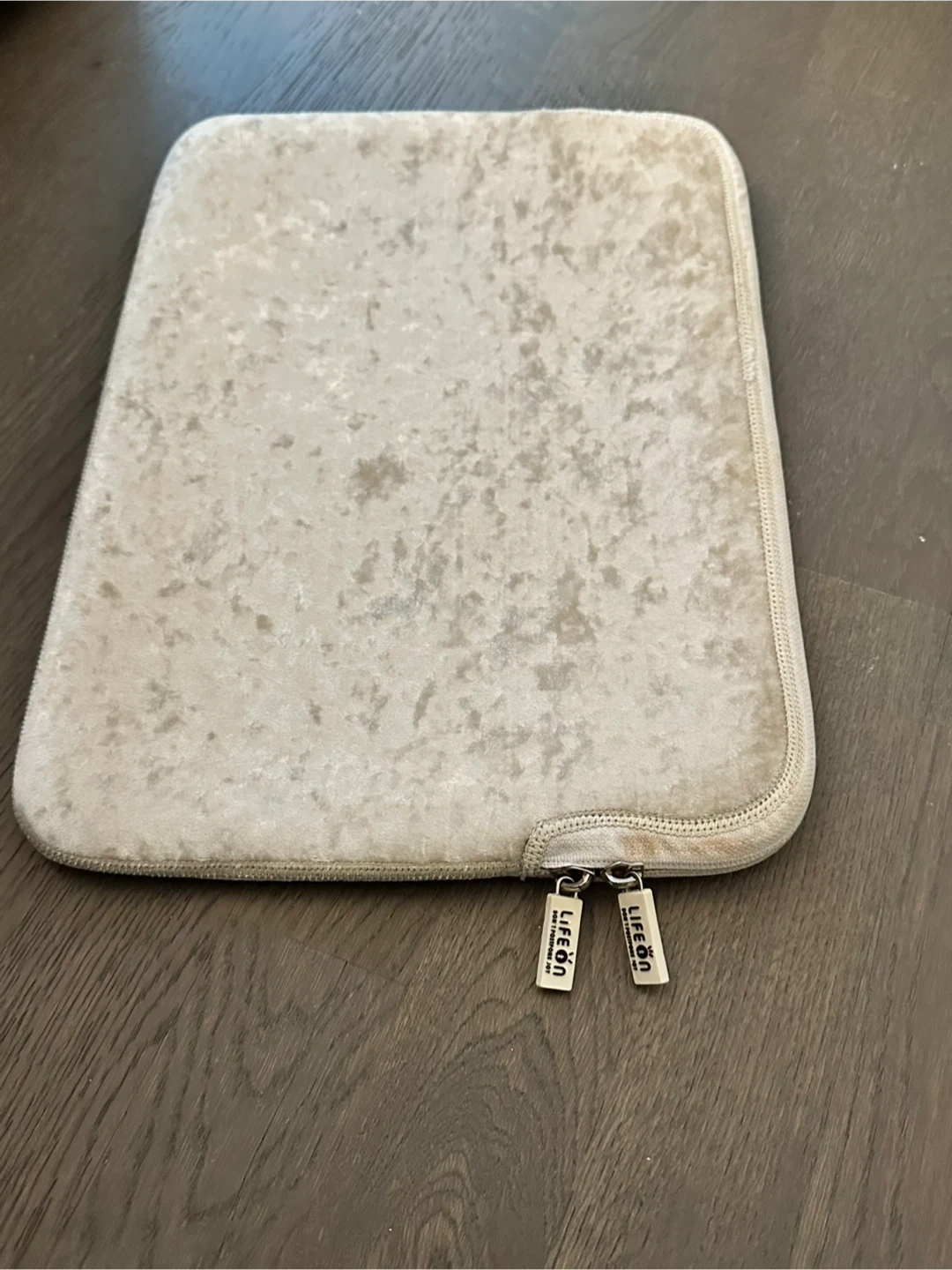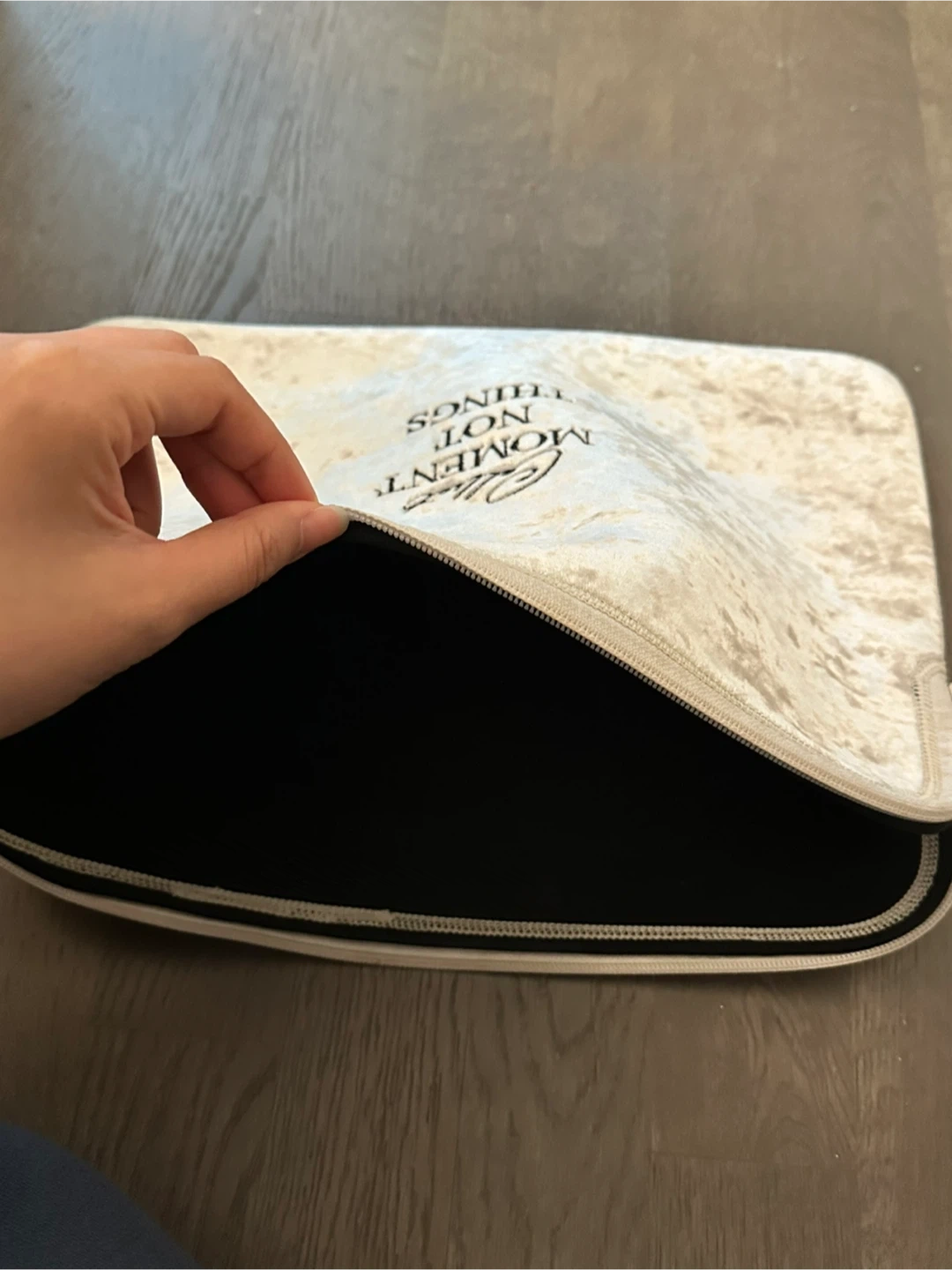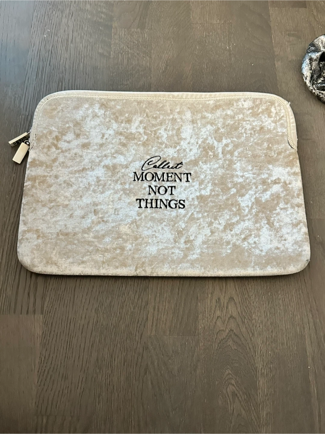 This soft velvet laptop sleeve features the quote "Collect Moments Not Things" embroidered on it. It's a neutral beige color with a black interior. Includes two zipper pulls for easy access.