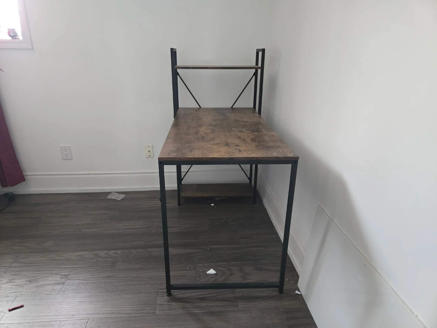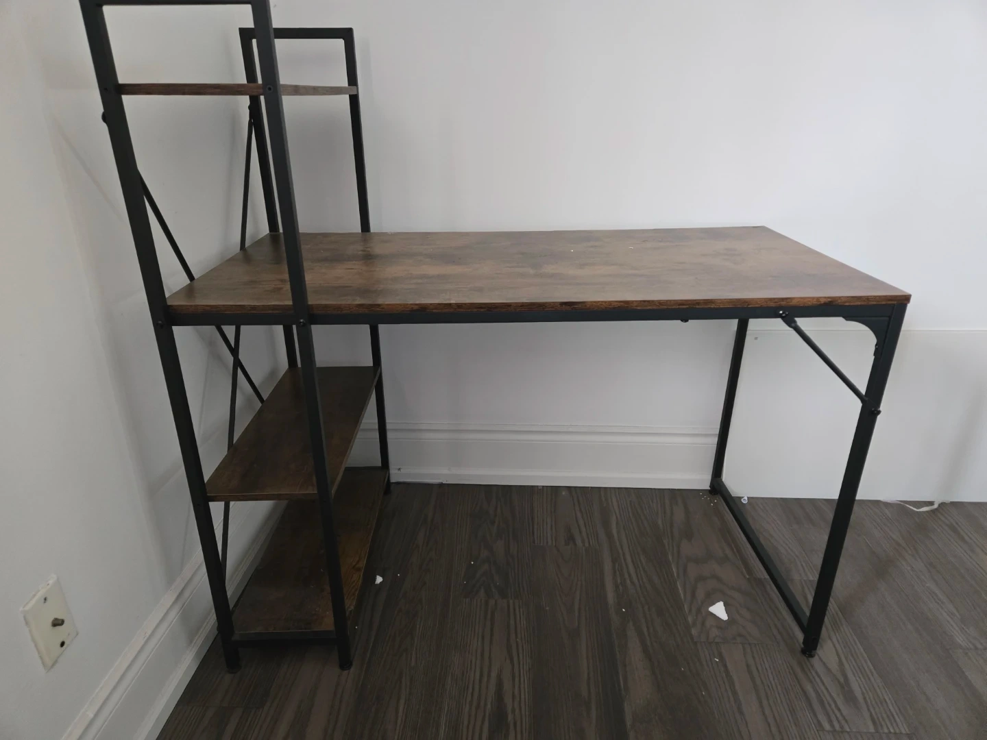Selling a FDW computer desk with shelves. It's in good condition and perfect for a home office or student. The desk has a vintage look with a black metal frame and wood-look top. Dimensions are approximately 48 x 24 inches.