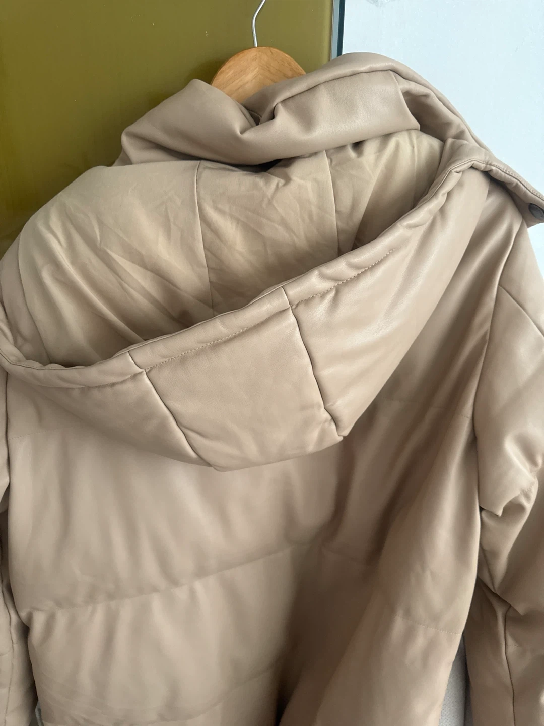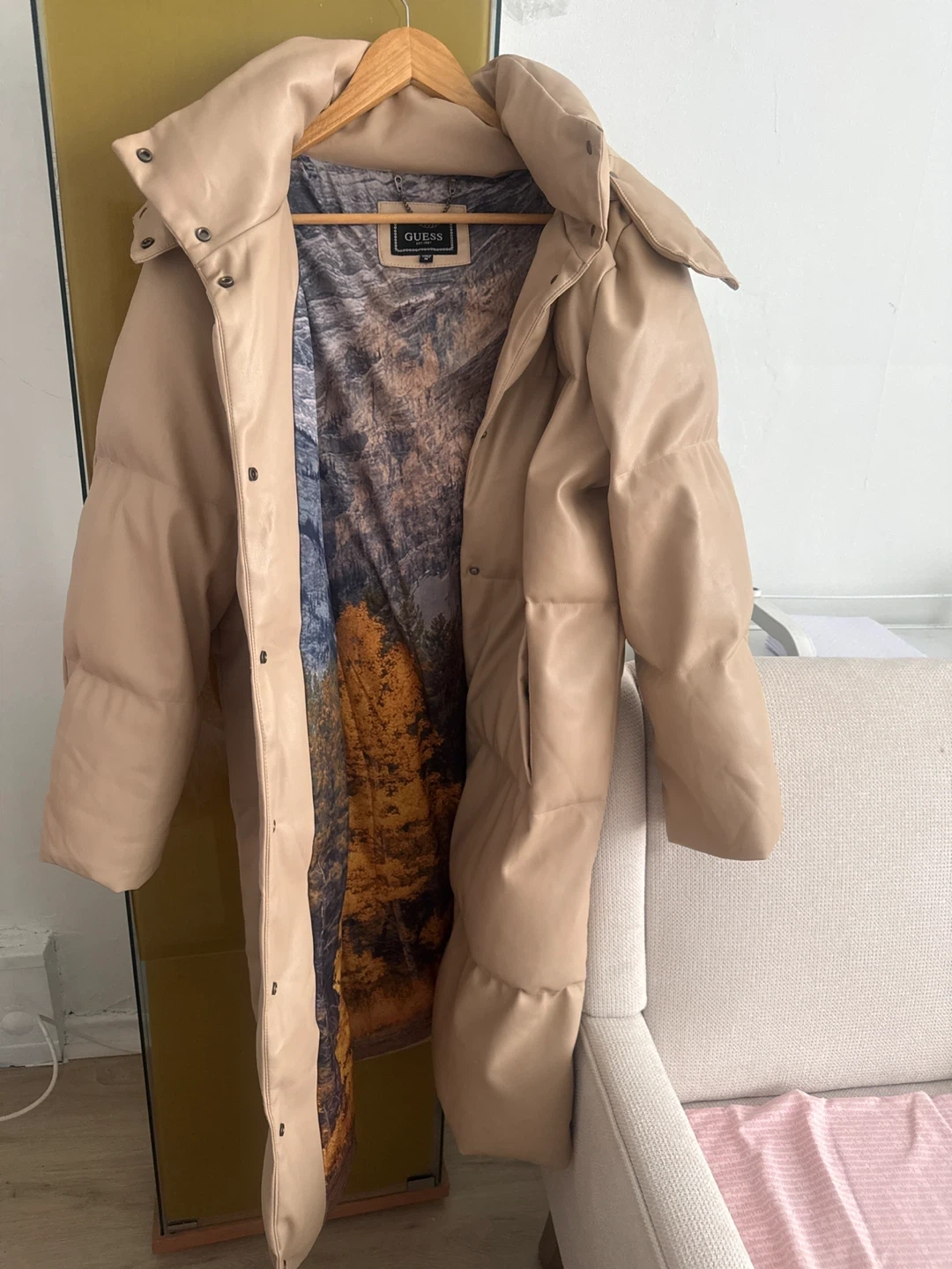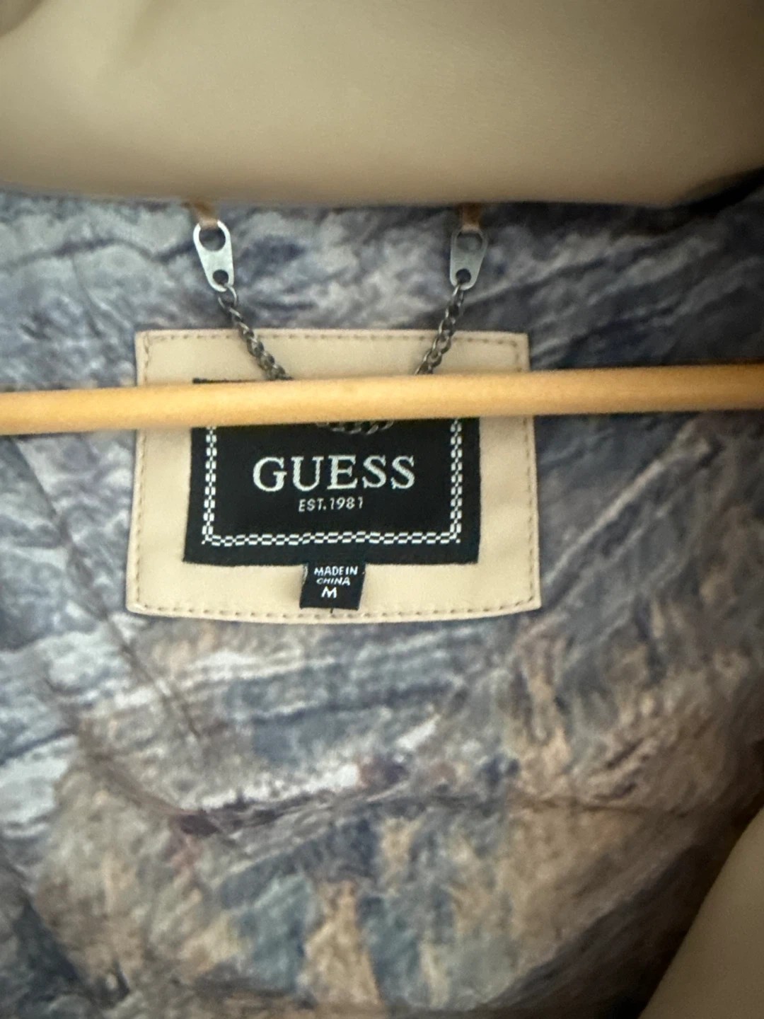 This is a beige Guess puffer jacket with a unique printed lining. It's a size medium. This jacket offers warmth and style for cooler weather!