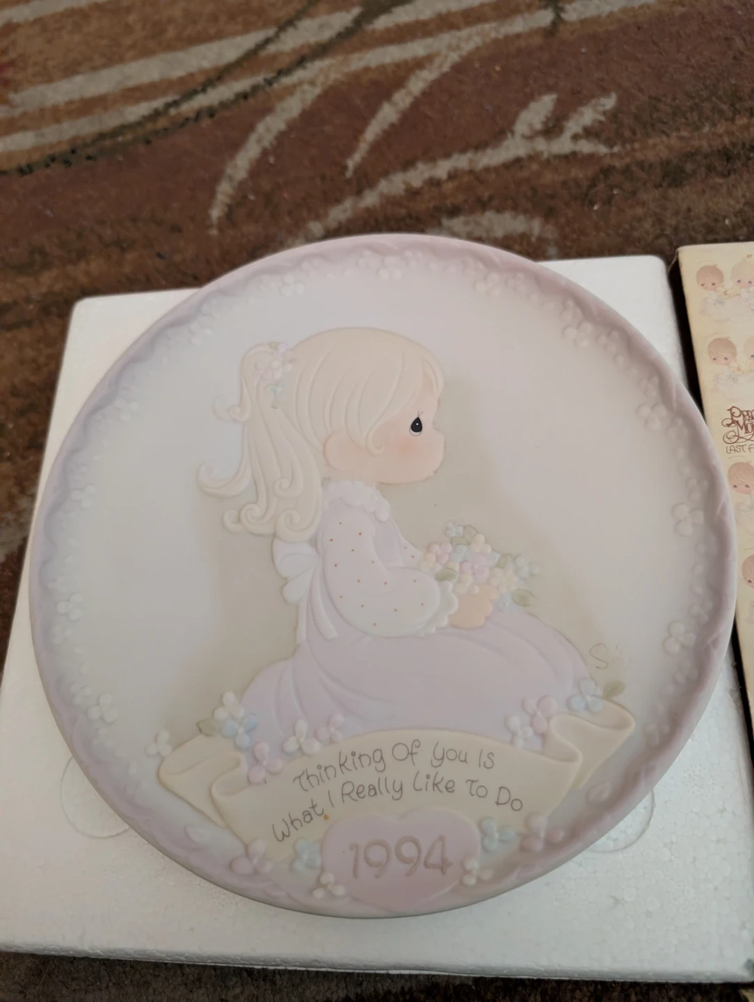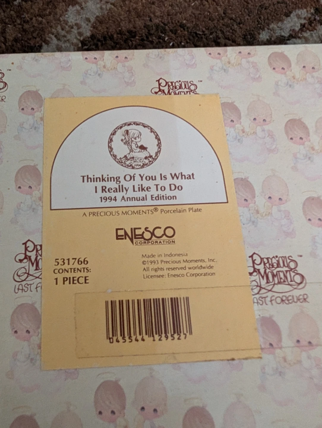 This is the 1994 Annual Edition Precious Moments Porcelain Plate. It's titled "Thinking Of You Is What I Really Like To Do". Made by Enesco Corporation.