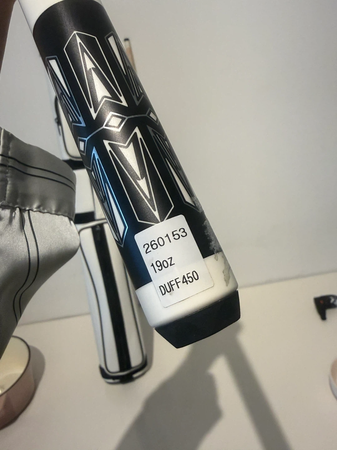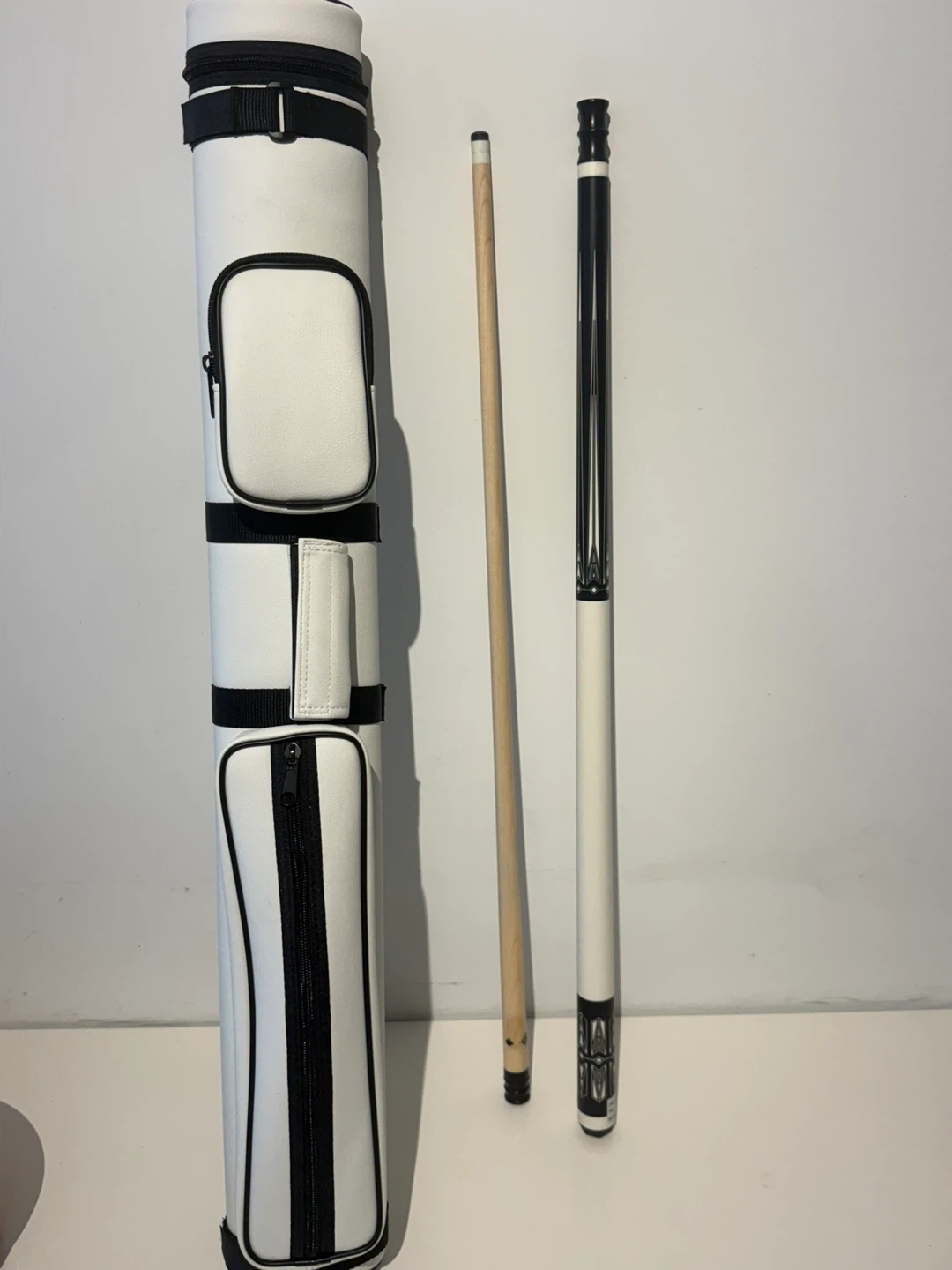 This set includes one billiard cue stick with a black and white design and a white carrying case with black trim. The cue stick is 19oz and is labelled "DUFF450". It's ready for the pool table!