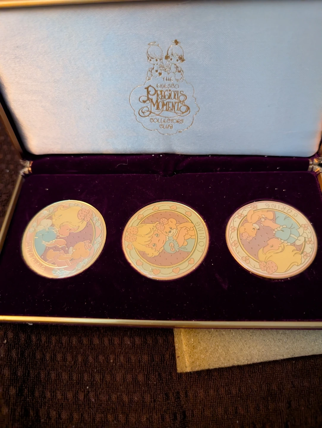Three Enesco Precious Moments collector's club medallions are included in this set. Each medallion features a unique Precious Moments design. They come displayed in a protective collector's box.