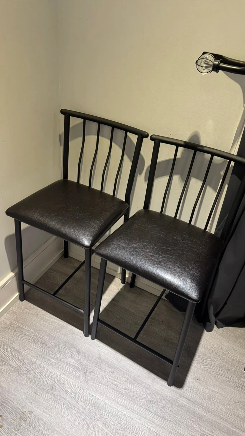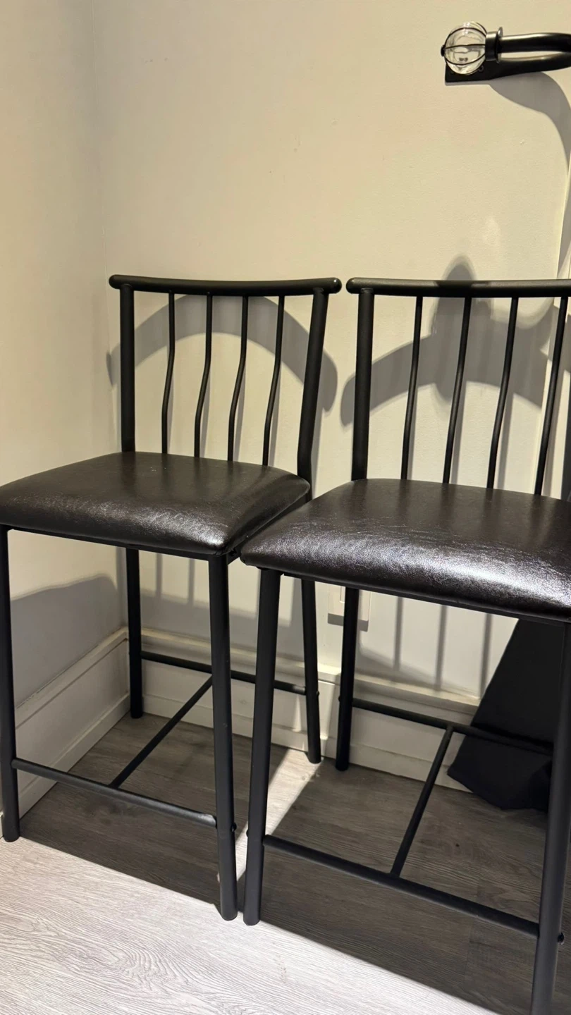 Two counter height stools with black metal frames and dark faux leather seats. These stools are great for a kitchen island or bar area. They're sturdy and ready for a new home!