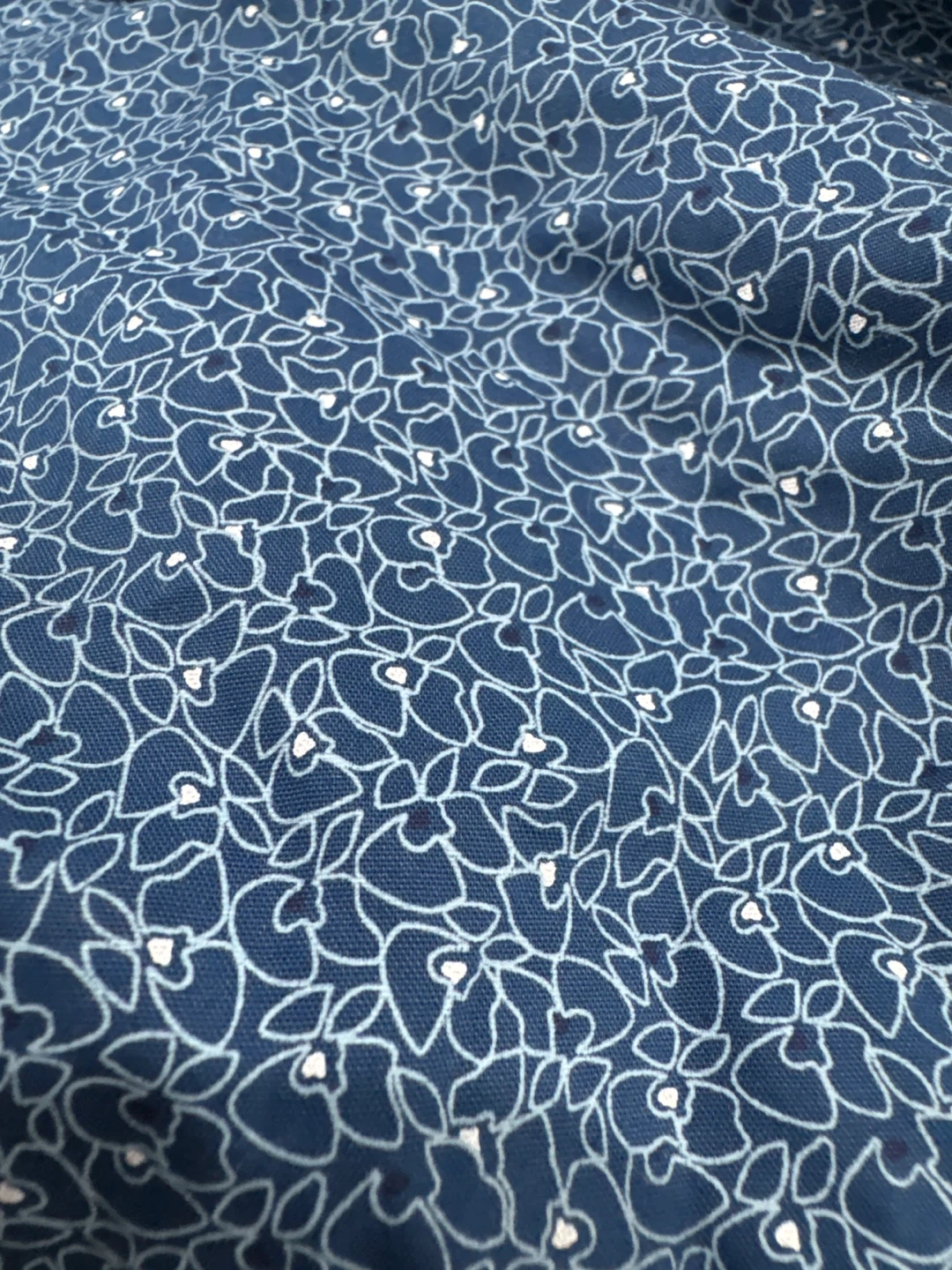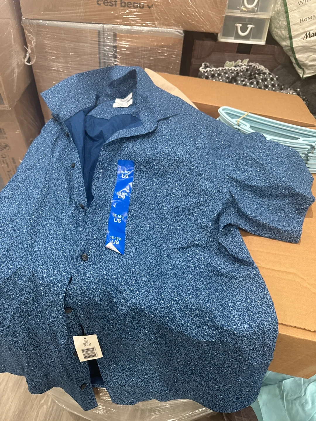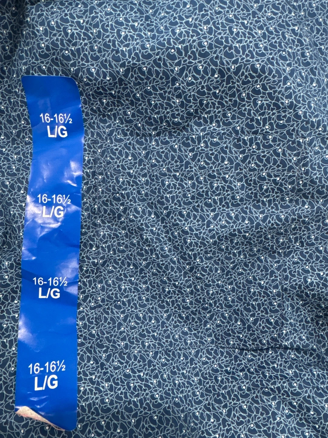 Calvin Klein dress shirt in a blue floral print. It's a regular fit, stretch, and wrinkle-resistant fabric. Made in Bangladesh. Size L/G (16-16.5 inches neck).