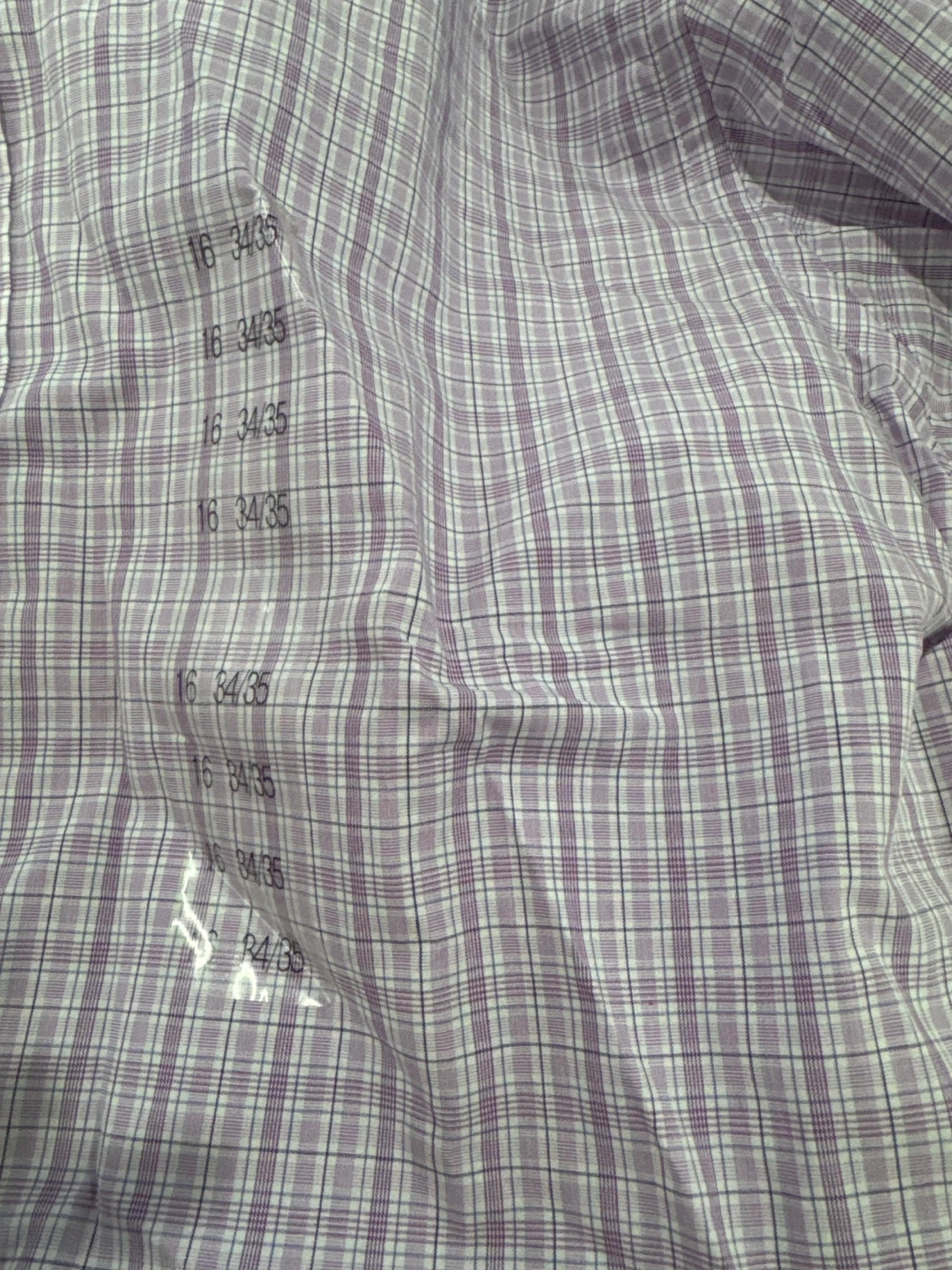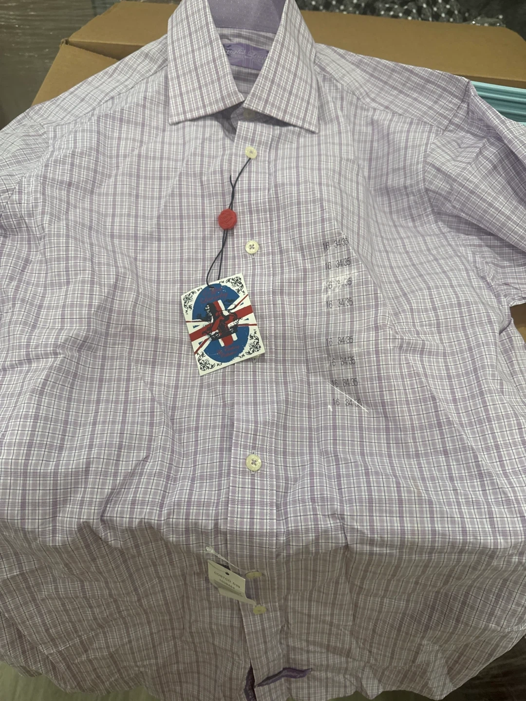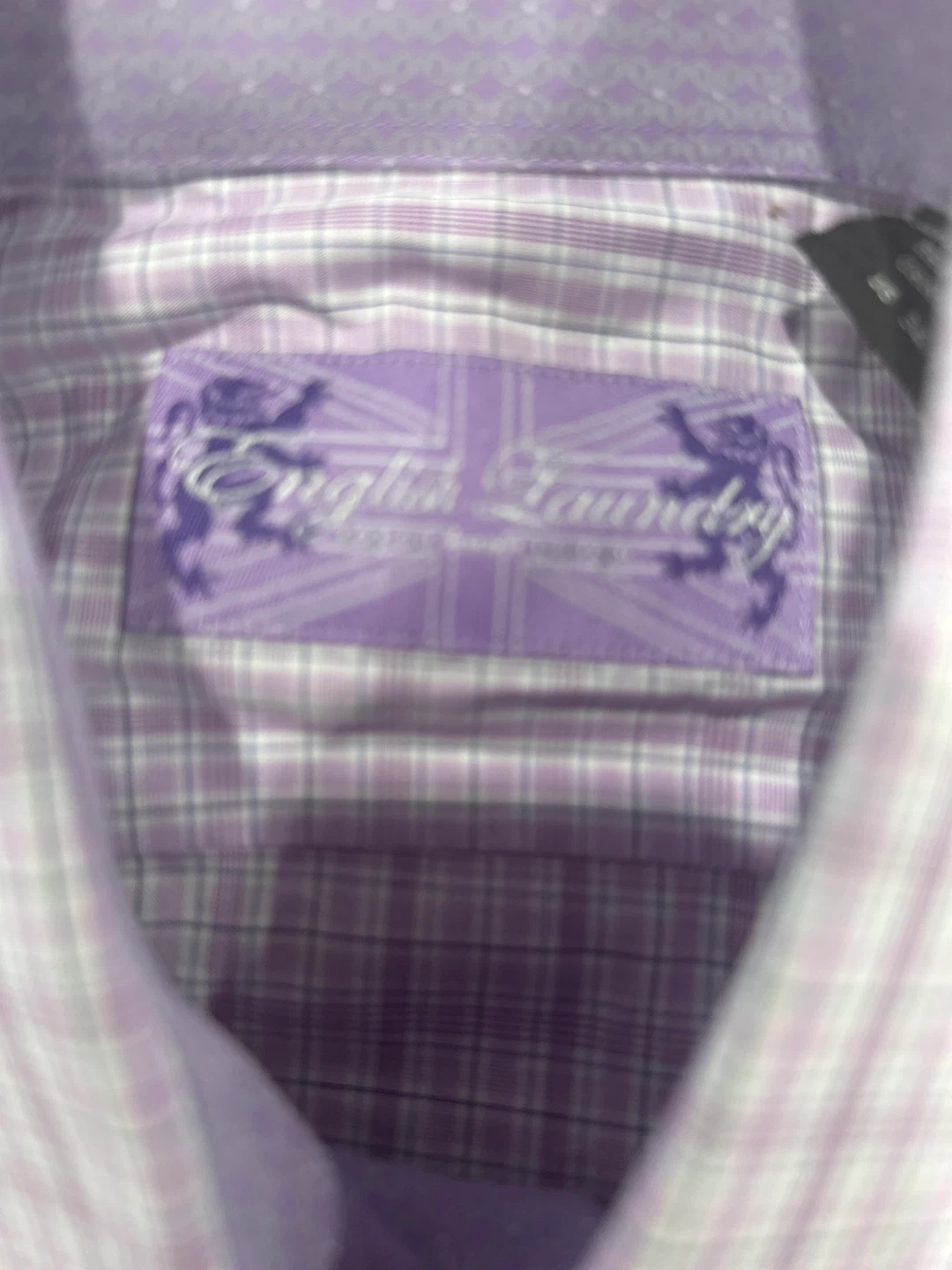This is an English Laundry men's dress shirt in a purple plaid pattern. It's a size 16 with a 34/35 sleeve length. The shirt features a button-down front and a collared neckline.