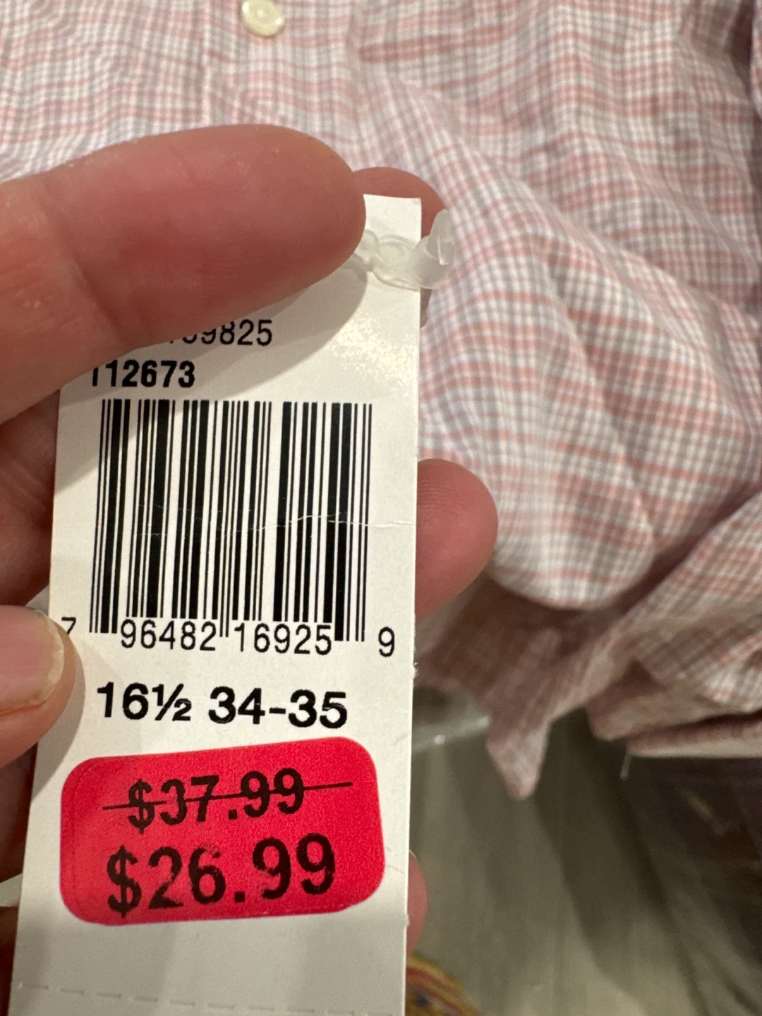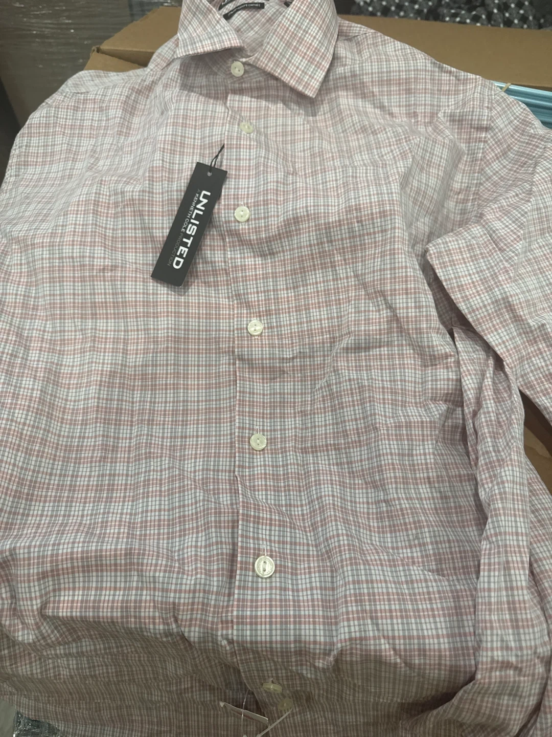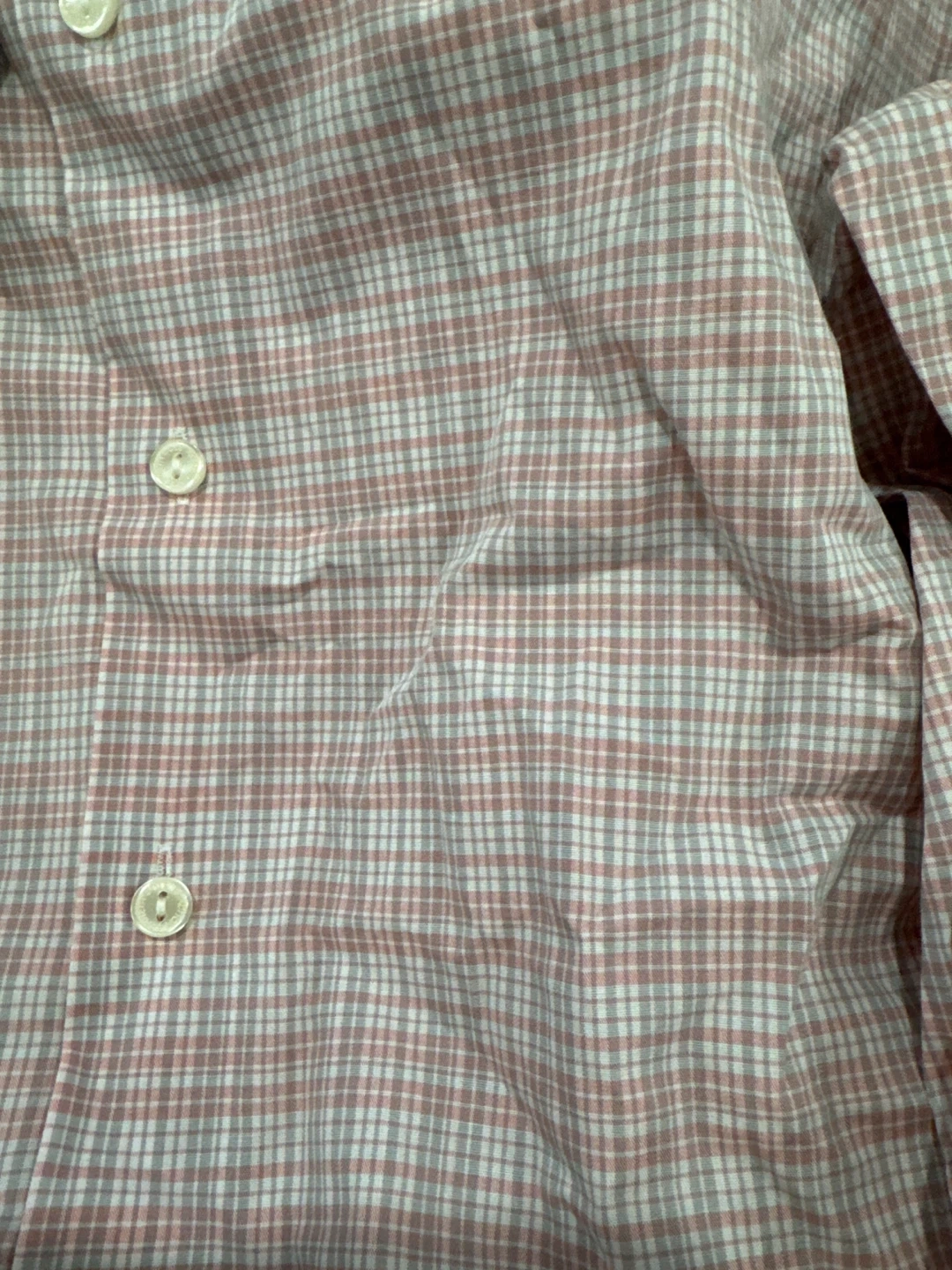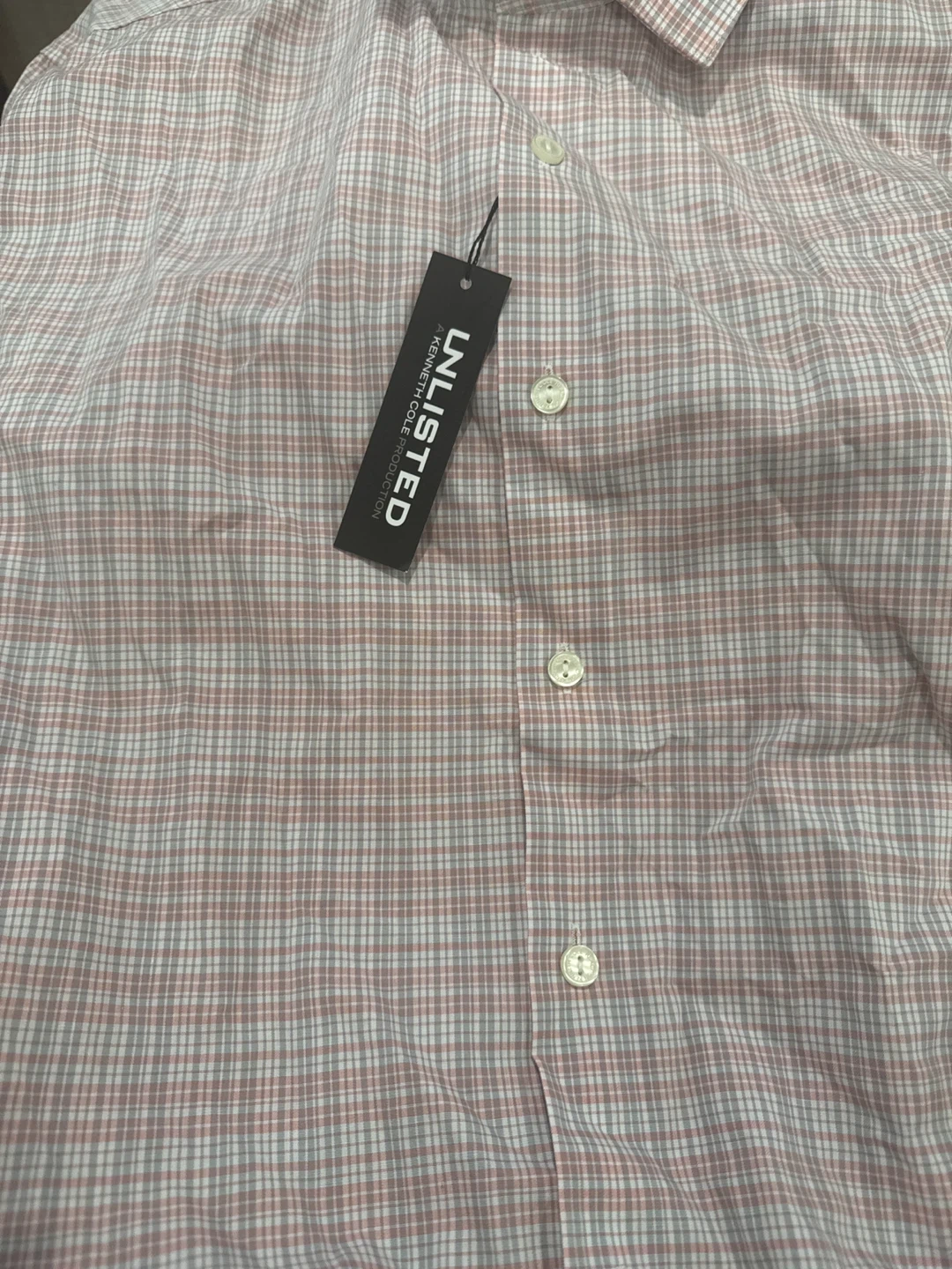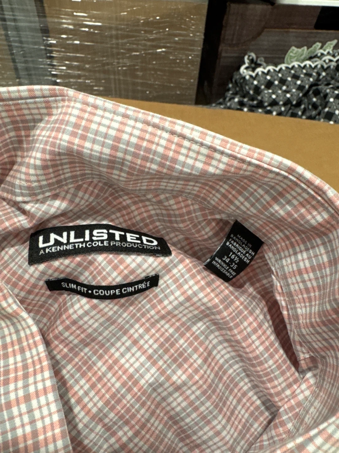 Unlisted by Kenneth Cole men's dress shirt in a pink and grey plaid pattern. It's a slim fit style with a 16 1/2 size collar and 34-35 sleeve length. This shirt is great for everyday wear or business casual settings!