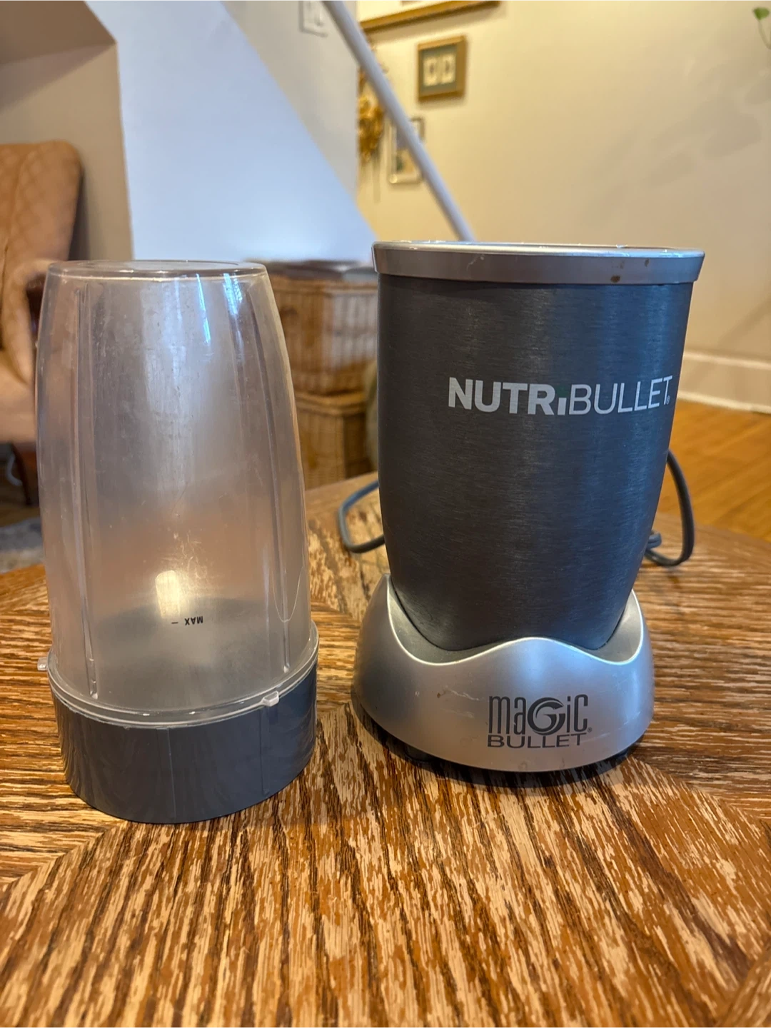 Magic Bullet NutriBullet blender base with one clear cup. This compact blender is great for making smoothies and single-serving drinks. It's made of durable plastic and metal components.